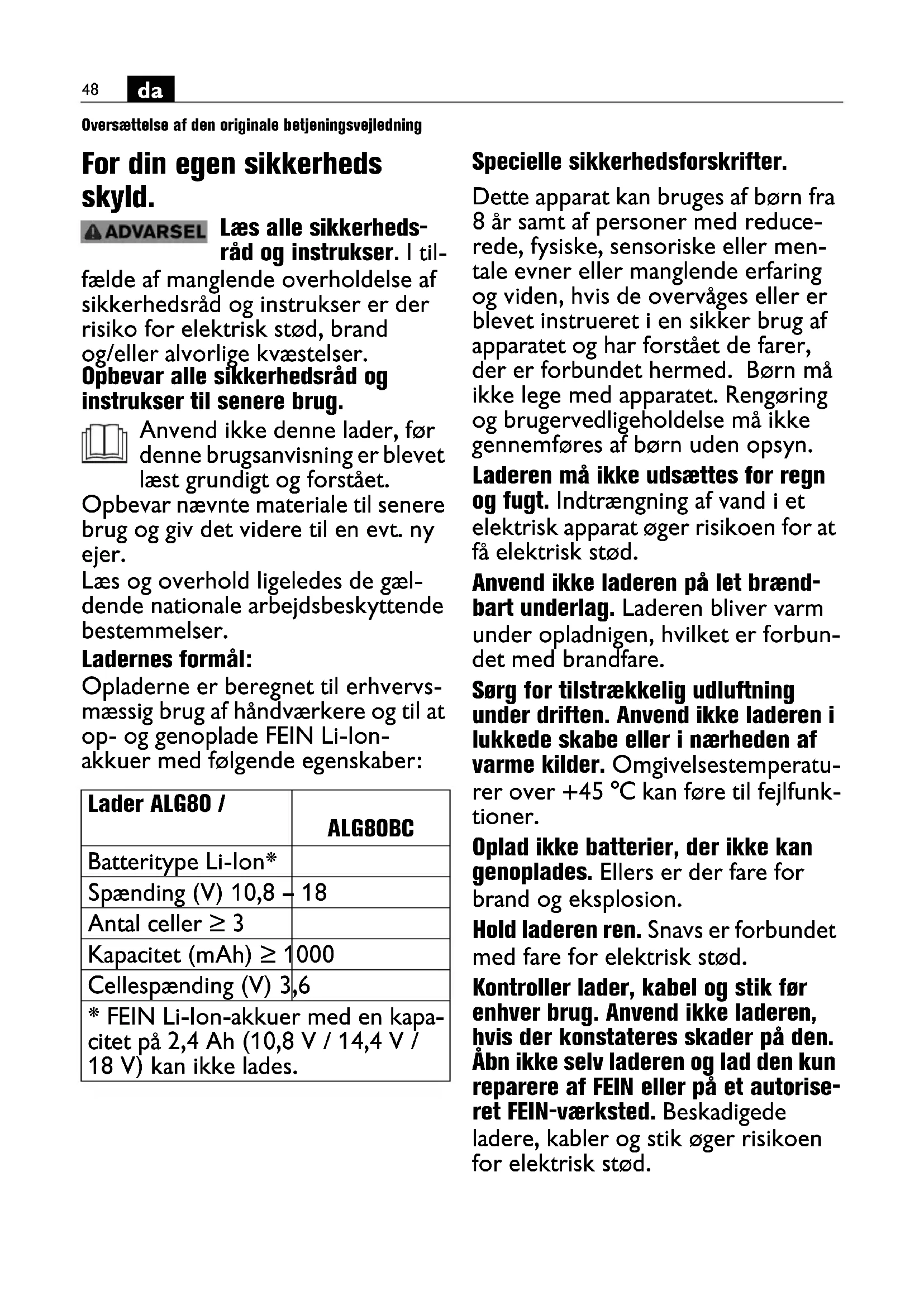 Lad kun intakte originale FEIN akkuer, der er beregnet til dit elværktøj. Opladning af forkerte, beskadigede eller reparerede akkuer, efterligninger og fremmede fabrika-ter er forbundet med fare for brand og/eller fare for eksplosion.