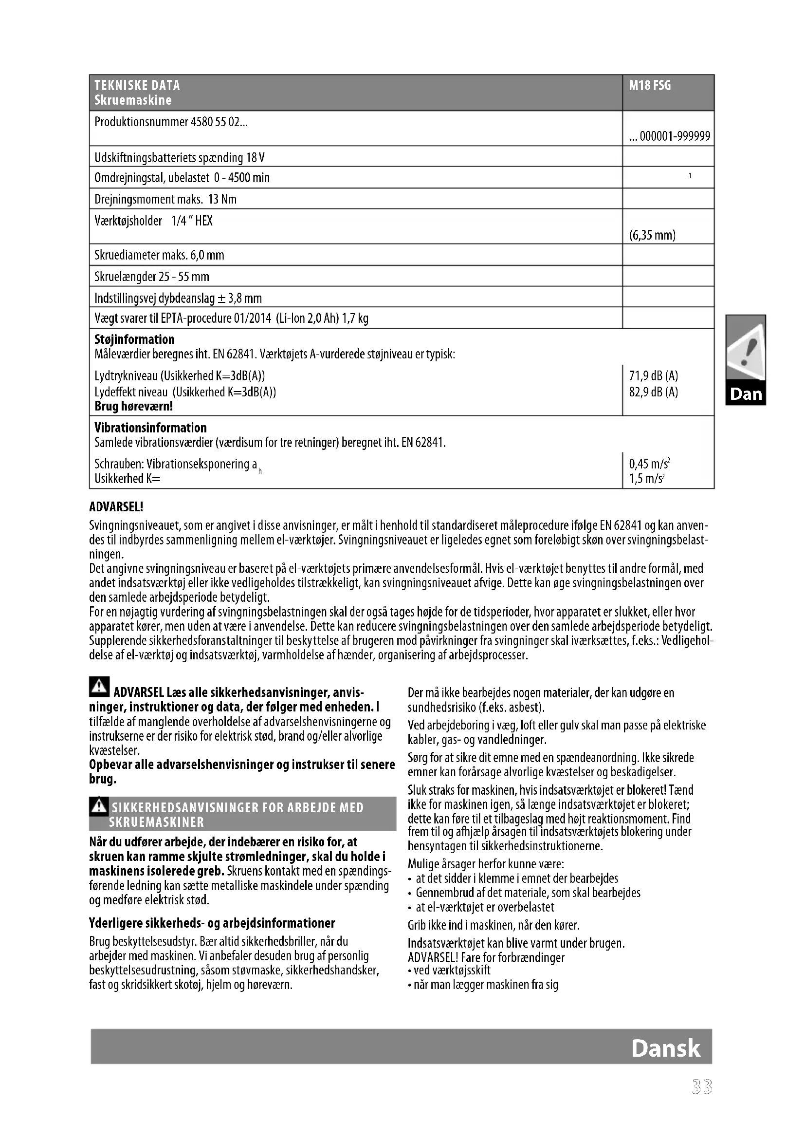 ADVARSEL! Svingningsniveauet, som er angivet i disse anvisninger, er målt i henhold til standardiseret måleprocedure ifølge EN 62841 og kan anven- des til indbyrdes sammenligning mellem el-værktøjer. Svingningsniveauet er ligeledes egnet som foreløbigt skøn over svingningsbelast- ningen. Det angivne svingningsniveau er baseret på el-værktøjets primære anvendelsesformål. Hvis el-værktøjet benyttes til andre formål, med andet indsatsværktøj eller ikke vedligeholdes tilstrækkeligt, kan svingningsniveauet afvige. Dette kan øge svingningsbelastningen over den samlede arbejdsperiode betydeligt. For en nøjagtig vurdering af svingningsbelastningen skal der også tages højde for de tidsperioder, hvor apparatet er slukket, eller hvor apparatet kører, men uden at være i anvendelse. Dette kan reducere svingningsbelastningen over den samlede arbejdsperiode betydeligt. Supplerende sikkerhedsforanstaltninger til beskyttelse af brugeren mod påvirkninger fra svingninger skal iværksættes, f.eks.: Vedligehol- delse af el-værktøj og indsatsværktøj, varmholdelse af hænder, organisering af arbejdsprocesser. ADVARSEL Læs alle sikkerhedsanvisninger, anvis- ninger, instruktioner og data, der følger med enheden. I tilfælde af manglende overholdelse af advarselshenvisningerne og instrukserne er der risiko for elektrisk stød, brand og/eller alvorlige kvæstelser. Opbevar alle advarselshenvisninger og instrukser til senere brug.