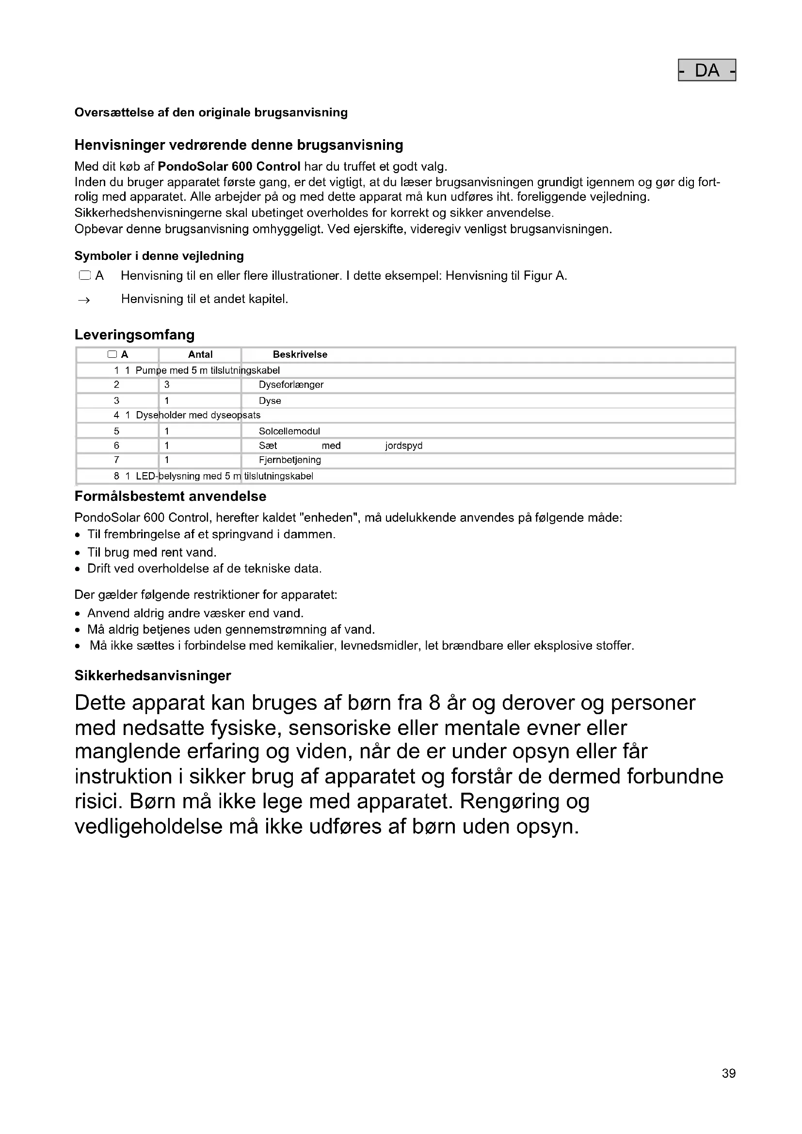 Henvisninger vedrørende denne brugsanvisning Med dit køb af PondoSolar 600 Control har du truffet et godt valg. Inden du bruger apparatet første gang, er det vigtigt, at du læser brugsanvisningen grundigt igennem og gør dig fort- rolig med apparatet. Alle arbejder på og med dette apparat må kun udføres iht. foreliggende vejledning. Sikkerhedshenvisningerne skal ubetinget overholdes for korrekt og sikker anvendelse. Opbevar denne brugsanvisning omhyggeligt. Ved ejerskifte, videregiv venligst brugsanvisningen.