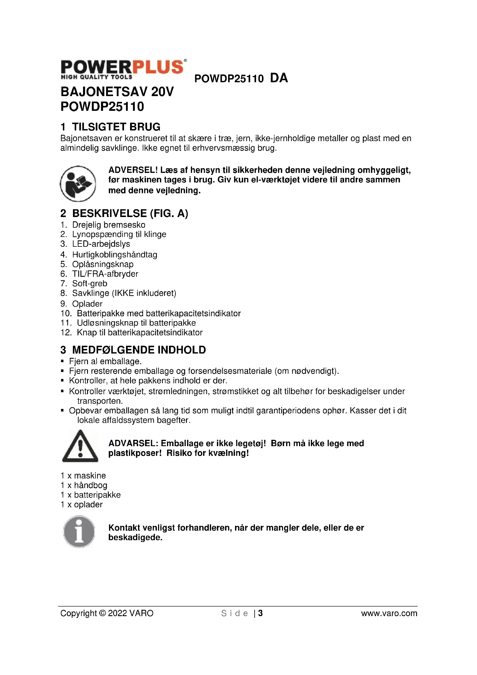 - Rengør og gem saven indendørs og uden for børns rækkevidde.POWDP25110 DA Copyright © 2022 VARO S i d e | 10 www.varo.com