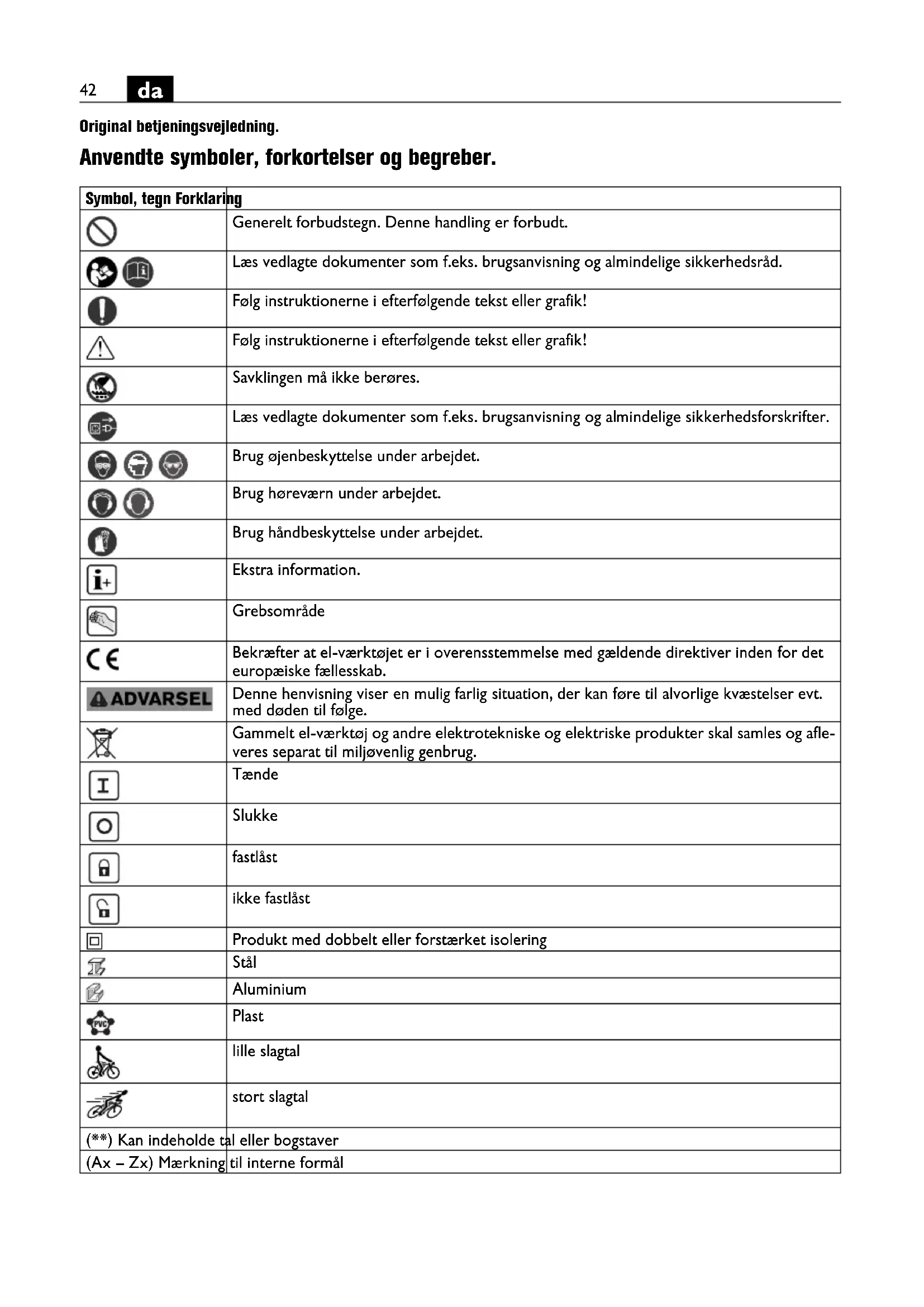 For din egen sikkerheds skyld. Læs alle sikkerhedsråd og instruk- ser. I tilfælde af manglende over- holdelse af sikkerhedsråd og instrukser er der risiko for elektrisk stød, brand og/eller alvorlige kvæstelser. Opbevar alle sikkerhedsråd og instrukser til senere brug. Anvend ikke dette el-værktøj, før du har læst nærværende brugsanvisning samt vedlagte „Almindelige sikkerhedsråd“ (skriftnummer 3 41 30 465 06 0) nøje igennem og forstået det hele. Opbevar nævnte materiale til senere brug og giv det videre til en evt. ny ejer. Læs og overhold ligeledes de gældende nationale arbejdsbeskyttende bestemmelser. El-værktøjets formål: håndført frem- og tilbagegående sav til brug med det af FEIN tilladte tilbehør i vejrbeskyttede omgivelser til savning i runde emner og emner i andre former af metal, plast og cement. Dette el-værktøj er også beregnet til brug sammen med vekselstrømgeneratorer med tilstrækkelig ydelse, der svarer til standard ISO 8528, udførelsesklasse G2. Bestemmelserne i denne standard overholdes især ikke, hvis den såkaldte THD overskrider 10 %. Er du i tvivl, læses og overholdes informationsmaterialet til den generator, du bruger. Specielle sikkerhedsforskrifter. Hold fast i el-værktøjets isolerede gribeflader, når arbejde udføres, hvor tilbehøret kan ramme skjulte strømledninger eller sin egen tilslutningsledning. Kon- takt med en spændingsførende ledning kan også sætte maskinens metaldele under spænding og give elektrisk stød. Sørg for at fastgøre og sikre arbejdsemnet med tvinger eller på anden måde til et stabilt underlag. Hvis du kun holder fast i emnet med hånden eller holder det ind mod kroppen, er det stadig labilt, så du kan miste kon- trollen over det. Hold dine hænder væk fra savklingen. Stik ikke fingrene ind foran eller ned under savklingen. Kontakt med sav- klingen kan føre til kvæstelser. Savklingen kan blive meget varm under savningen. Brug personligt beskyttelsesudstyr. Brug helmaske til ansigtet, øjenværn eller beskyttelsesbriller, afhængigt af det udførte arbejde. Brug afhængigt af arbejdets art støvmaske, høreværn, beskyttelseshandsker eller spe- cialforklæde, der beskytter dig mod små slibe- og materialepartikler. Øjnene skal beskyttes mod frem- mede genstande, der flyver rundt i luften og som opstår i forbindelse med forskelligt arbejde. Støv- eller ånde- drætsmaske skal filtrere det støv, der opstår under arbejdet. Udsættes du for høj støj i længere tid, kan du lide høretab. Sikre emnet. Et emne, der holdes med en spændean- ordning, holdes mere sikkert end i hånden. Tegn Enhed international Enhed national Forklaring