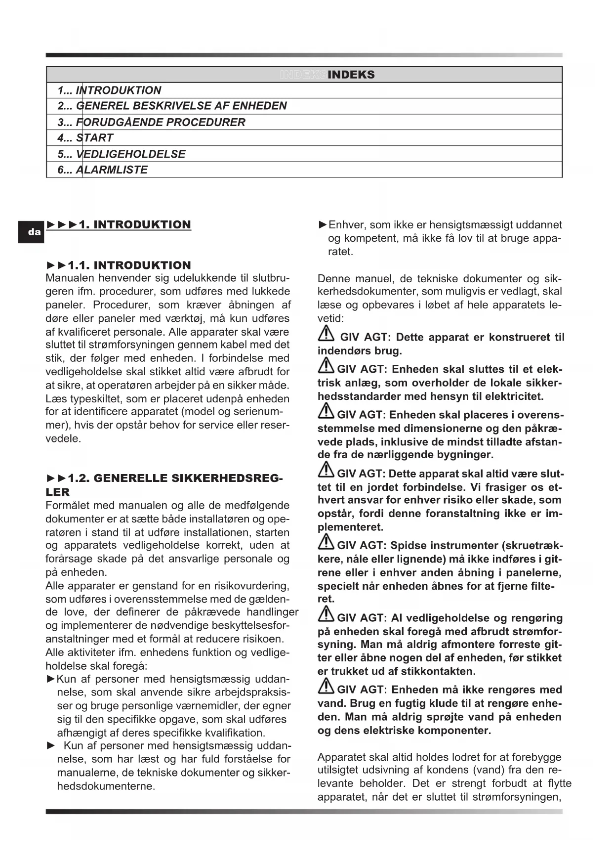 4... START 5... VEDLIGEHOLDELSE 6... ALARMLISTE ►►►1. INTRODUKTION ►►1.1. INTRODUKTION Manualen henvender sig udelukkende til slutbru- geren ifm. procedurer, som udføres med lukkede paneler. Procedurer, som kræver åbningen af døre eller paneler med værktøj, må kun udføres af kvaliceret personale. Alle apparater skal være sluttet til strømforsyningen gennem kabel med det stik, der følger med enheden. I forbindelse med vedligeholdelse skal stikket altid være afbrudt for at sikre, at operatøren arbejder på en sikker måde. Læs typeskiltet, som er placeret udenpå enheden for at identicere apparatet (model og serienum- mer), hvis der opstår behov for service eller reser- vedele. ►►1.2. GENERELLE SIKKERHEDSREG- LER Formålet med manualen og alle de medfølgende dokumenter er at sætte både installatøren og ope- ratøren i stand til at udføre installationen, starten og apparatets vedligeholdelse korrekt, uden at forårsage skade på det ansvarlige personale og på enheden. Alle apparater er genstand for en risikovurdering, som udføres i overensstemmelse med de gælden- de love, der denerer de påkrævede handlinger og implementerer de nødvendige beskyttelsesfor- anstaltninger med et formål at reducere risikoen. Alle aktiviteter ifm. enhedens funktion og vedlige- holdelse skal foregå: ►Kun af personer med hensigtsmæssig uddan- nelse, som skal anvende sikre arbejdspraksis- ser og bruge personlige værnemidler, der egner sig til den specikke opgave, som skal udføres afhængigt af deres specikke kvalikation. ► Kun af personer med hensigtsmæssig uddan- nelse, som har læst og har fuld forståelse for manualerne, de tekniske dokumenter og sikker- hedsdokumenterne. ►Enhver, som ikke er hensigtsmæssigt uddannet og kompetent, må ikke få lov til at bruge appa- ratet. Denne manuel, de tekniske dokumenter og sik- kerhedsdokumenter, som muligvis er vedlagt, skal læse og opbevares i løbet af hele apparatets le- vetid: GIV AGT: Dette apparat er konstrueret til indendørs brug. GIV AGT: Enheden skal sluttes til et elek- trisk anlæg, som overholder de lokale sikker- hedsstandarder med hensyn til elektricitet. GIV AGT: Enheden skal placeres i overens- stemmelse med dimensionerne og den påkræ- vede plads, inklusive de mindst tilladte afstan- de fra de nærliggende bygninger. GIV AGT: Dette apparat skal altid være slut- tet til en jordet forbindelse. Vi frasiger os et- hvert ansvar for enhver risiko eller skade, som opstår, fordi denne foranstaltning ikke er im- plementeret. GIV AGT: Spidse instrumenter (skruetræk- kere, nåle eller lignende) må ikke indføres i git- rene eller i enhver anden åbning i panelerne, specielt når enheden åbnes for at fjerne lte- ret. GIV AGT: Al vedligeholdelse og rengøring på enheden skal foregå med afbrudt strømfor- syning. Man må aldrig afmontere forreste git- ter eller åbne nogen del af enheden, før stikket er trukket ud af stikkontakten. GIV AGT: Enheden må ikke rengøres med vand. Brug en fugtig klude til at rengøre enhe- den. Man må aldrig sprøjte vand på enheden og dens elektriske komponenter. Apparatet skal altid holdes lodret for at forebygge utilsigtet udsivning af kondens (vand) fra den re- levante beholder. Det er strengt forbudt at ytte apparatet, når det er sluttet til strømforsyningen,