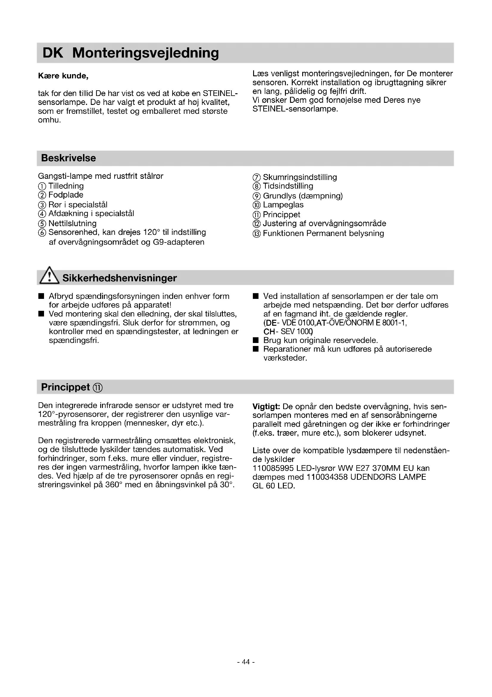 Gäller endast EU-länder: Enligt det gällande europeiska direktivet om uttjänta elektriska och elektroniska apparater och dess omsättning i nationell lagstiftning, måste uttjänta elapparater lämnas in till miljövänlig återvinning. Ljuskällan kan bytas ut av slutkonsumenten. SE- 44 - Princippet 햽 Den integrerede infrarøde sensor er udstyret med tre 120°-pyrosensorer, der registrerer den usynlige var- mestråling fra kroppen (mennesker, dyr etc.). Den registrerede varmestråling omsættes elektronisk, og de tilsluttede lyskilder tændes automatisk. Ved forhindringer, som f.eks. mure eller vinduer, registre- res der ingen varmestråling, hvorfor lampen ikke tæn- des. Ved hjælp af de tre pyrosensorer opnås en regi- streringsvinkel på 360° med en åbningsvinkel på 30°. Beskrivelse Gangsti-lampe med rustfrit stålrør 햲 Tilledning 햳 Fodplade 햴 Rør i specialstål 햵 Afdækning i specialstål 햶 Nettilslutning 햷 Sensorenhed, kan drejes 120° til indstilling af overvågningsområdet og G9-adapteren DK Monteringsvejledning Kære kunde, tak for den tillid De har vist os ved at købe en STEINEL- sensorlampe. De har valgt et produkt af høj kvalitet, som er fremstillet, testet og emballeret med største omhu. Sikkerhedshenvisninger n Afbryd spændingsforsyningen inden enhver form for arbejde udføres på apparatet! n Ved montering skal den elledning, der skal tilsluttes, være spændingsfri. Sluk derfor for strømmen, og kontroller med en spændingstester, at ledningen er spændingsfri. Læs venligst monteringsvejledningen, før De monterer sensoren. Korrekt installation og ibrugttagning sikrer en lang, pålidelig og fejlfri drift. Vi ønsker Dem god fornøjelse med Deres nye STEINEL-sensorlampe. n Ved installation af sensorlampen er der tale om arbejde med netspænding. Det bør derfor udføres af en fagmand iht. de gældende regler.