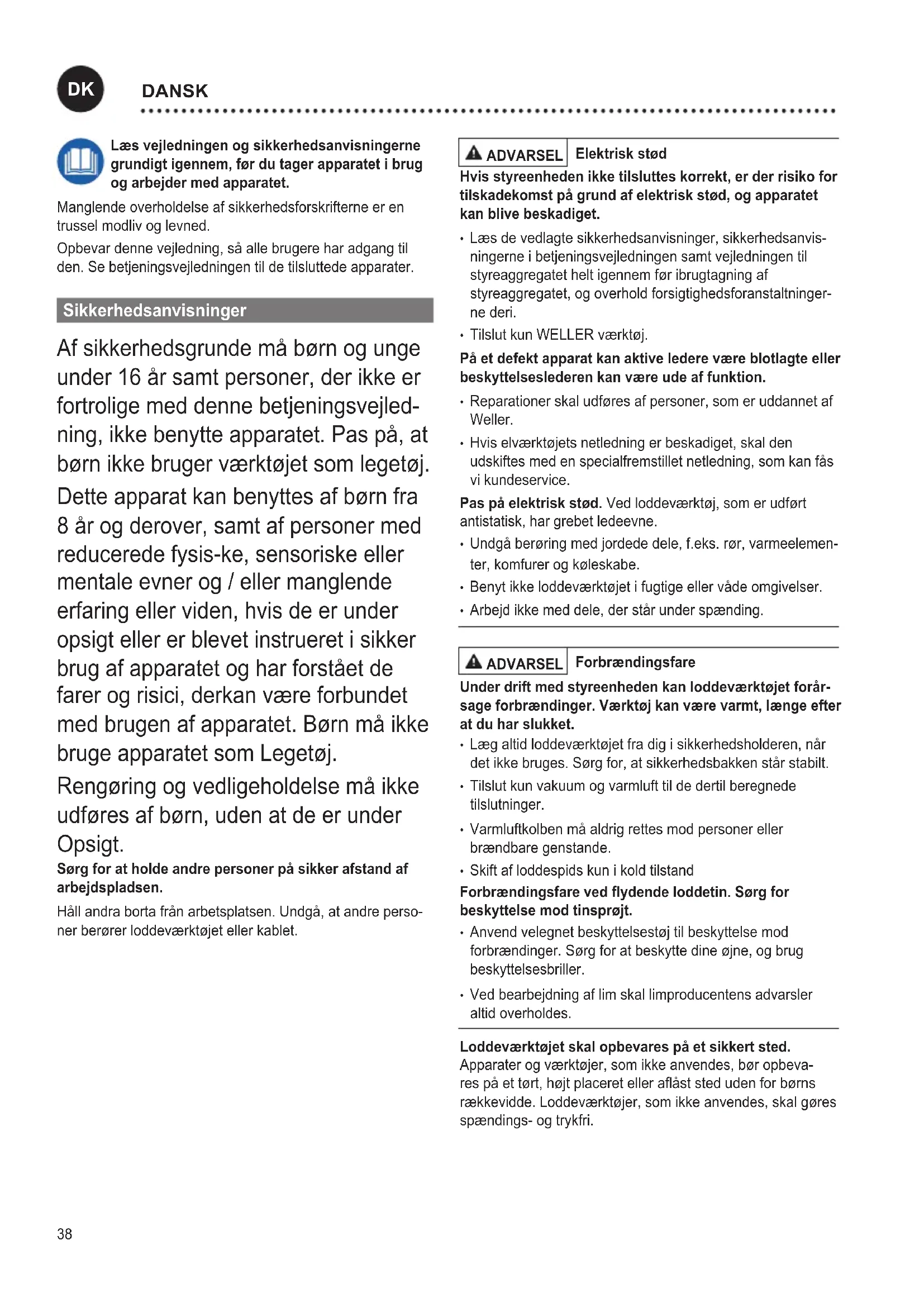 SVENSKA38 Læs vejledningen og sikkerhedsanvisningerne grundigt igennem, før du tager apparatet i brug og arbejder med apparatet. Manglende overholdelse af sikkerhedsforskrifterne er en trussel modliv og levned. Opbevar denne vejledning, så alle brugere har adgang til den. Se betjeningsvejledningen til de tilsluttede apparater. Sikkerhedsanvisninger Af sikkerhedsgrunde må børn og unge under 16 år samt personer, der ikke er fortrolige med denne betjeningsvejled- ning, ikke benytte apparatet. Pas på, at børn ikke bruger værktøjet som legetøj. Dette apparat kan benyttes af børn fra 8 år og derover, samt af personer med reducerede fysis-ke, sensoriske eller mentale evner og / eller manglende erfaring eller viden, hvis de er under opsigt eller er blevet instrueret i sikker brug af apparatet og har forstået de farer og risici, derkan være forbundet med brugen af apparatet. Børn må ikke bruge apparatet som Legetøj. Rengøring og vedligeholdelse må ikke udføres af børn, uden at de er under Opsigt. Sørg for at holde andre personer på sikker afstand af arbejdspladsen. Håll andra borta från arbetsplatsen. Undgå, at andre perso- ner berører loddeværktøjet eller kablet. ADVARSEL Elektrisk stød Hvis styreenheden ikke tilsluttes korrekt, er der risiko for tilskadekomst på grund af elektrisk stød, og apparatet kan blive beskadiget.