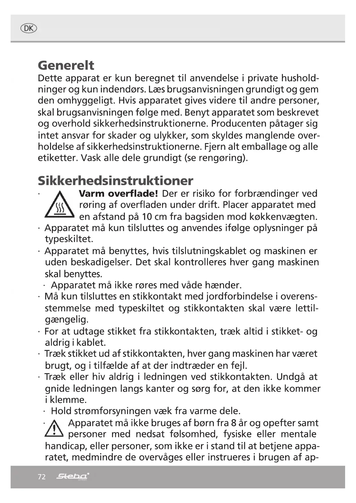 ∙ Benyt aldrig apparatet efter en fejlfunktion, fx hvis den er fal- det ned eller på anden måde blevet beskadiget. ∙ Producenten påtager sig intet ansvar for skader på grund af forkert anvendelse af grillen som følge af manglende overhol- delse af instruktionerne i brugsanvisningen. ∙ For at undgå farlige situationer må eventuelle reparationer af grillen kun udføres af et serviceværksted. Der må kun anvendes originale reservedele. ∙ Apparatet bliver varmt, må kun transporteres efter afkøling. ∙ Apparatet må kun bruges til de formål, der er beskrevet i bru- germanualen. ∙ Indsæt ingen materialer som papir, pap, plastik osv. i apparatet. ∙ Dette apparat er beregnet til brug i husholdnings- og af: o personale køkkenområder i butikker, kontorer og andre arbejdsmiljøer o af kunder i hoteller, moteller og andre boliger type mil- jøer o bed and break fast miljøer74 ∙ Inden første anvendelse: Alle dele- undtaget varmeele- mentet- rengøres grundigt og tørres derefter. For at fjerne lugten af „ny apparat“, opvarmes apparatet i ca. 15 min. ∙ Forsigtig! Apparatet bliver varmt. Fare for for- brændinger! Under anvendelse kan temperaturen på overfladen blive meget varm! Apparatet placeres på en jævn, varmebestandig overflade og placeres ca. 70 cm fra brandbare materialer (f.eks. gardiner). ∙ Under anvendelse opstår varmt damp. Hold hænder og ansigt på afstand. ∙ Ved brug af et forlængerkabel skal det have et tværsnit på 1,5 mm². Ledningen på en kabeltromle altid være rullet helt ud. ∙ Ved anvendelse af et GS- godkendt 16 A multi forlængerkabel, må denne ikke belastes med mere end 3680 watt. Der er fare for brand! ∙ Vær opmærksom på, at børn ikke trækker i kablet og at ingen snubler over kablet. ∙ Apparatet skal altid afbrydes fra elnettet, hvis tilsyn ikke er til stede, og inden montering, demontering eller rengøring. ∙ Hygiejne: Grundet bakterier og mug, er det vigtigt, at appara- tet altid rengøres! Rengøring ∙ Advarsel! Inden hver rengøring skal stikket udtages fra stikkontakten og apparatet skal afkøle! ∙ Apparatet må ikke nedsænkes i vand. ∙ Rengør alle indre metal dele og yderside med en fugtig klud, sæbe og vand. Lad alt tørre efter. ∙ Rengør brødbakken med en blød fugtig klud. Brug ikke stærke eller skrubbende rengøringsmidler, kemiske middler, sku- rebørste eller lign..75 Placering af apparatet Vigtig Placer aldrig apparatet på eller ved siden af en varm overflade (f.eks. kogeplade), men kun på en jævn, stabil og varmebestan- dig bordskåner. Det er altid vigtigt at sikre, at der ikke er brænd- bare genstande i nærheden. Placer ikke enheden på kanten af bordet, så børn ikke kan komme til den, og for at den ikke falder ned ved berøring.