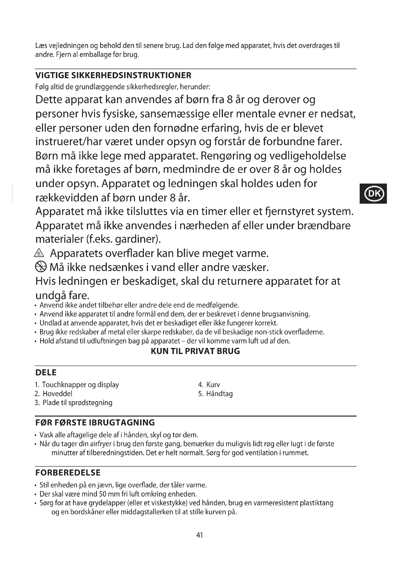 - Når du tager din airfryer i brug den første gang, bemærker du muligvis lidt røg eller lugt i de første minutter af tilberedningstiden. Det er helt normalt. Sørg for god ventilation i rummet. FORBEREDELSE