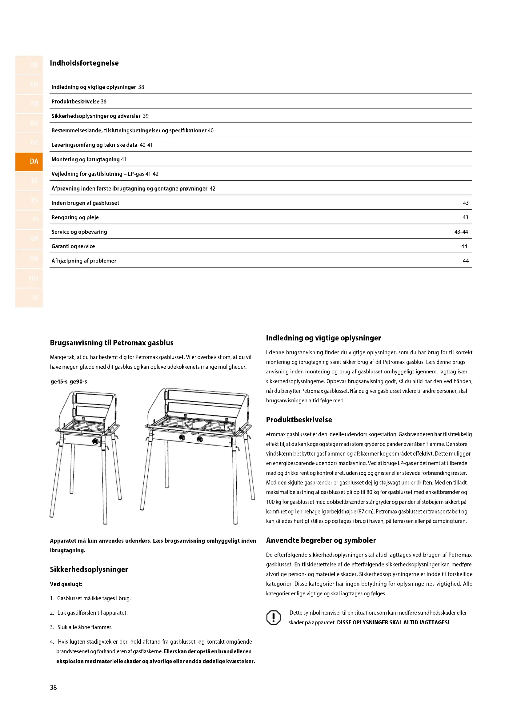 Hvis lugten stadigvæk er der, hold afstand fra gasblusset, og kontakt omgående brandvæsenet og forhandleren af gasflaskerne. Ellers kan der opstå en brand eller en eksplosion med materielle skader og alvorlige eller endda dødelige kvæstelser. ge45-s ge90-s Indholdsfortegnelse Indledning og vigtige oplysninger 38 Produktbeskrivelse 38 Sikkerhedsoplysninger og advarsler 39 Bestemmelseslande, tilslutningsbetingelser og specifikationer 40 Leveringsomfang og tekniske data 40 -41 Montering og ibrugtagning 41 Vejledning for gastilslutning – LP-gas 41-42 Afprøvning inden første ibrugtagning og gentagne prøvninger 42 Inden brugen af gasblusset 43 Rengøring og pleje 43 Service og opbevaring 43-44 Garanti og service 44 Afhjælpning af problemer 44 Indledning og vigtige oplysninger I denne brugsanvisning finder du vigtige oplysninger, som du har brug for til korrekt montering og ibrugtagning samt sikker brug af dit Petromax gasblus. Læs denne brugs- anvisning inden montering og brug af gasblusset omhyggeligt igennem. Iagttag især sikkerhedsoplysningerne. Opbevar brugsanvisning godt, så du altid har den ved hånden, når du benytter Petromax gasblusset. Når du giver gasblusset videre til andre personer, skal brugsanvisningen altid følge med. Produktbeskrivelse etromax gasblusset er den ideelle udendørs kogestation. Gasbrænderen har tilstrækkelig effekt til, at du kan koge og stege mad i store gryder og pander over åben flamme. Den store vindskærm beskytter gasflammen og afskærmer kogeområdet effektivt. Dette muliggør en energibesparende udendørs madlavning. Ved at bruge LP-gas er det nemt at tilberede mad og drikke rent og kontrolleret, uden røg og gnister eller støvede forbrændingsrester. Med den skjulte gasbrænder er gasblusset dejlig støjsvagt under driften. Med en tilladt maksimal belastning af gasblusset på op til 80 kg for gasblusset med enkeltbrænder og 100 kg for gasblusset med dobbeltbrænder står gryder og pander af støbejern sikkert på komfuret og i en behagelig arbejdshøjde (87 cm). Petromax gasblusset er transportabelt og kan således hurtigt stilles op og tages i brug i haven, på terrassen eller på campingturen. Anvendte begreber og symboler De efterfølgende sikkerhedsoplysninger skal altid iagttages ved brugen af Petromax gasblusset. En tilsidesættelse af de efterfølgende sikkerhedsoplysninger kan medføre alvorlige person- og materielle skader. Sikkerhedsoplysningerne er inddelt i forskellige kategorier. Disse kategorier har ingen betydning for oplysningernes vigtighed. Alle kategorier er lige vigtige og skal iagttages og følges. Dette symbol henviser til en situation, som kan medføre sundhedsskader eller skader på apparatet. DISSE OPLYSNINGER SKAL ALTID IAGTTAGES!3939