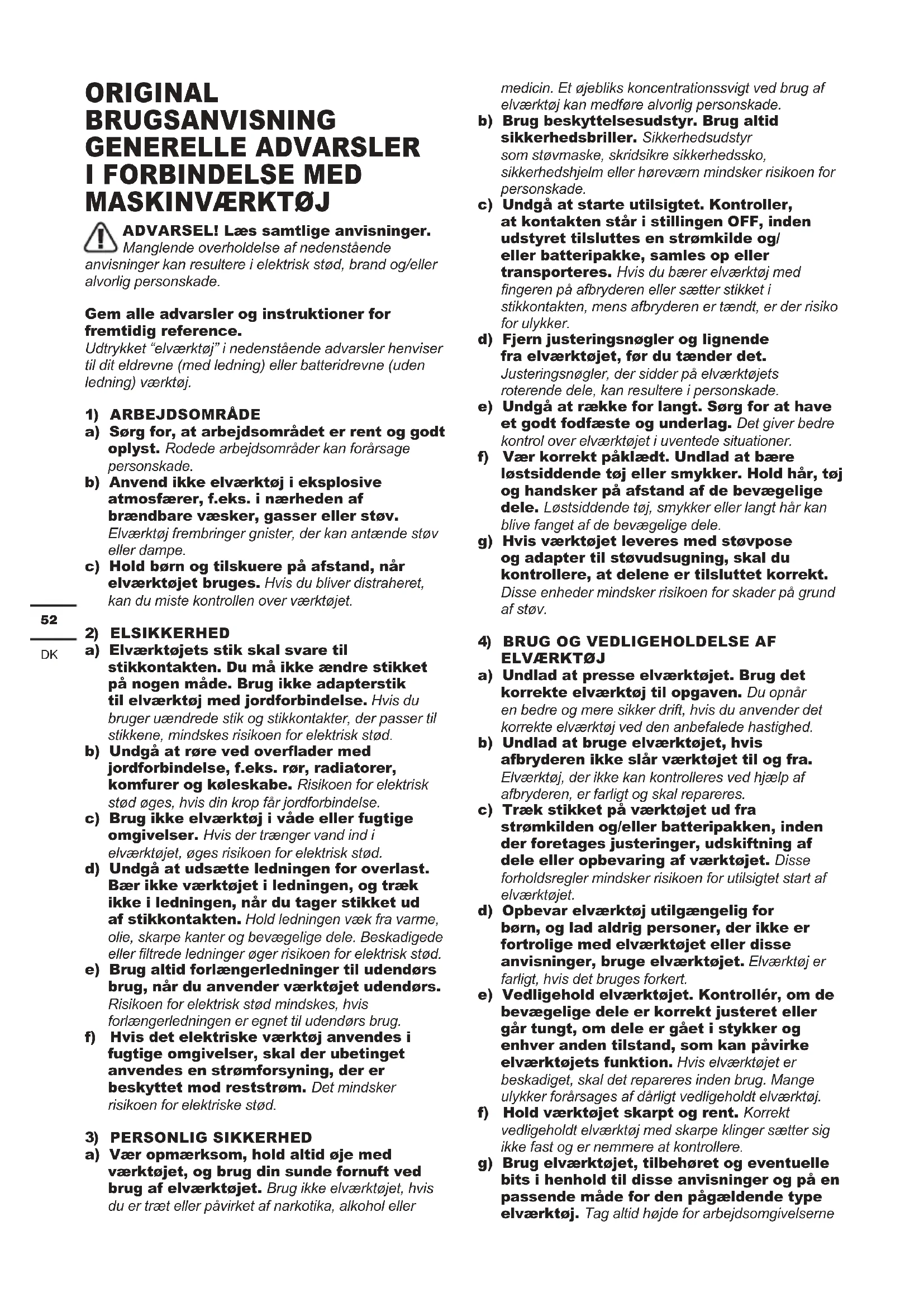 ADVARSEL! Læs samtlige anvisninger. Manglende overholdelse af nedenstående anvisninger kan resultere i elektrisk stød, brand og/eller alvorlig personskade. Gem alle advarsler og instruktioner for fremtidig reference. Udtrykket “elværktøj” i nedenstående advarsler henviser til dit eldrevne (med ledning) eller batteridrevne (uden ledning) værktøj.