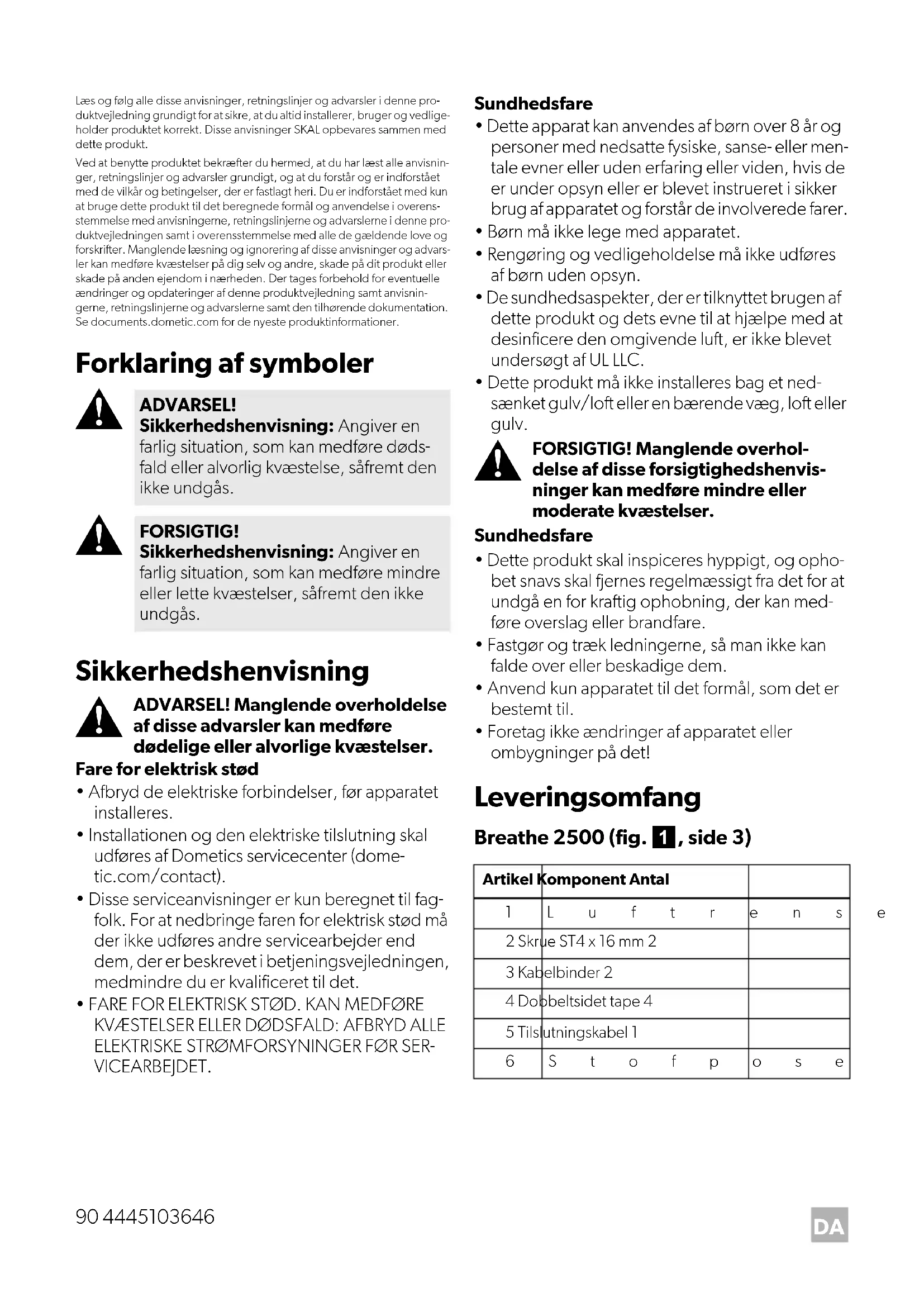- Foretag ikke ændringer af apparatet eller ombygninger på det! Leveringsomfang Breathe 2500 (fig. 1, side 3) ADVARSEL! Sikkerhedshenvisning: Angiver en farlig situation, som kan medføre døds- fald eller alvorlig kvæstelse, såfremt den ikke undgås. FORSIGTIG! Sikkerhedshenvisning: Angiver en farlig situation, som kan medføre mindre eller lette kvæstelser, såfremt den ikke undgås. Artikel Komponent Antal1Luftrenser 12 Skrue ST4 x 16 mm 23 Kabelbinder 24 Dobbeltsidet tape 45 Tilslutningskabel 16Stofpose 14445103646 91