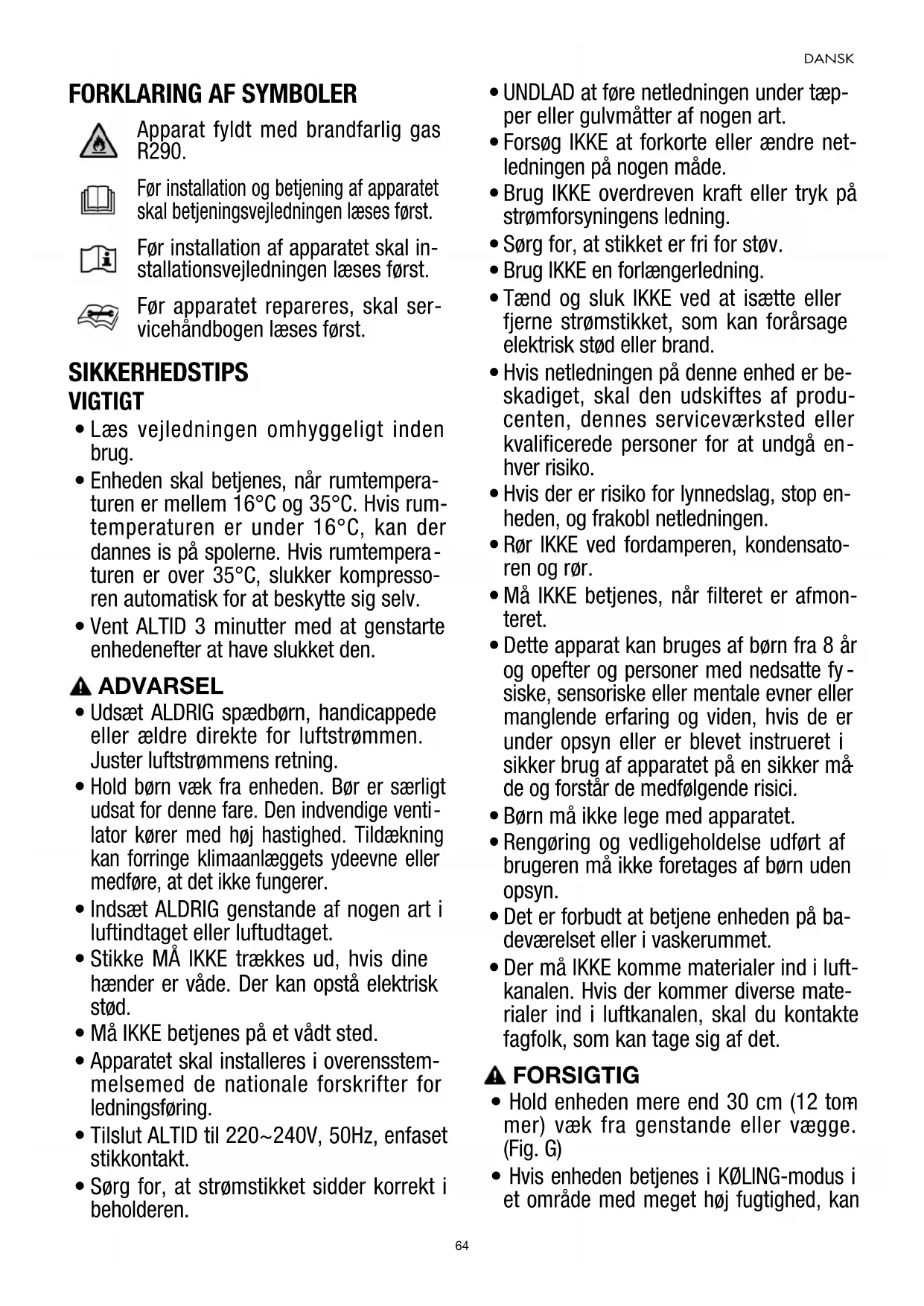 Apparat fyldt med brandfarlig gas R290. Før installation og betjening af apparatet skal betjeningsvejledningen læses først. Før installation af apparatet skal in- stallationsvejledningen læses først. Før apparatet repareres, skal ser- vicehåndbogen læses først. SIKKERHEDSTIPS VIGTIGT