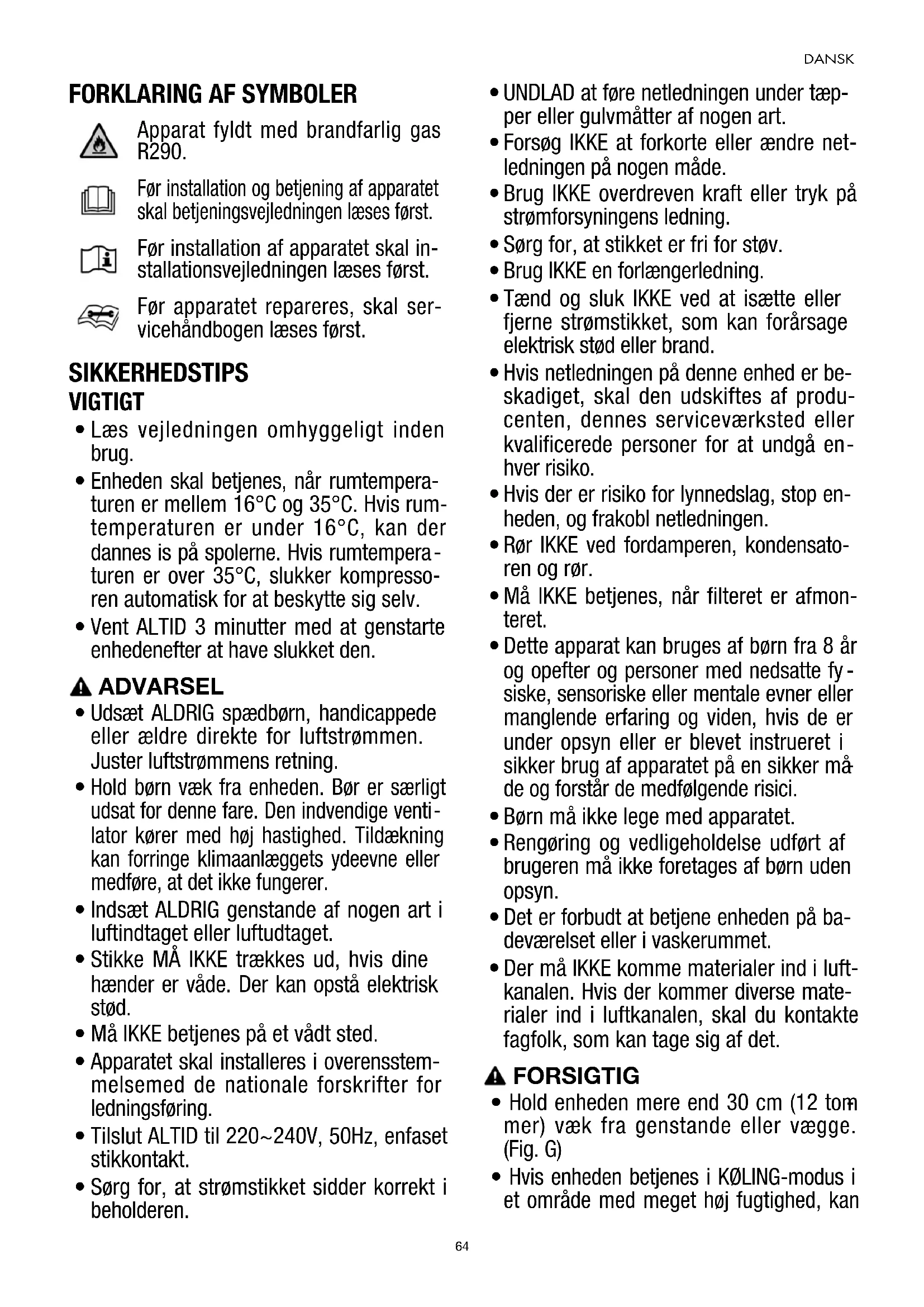 Apparat fyldt med brandfarlig gas R290. Før installation og betjening af apparatet skal betjeningsvejledningen læses først. Før installation af apparatet skal in- stallationsvejledningen læses først. Før apparatet repareres, skal ser- vicehåndbogen læses først. SIKKERHEDSTIPS VIGTIGT