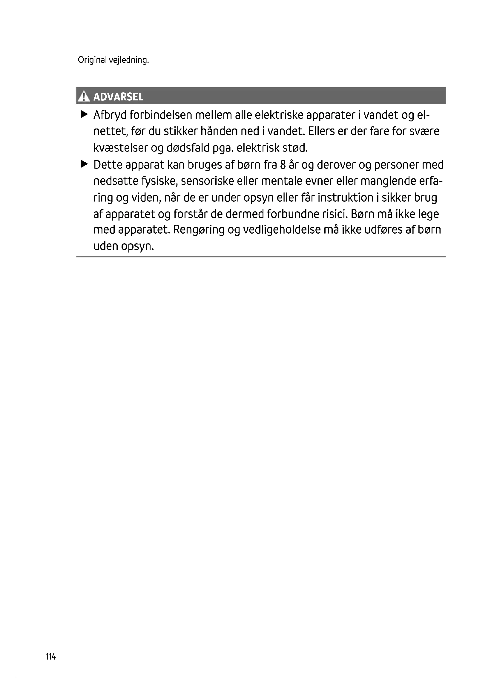 ADVAR SEL ADVARSEL Afbryd forbindelsen mellem alle elektriske apparater i vandet og el- nettet, før du stikker hånden ned i vandet. Ellers er der fare for svære kvæstelser og dødsfald pga. elektrisk stød. Dette apparat kan bruges af børn fra 8 år og derover og personer med nedsatte fysiske, sensoriske eller mentale evner eller manglende erfa- ring og viden, når de er under opsyn eller får instruktion i sikker brug af apparatet og forstår de dermed forbundne risici. Børn må ikke lege med apparatet. Rengøring og vedligeholdelse må ikke udføres af børn uden opsyn.DA