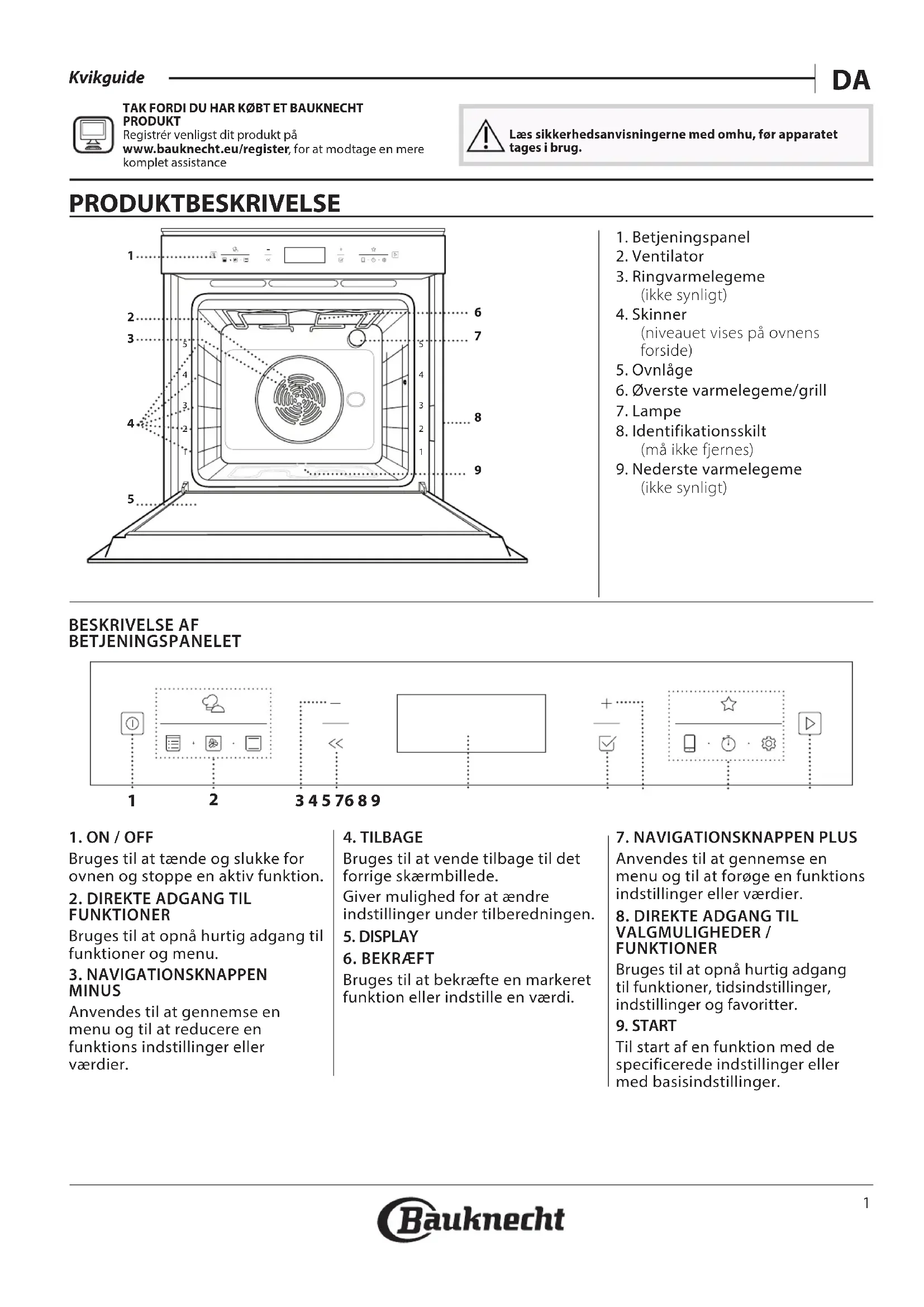 Til start af en funktion med de specificerede indstillinger eller med basisindstillinger. TAK FORDI DU HAR KØBT ET BAUKNECHT PRODUKT Registrér venligst dit produkt på www.bauknecht.eu/register, for at modtage en mere komplet assistance Læs sikkerhedsanvisningerne med omhu, før apparatet tages i brug.2 TILBEHØR