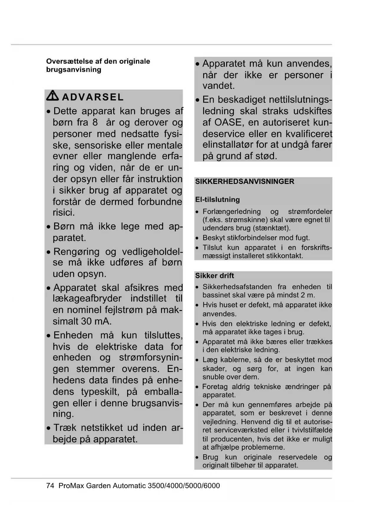 Med dit køb af ProMax Garden Automa- tic 3500/4000/5000/6000 har du truffet et godt valg. Inden du bruger apparatet første gang, er det vigtigt, at du læser brugsanvisningen grundigt igennem og gør dig fortrolig med apparatet. Alle arbejder på og med dette apparat må kun udføres iht. foreliggende vejledning. Sikkerhedshenvisningerne skal ubetinget overholdes for korrekt og sikker anven- delse. Opbevar denne brugsanvisning omhyg- geligt. Ved ejerskifte, videregiv venligst brugsanvisningen. Advarselshenvisninger i denne vejledning Advarsler Advarslerne i denne vejledning er klassi- ficeret med signalord, der angiver farens omfang. ADVARSEL
