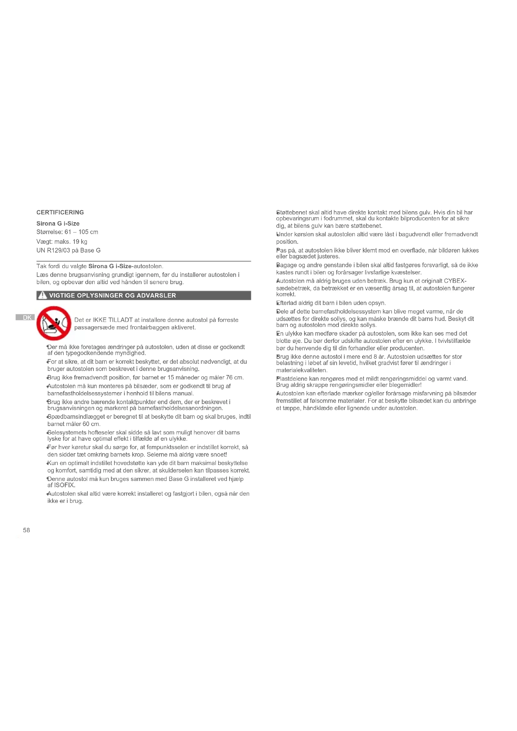 CERTIFICERING Sirona G i-Size Størrelse: 61 – 105 cm Vægt: maks. 19 kg UN R129/03 på Base G Tak fordi du valgte Sirona G i-Size-autostolen. Læs denne brugsanvisning grundigt igennem, før du installerer autostolen i bilen, og opbevar den altid ved hånden til senere brug.