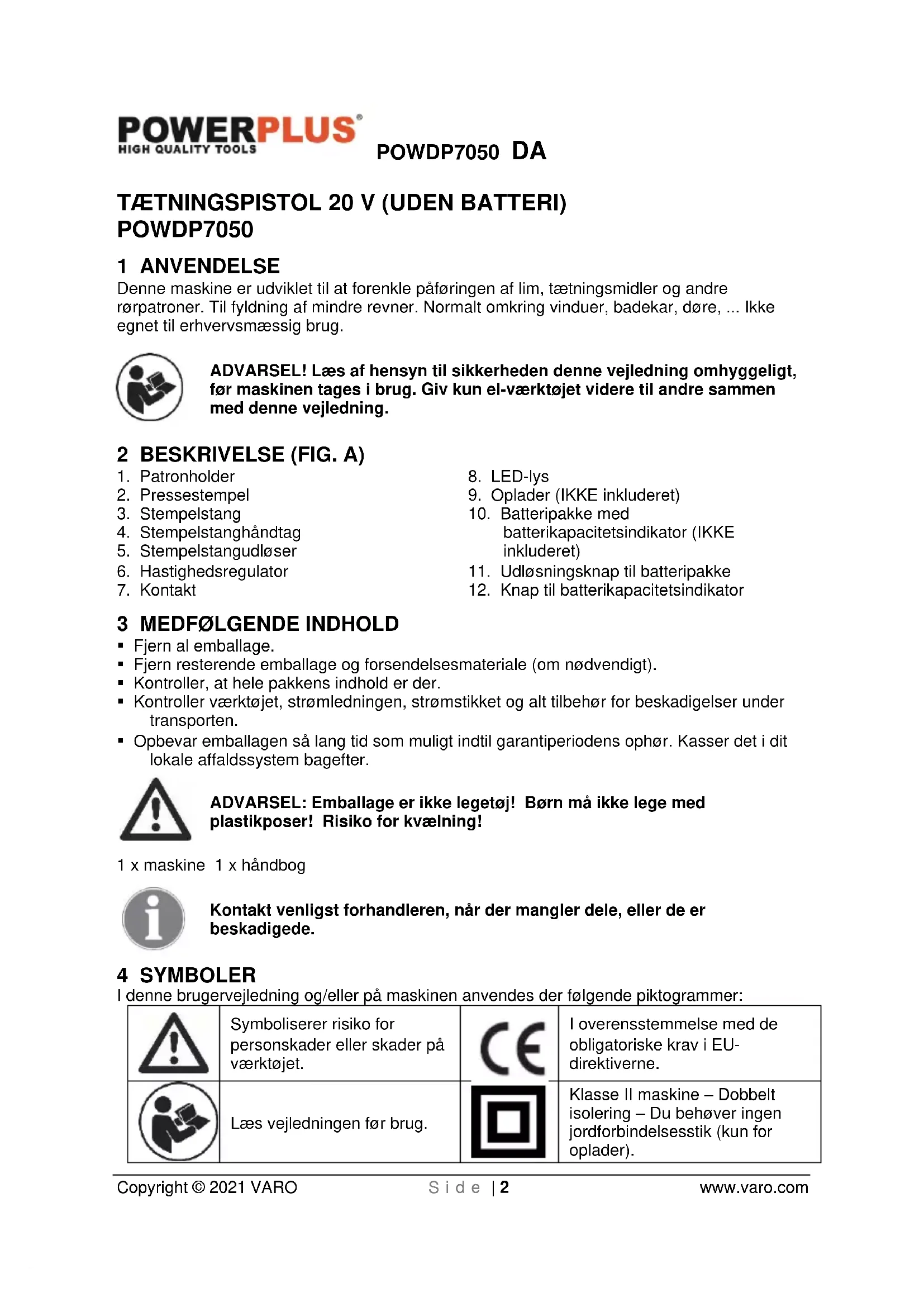 - Værktøjet skal oplades mindst en gang om måneden for at sikre, at det fungerer optimalt.POWDP7050 DA Copyright © 2021 VARO S i d e | 9 www.varo.com 12 MILJØ Hvis maskinen skal skiftes ud efter lang tids brug, må den ikke bortskaffes som husholdningsaffald, men skal bortskaffes på en miljømæssigt forsvarlig måde. Affald produceret af de elektriske maskiner må ikke behandles som normalt husaffald. Sørg for at genbruge det, hvor der findes egnede anlæg til det. Kontakt den lokale instans eller forhandleren for at få rådgivning om indsamling og bortskaffelse. 13 KONFORMITETSERKLÆRING VARO – Vic. Van Rompuy N.V – Joseph Van Instraat 9 – BE2500 Lier – Belgien, erklærer hermed, at Apparatbeskrivelse: Tætningspistol 20 V Varemærke: PowerPlus Varenummer: POWDP7050 er i overensstemmelse med de væsentlige krav og andre relevante bestemmelser i gældende europæiske direktiver, der er baseret på anvendelse af europæiske harmoniserede standarder. Enhver uautoriseret modifikation af apparatet ugyldiggør denne erklæring. EU-direktiver (herunder eventuelle tillæg frem til datoen for undertegnelsen): 2011/65/EU 2006/42/EC 2014/30/EU Harmoniserede europæiske standarder (herunder eventuelle tillæg frem til datoen for undertegnelsen): EN62841-1 : 2015 EN ISO 12100 : 2010 EN55014-1 : 2017 EN55014-2 : 2015 Indehaver af den tekniske dokumentation: Philippe Vankerkhove, VARO - Vic. Van Rompuy N.V. Undertegnede handler på vegne af selskabets administrerende direktør, Ludo Mertens Regulatory Affairs (afdelingen for juridiske anliggender) – Compliance Manager 08/10/2020, Lier - BelgiumPOWDP7050 SV Copyright © 2021 VARO S i d a | 1 www.varo.com
