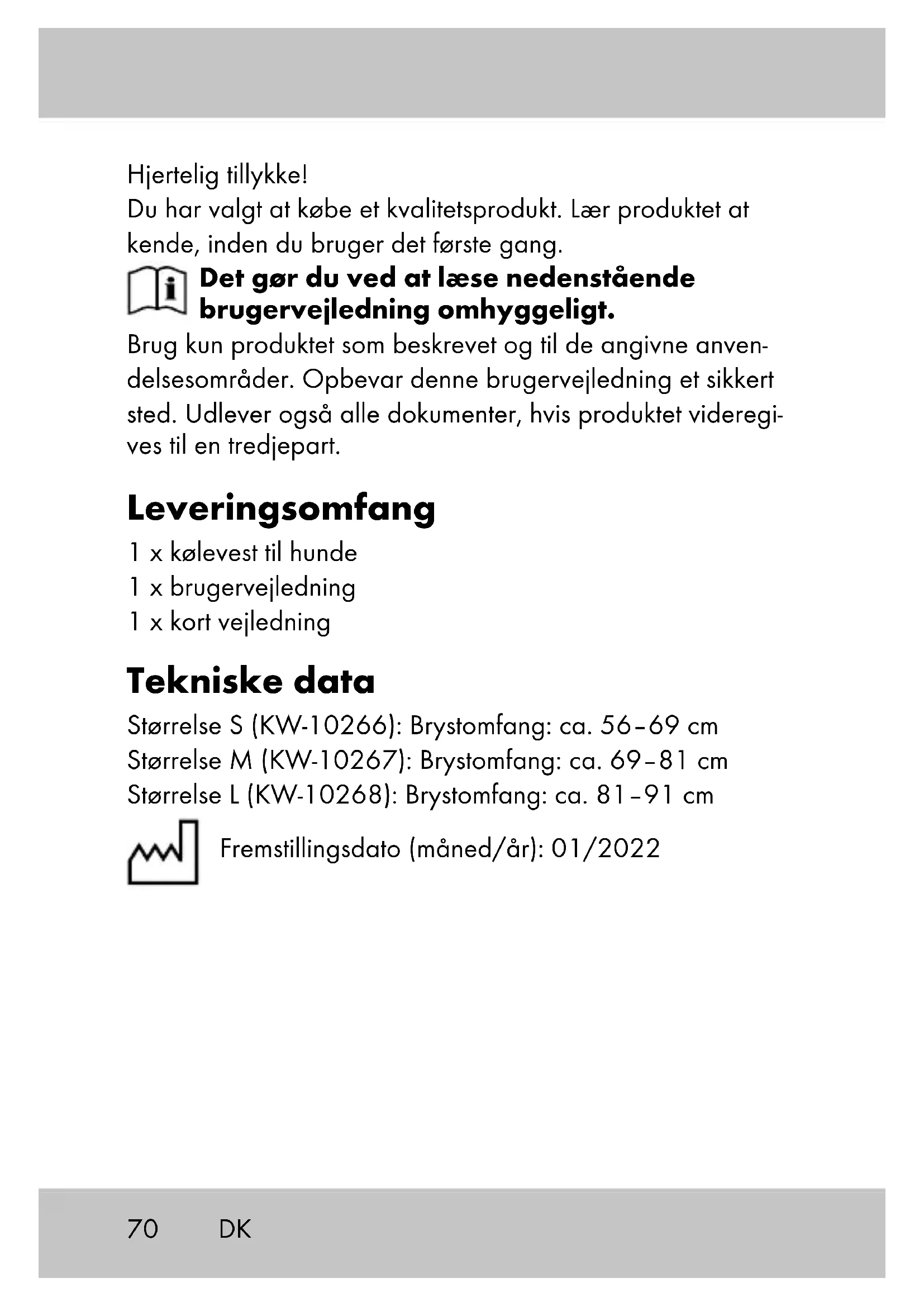 DK75 Opbevaring, rengøring Artiklen skal rengøres mekanisk med jævne mellemrum af hensyn til dens funktion. Opbevar altid artiklen tør og ren ved stuetemperatur, når den ikke er i brug. Rengøres ved let tilsmudsning med vand og tørres derefter med en rengøringsklud. VIGTIGT! Må aldrig rengøres med skrappe rengøringsmidler. Under eller efter et sygdomsforløb ved dyret skal artiklen de- sinficeres. Man bør konsultere en betroet dyrlæge og spørge denne om passende hygiejne- og desinfektionsmidler. Henvisninger vedr. bortskaffelse Bortskaf artikel og emballage i overensstemmelse med lokalt gældende forskrifter. Emballagematerialer som f.eks. plastpo- ser hører ikke hjemme i børnehænder. Opbevar emballagen utilgængeligt for børn. Bortskaf produkter og emballage miljørigtigt. Genbrugskoden anvendes til mærkning af forskellige materialer med henblik på genvinding. Koden består af genbrugssymbolet – som afspejler genvindingskredsløbet – og et nummer, der kendetegner materialet. DK76 Oplysninger om garanti og servicehåndtering Varen er fremstillet med største omhu og under løbende kon- trol. DELTA-SPORT HANDELSKONTOR GmbH yder private slutkunder tre års garanti på varen fra købsdato (Garantifrist) i henhold til følgende bestemmelser. Garantien gælder kun for materiale- og fremstillingsfejl. Garantien omfatter ikke dele, der er udsat for normal slid og derfor skal betragtes som sliddele (f.eks. batterier) og ikke skrøbelige dele, f.eks. kontakter, genopladelige batterier eller dele, der er fremstillet af glas. Garantien kan ikke gøres gældende, hvis varen er blevet anvendt ukorrekt eller uagtsomt eller til andre formål end det tilsigtede eller i det tilsigtede omfang. Garantien bortfalder ligeledes ved manglende overholdelse af anvisningerne i betjeningsvejledningen. Kunden skal kunne påvise, at der er tale om materiale- eller fremstillingsfejl og ikke fejl som følge af ovenstående omstændigheder. Garantien kan kun gøres gældende i garantiperioden mod fremvisning af original kvittering. Gem derfor den originale kvittering Garantiperioden forlænges ikke i tilfælde af repa- ration i henhold til garantien, den lovpligtige garanti eller pr. kulance. Dette gælder også for udskiftede og reparerede dele. DK77 I tilfælde af klager er det muligt at kontakte nedenstående servicelinje eller kontakte os pr. e-mail. Ved garantisager vil vi efter eget skøn reparere varen uden beregning, ombytte varen eller refundere købsprisen. Der er ingen yderligere rettigheder under garantien. Dine lovmæssige rettigheder, herunder navnlig garanti- krav over for sælger, indskrænkes ikke som følge af denne garanti. IAN: 389124_2107 Service Danmark Tel.: 32 710005 E-Mail: deltasport@lidl.dk DK78 Congratulazioni! Avete acquistato un articolo di alta qualità. Consigliamo di familiarizzare con l’articolo prima di cominciare ad utilizzarlo. Leggere attentamente le seguenti istruzioni d’uso. Utilizzare l’articolo solo nel modo descritto e per gli ambiti di applicazione indicati. Conservare accuratamente queste istruzioni d’uso. In caso di trasferimento dell’articolo a terzi, consegnare tutti i documenti insieme all’articolo. Contenuto della confezione 1 x gilet rinfrescante per cani 1 x istruzioni d’uso 1 x brevi istruzioni Dati tecnici Taglia S (KW-10266): Circonferenza del torace: circa 56–69 cm Taglia M (KW-10267): Circonferenza del torace: circa 69–81 cm Taglia L (KW-10268): Circonferenza del torace: circa 81–91 cm Data di produzione (mese/anno): 01/2022 Utilizzo conforme Questo articolo è concepito come rinfrescante per cani con una circonferenza del torace di circa 56–69 cm nella taglia S, di circa 69–81 cm di circonferenza del torace nella taglia M e di circa 81–91 cm di circonferenza del torace nella taglia L, per l’utilizzo privato. IT79 Indicazioni di sicurezza Pericolo di ferirsi!