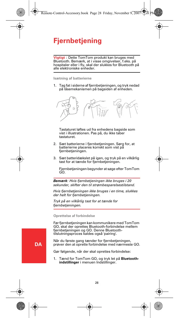 Remote-Control-Accessory.book Page 28 Friday, November 9, 2007 4:38 PM Fjernbetjening Fjernbetjening Vigtigt : Dette TomTom produkt kan bruges med Bluetooth. Bemærk, at i visse omgivelser, f.eks. på hospitaler eller i fly, skal der slukkes for Bluetooth på alle elektroniske enheder. Isætning af batterierne