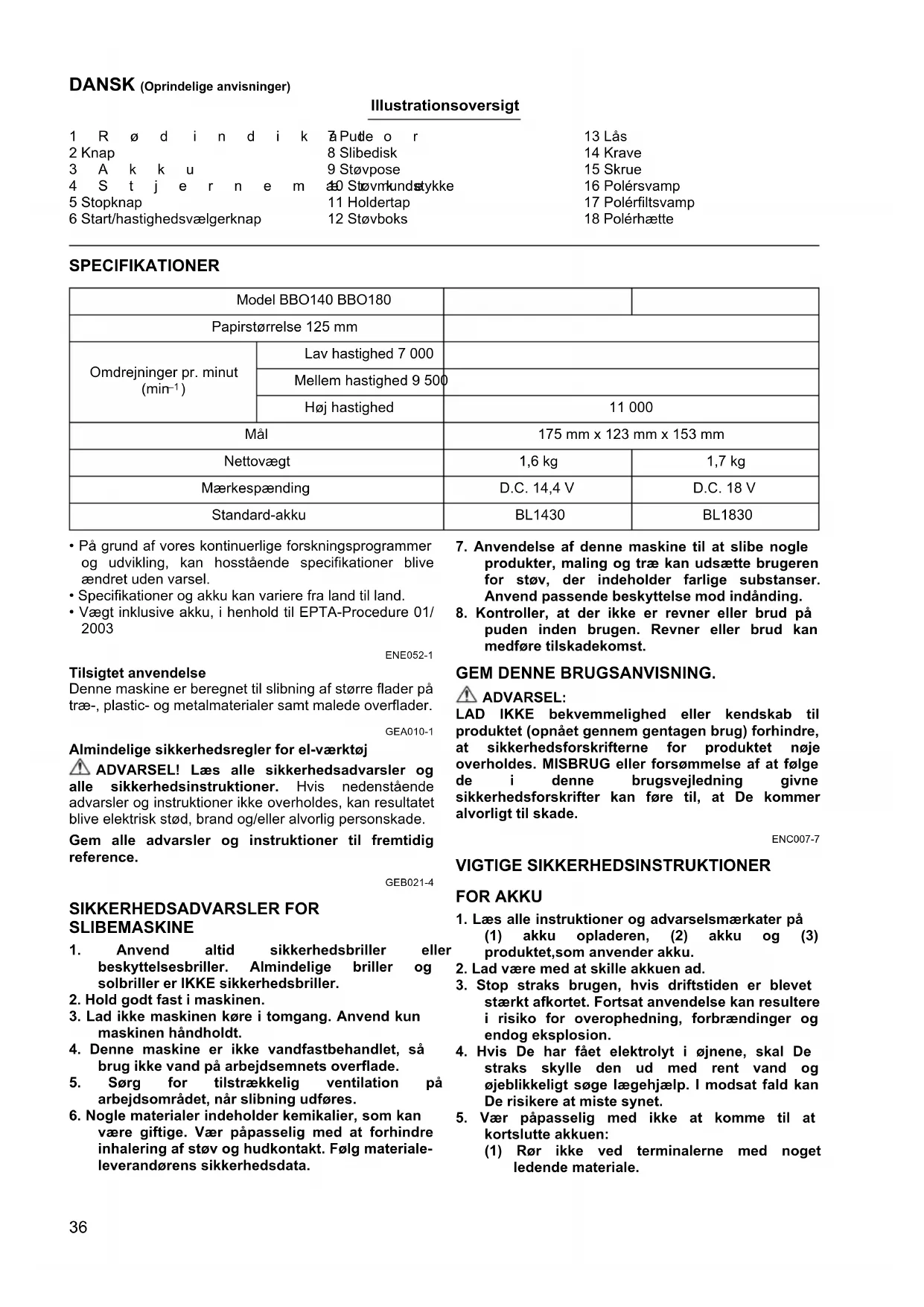 ENE052-1 Tilsigtet anvendelse Denne maskine er beregnet til slibning af større flader på træ-, plastic- og metalmaterialer samt malede overflader. GEA010-1 Almindelige sikkerhedsregler for el-værktøj ADVARSEL! Læs alle sikkerhedsadvarsler og alle sikkerhedsinstruktioner. Hvis nedenstående advarsler og instruktioner ikke overholdes, kan resultatet blive elektrisk stød, brand og/eller alvorlig personskade. Gem alle advarsler og instruktioner til fremtidig reference. GEB021-4 SIKKERHEDSADVARSLER FOR SLIBEMASKINE