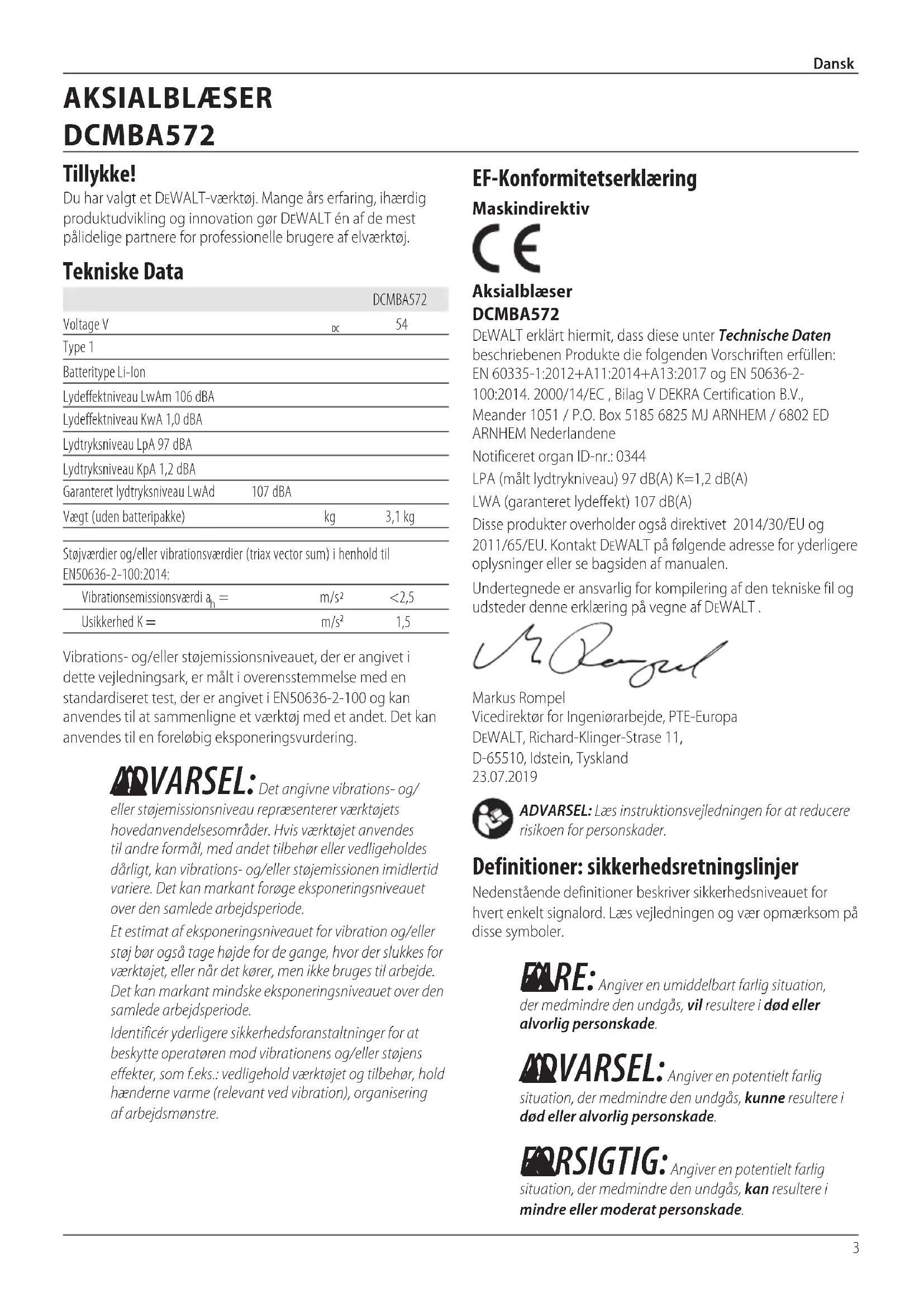 FORSIGTIG: Angiver en potentielt farlig situation, der medmindre den undgås, kan resultere i mindre eller moderatpersonskade. EF-Konformitetserklæring Maskindirektiv Aksialblæser DCMBA572 DeWALT erklärt hiermit, dass diese unter Technische Daten beschriebenen Produkte die folgenden Vorschriften erfüllen: EN 60335-1:2012+A11:2014+A13:2017 og EN 50636-2-100:2014. 2000/14/EC , Bilag V DEKRA Certification B.V., Meander 1051 / P.O. Box 5185 6825 MJ ARNHEM / 6802 ED ARNHEM Nederlandene Notificeret organ ID-nr.: 0344 LPA (målt lydtrykniveau) 97 dB(A) K=1,2 dB(A)LWA (garanteret lydeffekt) 107 dB(A)Disse produkter overholder også direktivet 2014/30/EU og 2011/65/EU. Kontakt DeWALT på følgende adresse for yderligere oplysninger eller se bagsiden afmanualen.Undertegnede er ansvarlig for kompilering af den tekniske fil og udsteder denne erklæring på vegne af DeWALT.Markus Rompel Vicedirektør for Ingeniørarbejde, PTE-Europa DeWALT, Richard-Klinger-Strase 11, D-65510, Idstein, Tyskland 23.07.2019Vibrations- og/eller støjemissionsniveauet, der er angivet i dette vejledningsark, er målt i overensstemmelse med en standardiseret test, der er angivet i EN50636-2-100 og kan anvendes til at sammenligne et værktøj med et andet. Det kan anvendes til en foreløbigeksponeringsvurdering.