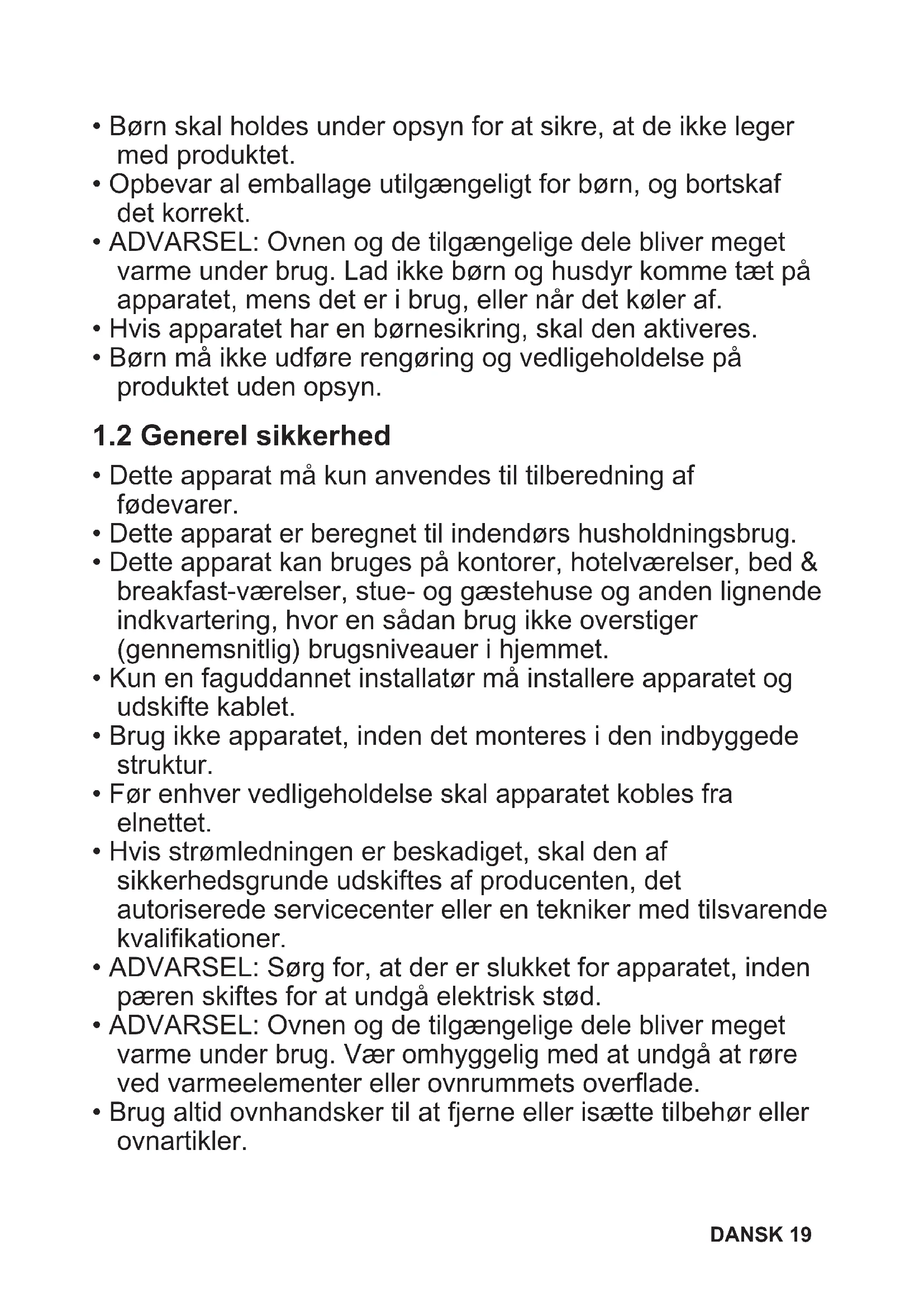 - ADVARSEL: Ovnen og de tilgængelige dele bliver meget varme under brug. Lad ikke børn og husdyr komme tæt på apparatet, mens det er i brug, eller når det køler af.