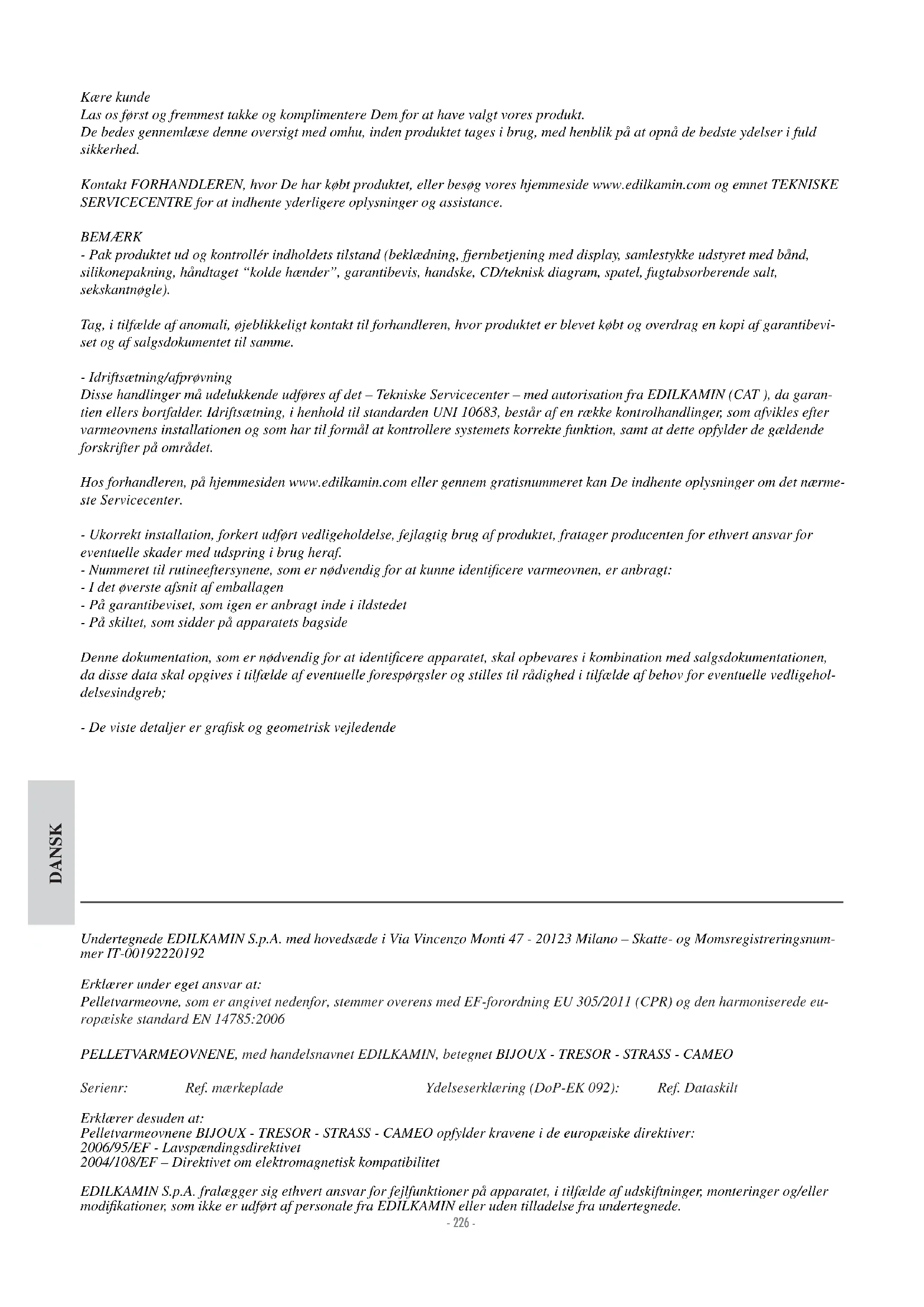 Kære kunde Las os først og fremmest takke og komplimentere Dem for at have valgt vores produkt. De bedes gennemlæse denne oversigt med omhu, inden produktet tages i brug, med henblik på at opnå de bedste ydelser i fuld sikkerhed. Kontakt FORHANDLEREN, hvor De har købt produktet, eller besøg vores hjemmeside www.edilkamin.com og emnet TEKNISKE SERVICECENTRE for at indhente yderligere oplysninger og assistance. BEMÆRK - Pak produktet ud og kontrollér indholdets tilstand (beklædning, fjernbetjening med display, samlestykke udstyret med bånd, silikonepakning, håndtaget “kolde hænder”, garantibevis, handske, CD/teknisk diagram, spatel, fugtabsorberende salt, sekskantnøgle). Tag, i tilfælde af anomali, øjeblikkeligt kontakt til forhandleren, hvor produktet er blevet købt og overdrag en kopi af garantibevi- set og af salgsdokumentet til samme. - Idriftsætning/afprøvning Disse handlinger må udelukkende udføres af det – Tekniske Servicecenter – med autorisation fra EDILKAMIN (CAT ), da garan- tien ellers bortfalder. Idriftsætning, i henhold til standarden UNI 10683, består af en række kontrolhandlinger, som afvikles efter varmeovnens installationen og som har til formål at kontrollere systemets korrekte funktion, samt at dette opfylder de gældende forskrifter på området. Hos forhandleren, på hjemmesiden www.edilkamin.com eller gennem gratisnummeret kan De indhente oplysninger om det nærme- ste Servicecenter. - Ukorrekt installation, forkert udført vedligeholdelse, fejlagtig brug af produktet, fratager producenten for ethvert ansvar for eventuelle skader med udspring i brug heraf. - Nummeret til rutineeftersynene, som er nødvendig for at kunne identi¿ cere varmeovnen, er anbragt: - I det øverste afsnit af emballagen - På garantibeviset, som igen er anbragt inde i ildstedet - På skiltet, som sidder på apparatets bagside Denne dokumentation, som er nødvendig for at identi¿ cere apparatet, skal opbevares i kombination med salgsdokumentationen, da disse data skal opgives i tilfælde af eventuelle forespørgsler og stilles til rådighed i tilfælde af behov for eventuelle vedligehol- delsesindgreb; - De viste detaljer er gra¿ sk og geometrisk vejledende Undertegnede EDILKAMIN S.p.A. med hovedsæde i Via Vincenzo Monti 47 - 20123 Milano – Skatte- og Momsregistreringsnum- mer IT-00192220192 Erklærer under eget ansvar at: Pelletvarmeovne , som er angivet nedenfor, stemmer overens med EF-forordning EU 305/2011 (CPR) og den harmoniserede eu- ropæiske standard EN 14785:2006 PELLETVARMEOVNENE, med handelsnavnet EDILKAMIN, betegnet BIJOUX - TRESOR - STRASS - CAMEO Serienr: Ref. mærkeplade Ydelseserklæring (DoP-EK 092): Ref. Dataskilt Erklærer desuden at: Pelletvarmeovnene BIJOUX - TRESOR - STRASS - CAMEO opfylder kravene i de europæiske direktiver: 2006/95/EF - Lavspændingsdirektivet 2004/108/EF – Direktivet om elektromagnetisk kompatibilitet EDILKAMIN S.p.A. fralægger sig ethvert ansvar for fejlfunktioner på apparatet, i tilfælde af udskiftninger, monteringer og/eller modi¿ kationer, som ikke er udført af personale fra EDILKAMIN eller uden tilladelse fra undertegnede.- 227 - DANSK