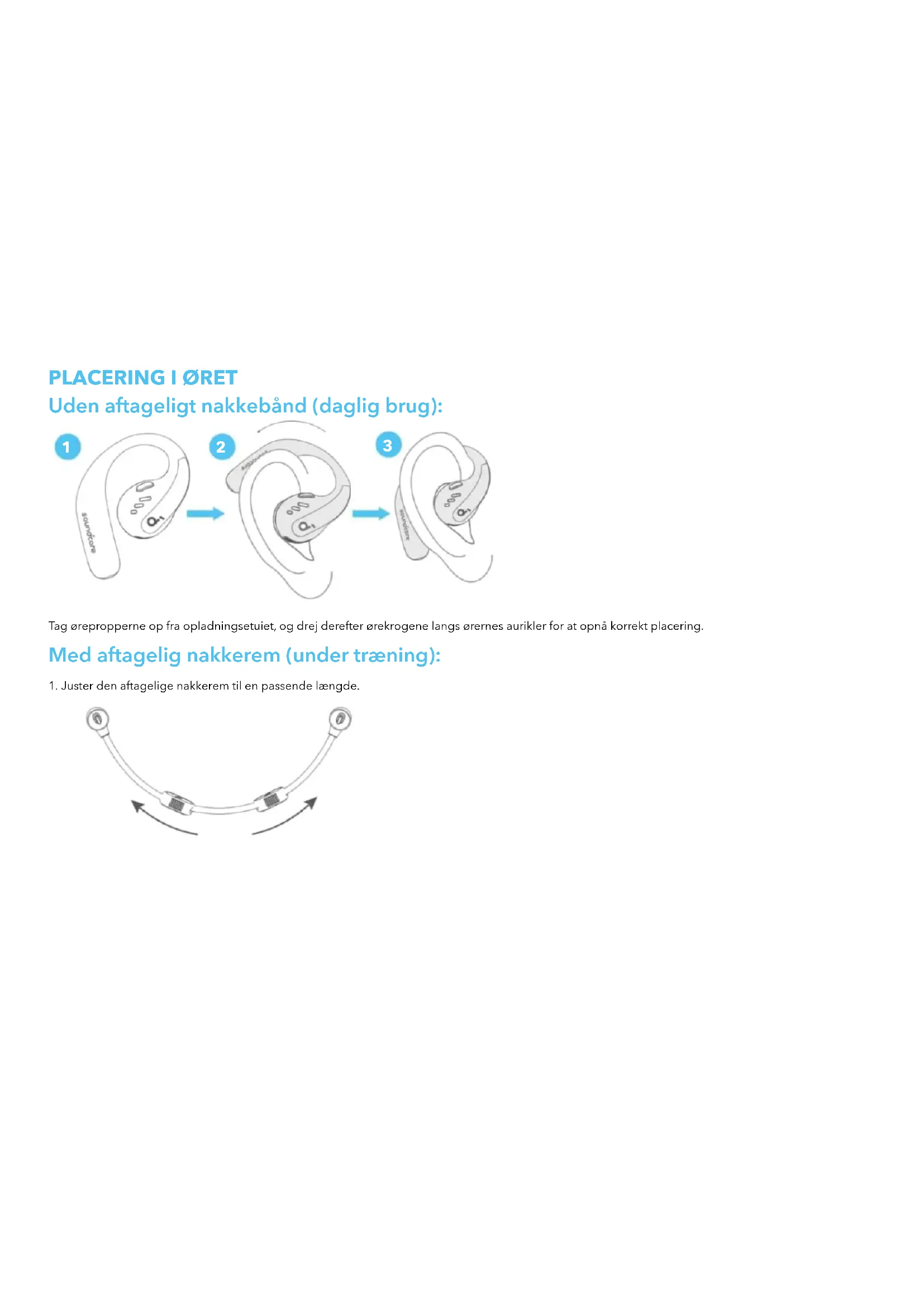 Tag ørepropperne op fra opladningsetuiet, og drej derefter ørekrogene langs ørernes aurikler for at opnå korrekt placering. Med aftagelig nakkerem (under træning): 1. Juster den aftagelige nakkerem til en passende længde.2. Klik ørepropperne på det aftagelige nakkebånd. Sørg for, at retningen er korrekt ved at justere mærkerne på ørepropperne og det aftagelige nakkebånd. 3.Tag det aftagelige nakkebånd på bag nakken, og placer ørekrogene på ørerne.OPLADNING Husk at rive isoleringsklistermærkerne på ørepropperne af inden første brug.