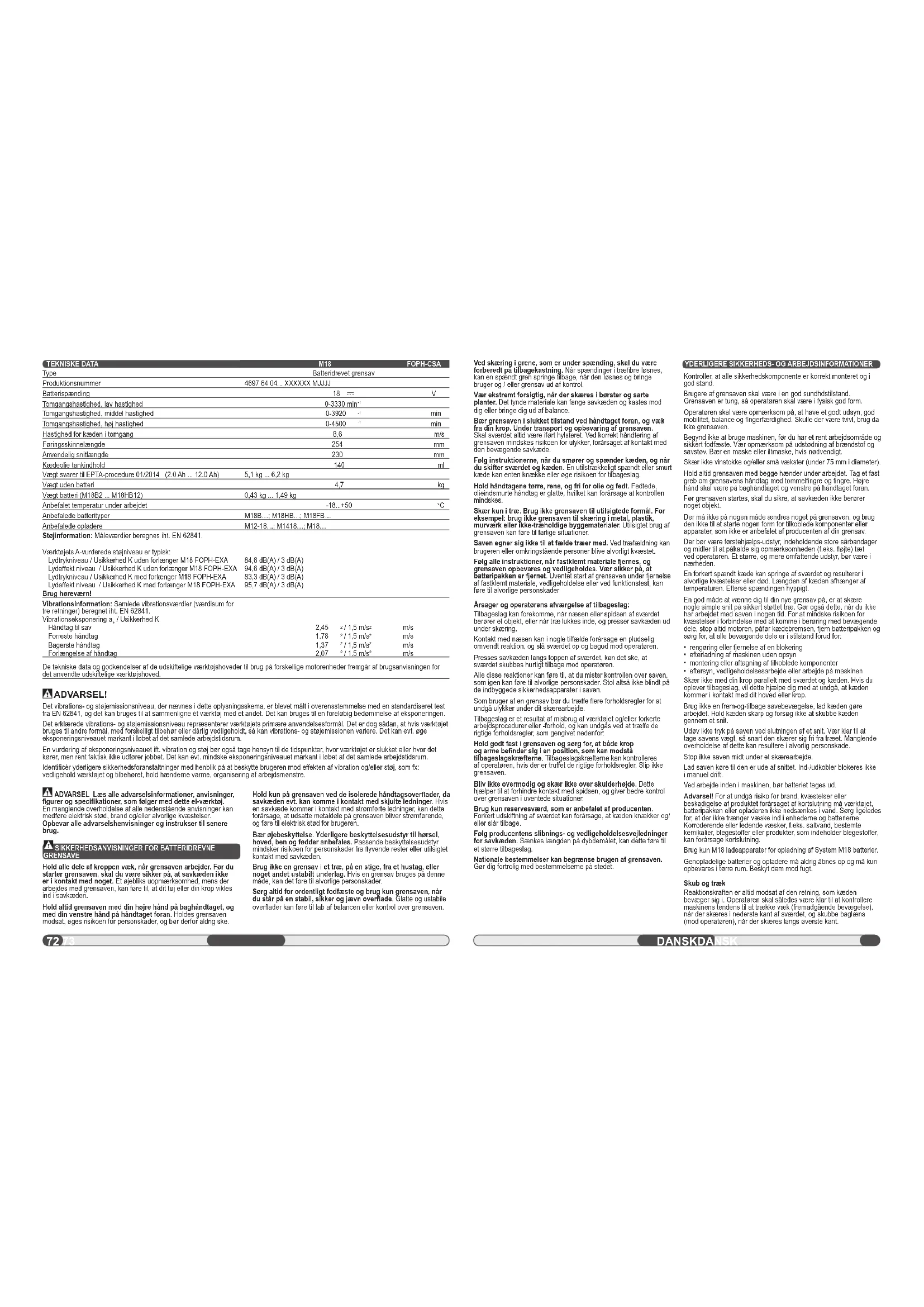 DANSKDANSK TEKNISKE DATA Type Produktionsnummer Batterispænding Tomgangshastighed, lav hastighed Tomgangshastighed, middel hastighed Tomgangshastighed, høj hastighed Hastighed for kæden i tomgang Føringsskinnelængde Anvendelig snitlængde Kædeolie tankindhold Vægt svarer til EPTA-procedure 01/2014 (2.0 Ah ... 12.0 Ah) Vægt uden batteri Vægt batteri (M18B2 ... M18HB12) Anbefalet temperatur under arbejdet Anbefalede batterityper Anbefalede opladere Støjinformation: Måleværdier beregnes iht. EN 62841. Værktøjets A-vurderede støjniveau er typisk: Lydtrykniveau / Usikkerhed K uden forlænger M18 FOPH-EXA Lydeff ekt niveau / Usikkerhed K uden forlænger M18 FOPH-EXA Lydtrykniveau / Usikkerhed K med forlænger M18 FOPH-EXA Lydeff ekt niveau / Usikkerhed K med forlænger M18 FOPH-EXA Brug høreværn! Vibrationsinformation: Samlede vibrationsværdier (værdisum for tre retninger) beregnet iht. EN 62841. Vibrationseksponering a