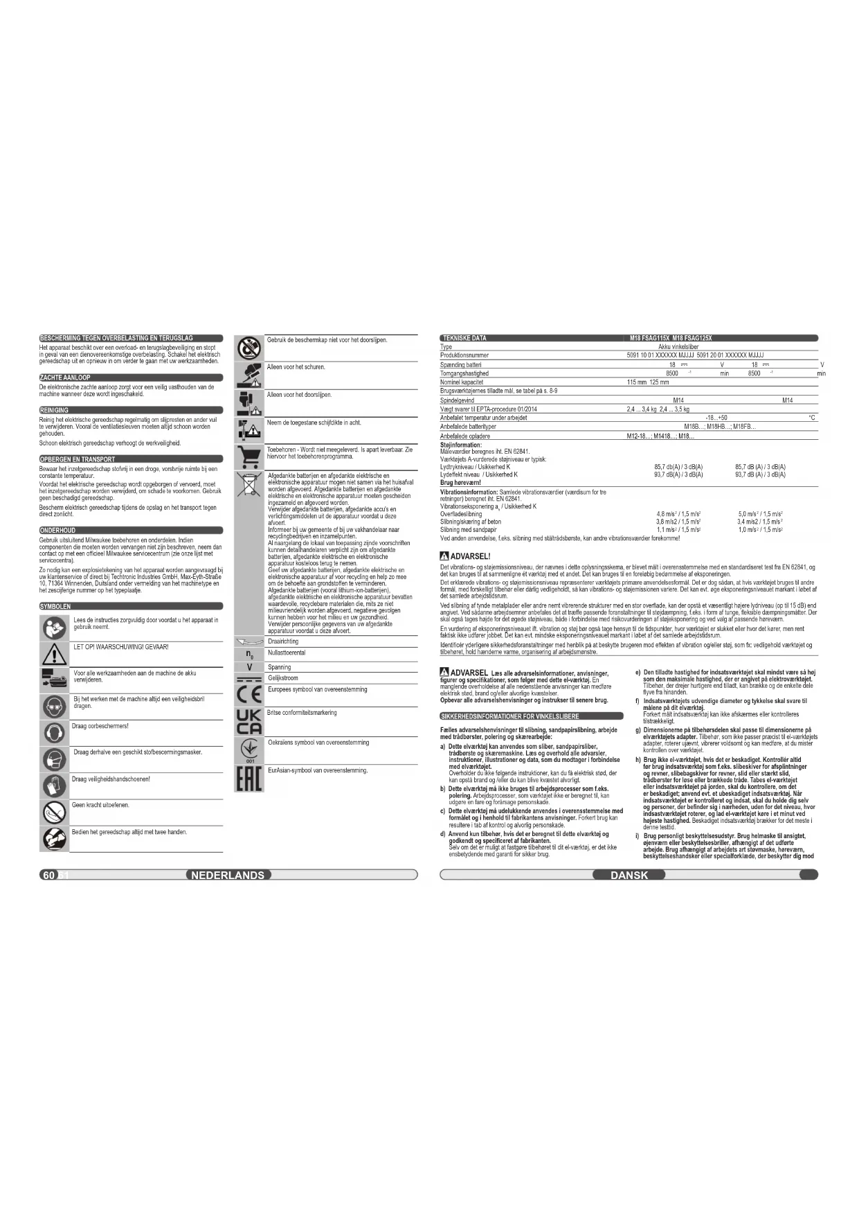 TILLADTE KOMBINATIONER AF INDSATSVÆRKTØJER OG SIKKERHEDSANORDNINGER Der må kun anvendes følgende kombinationer af indsatsværktøj og beskyttelsesanordning: Brug indsatsværktøj sikkerhedsanordning Skæring Skivetype (41, 42) til metal A - skærebeskyttelsesskærm Skivetype (41, 42) til murværk/beton A - skærebeskyttelsesskærm Diamantskæreskive til metal A - skærebeskyttelsesskærm Diamantskæreskive til murværk/beton (80) A - skærebeskyttelsesskærm Skæreskiver til andet materiale end metal eller murværk/beton B - slibebeskyttelsesskærm Multifunktionelle anvendelser (kombination af skæring og slibning) Multifunktionel skæreskive A - skærebeskyttelsesskærm Hulboring Diamanthulbor (87) Ingen Trådbørster Trådbørsteskive (70) B - slibeeskyttelsesskærm Trådbørste (85, 86) Ingen Slibning med sandpapir Lamelslibeskive (65) B - slibeeskyttelsesskærm Fleksibelt slibemiddel (f.eks. slibepapir), som holdes af en fl eksibel støttepude (90) Ingen Hårdmetalskive (til slibning af andet materiale end metal eller murværk/beton) Ingen Overfl adeslibning Skivetype 27 B - slibebeskyttelsesskærm Alsidig anvendelse Indsatsværktøj med en diameter på op til 55 mm Ingen ARBEJDSANVISNINGER For værktøj hvorpå der skal monteres hjul med gevindskåret hul, skal De sikre, at gevindet i hjulet er langt nok til at rumme aksellængden. Benyt og opbevar kun skære- og slibeskiver iht. fabrikantens angivelser. Anvend altid sikkerhedsskærm ved skrubning og skæring. Til deling af sten er føringsslæden foreskrevet. Slibefl aden på forkrøppede skiver skal være minimum 3,4 mm under beskyttelsesskærmens kant. Flangemøtrikken skal spændes inden maskinen tages i brug. Brug altid støttegrebet. Det arbejdsemne, som skal bearbejdes, fastspændes, medmindre det holdes på plads af arbejdsemnets egenvægt. Før aldrig emnet mod skiven med hånden. Skrubslibning Brug aldrig slibeskæreskiver til skrubslibning. Ved skrubslibning kan slibebeskyttelsesskærmen med påsat skærebeskyttelsesskærm røre arbejdsemnet og føre til, at man mister kontrollen over værktøjet. De bedste skrubslibningsresultater opnås med en indstillingsvinkel på 30° til 40°. Bevæg elværktøjet frem og tilbage med moderat tryk. Det sikrer, at arbejdsemnet ikke bliver for varmt, misfarvet eller får riller. Planslibning med lamelslibeskive Lamelslibeskiven (tilbehør) gør det muligt at bearbejde buede overfl ader og profi ler. Lamelslibeskiver har en betydeligt længere levetid, et lavere støjniveau og lavere slibetemperaturer end konventionelle slibeskiver. Skæring af metal Ved brug af skærebeskyttelsesskærme til slibeskiveskæring med limede slibeskæreskiver er der en øget risiko for at blive udsat for gnister, partikler og skivesplinter, hvis skiven går i stykker. Ved slibeskiveskæring skal du bruge en moderat fremføring, som svarer til det materiale, der skal bearbejdes. Der må ikke trykkes på skæreskiven, og elværktøjet må hverken vippes eller drejes. Forsøg ikke at reducere hastigheden på en skæreskive, som er i gang med at standse, via tryk på siden. Skæring af murværk/beton Sørg for tilstrækkelig støvudsugning ved skæring i murværk/beton. Brug en støvmaske. Elværktøjet må kun anvendes til skæring/slibning af tørt materiale. Ved brug af skærebeskyttelsesskærmen, slibebeskyttelsesskærmen eller slibebeskyttelsesskærmen med påsat skærebeskyttelsesskærm til skære- og slibearbejde i beton eller murværk er der en øget støvbelastning og en øget risiko for at miste kontrollen over elværktøjet, hvilket kan føre til tilbageslag. For at skære i sten anbefales brugen af en diamantskæreskive. Ved brug af skærebeskyttelsesskærmen med udsugning og snitstyring skal udsugningen være godkendt til udsugning af stenstøv. Egnede støvudsugninger fås hos Milwaukee. Ved skæring i særligt hårdt materiale, som f.eks. beton med et højt grusindhold, kan diamantskæreskiven blive overophedet og dermed blive beskadiget. Dette kan tydeligt ses på cirkelformede gnister, der roterer med diamantskæreskiven. I så fald skal du afbryde arbejdet og lade diamantskæreskiven køle af, ved at elværktøjet kortvarigt kører ved maksimal hastighed og uden belastning. Hvis skiven kører betydeligt langsommere og der opstår runde gnister, er diamantskæreskiven blevet sløv. Skiven kan skærpes igen ved at skære kortvarigt i et slibende materiale (f.eks. kalksandsten). Arbejde med diamantkernebor Diamantkernebor må kun bruges til tørt materiale. Undlad at placere diamantkerneboret parallelt med arbejdsemnet. Før boret ind i arbejdsemnet skråt og med cirkelformede bevægelser. Dermed opnås der en optimal køling og en længere levetid for diamantkerneboret. Bygningstekniske oplysninger For huller i bærende vægge gælder nationale bestemmelser. Disse bestemmelser skal absolut overholdes. Rådfør dig med den ansvarlige bygningsingeniør, arkitekt eller byggeleder, inden arbejdet påbegyndes.