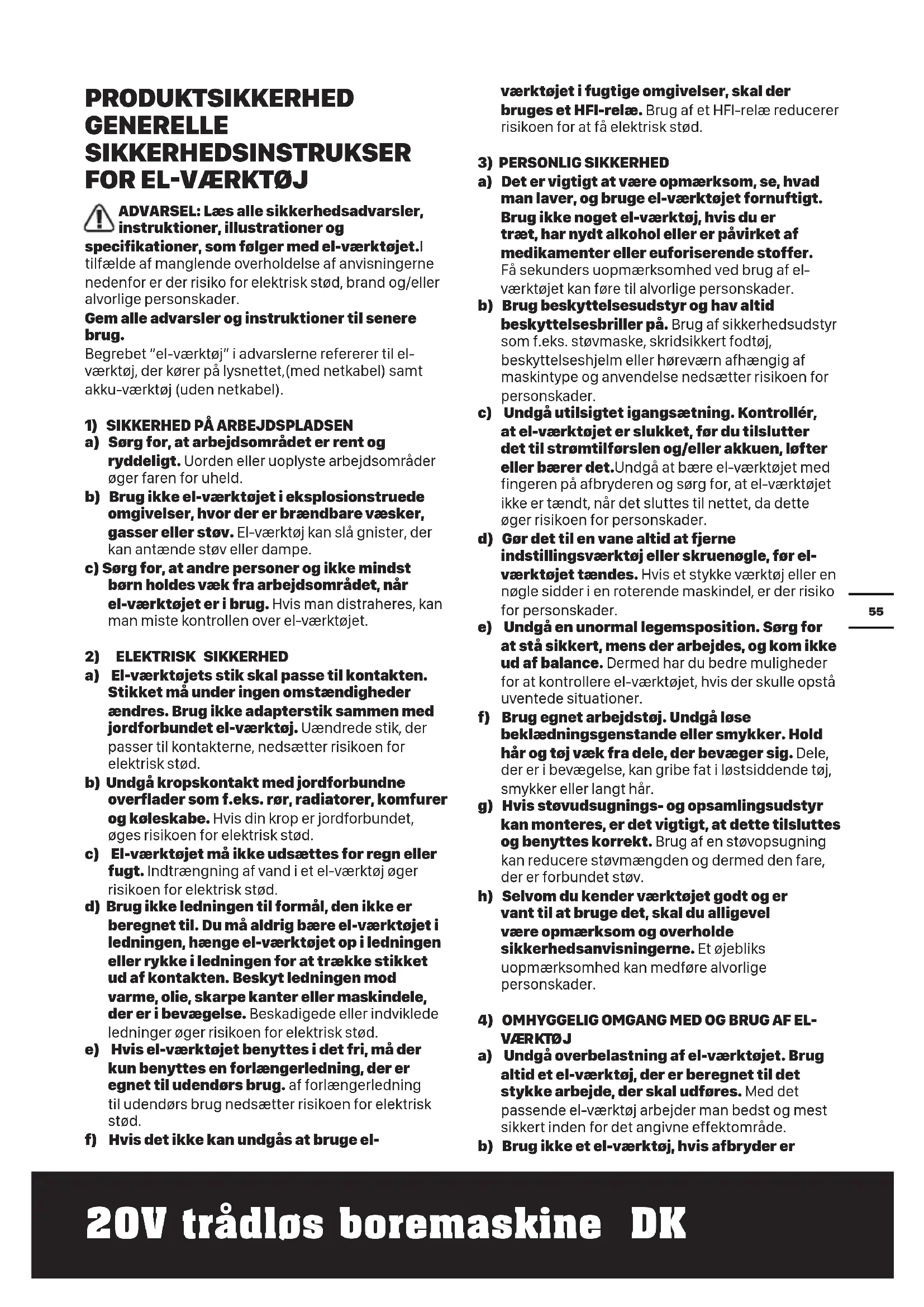 ADVARSEL: Læs alle sikkerhedsadvarsler, instruktioner, illustrationer og specifikationer, som følger med el-værktøjet.I tilfælde af manglende overholdelse af anvisningerne nedenfor er der risiko for elektrisk stød, brand og/eller alvorlige personskader. Gem alle advarsler og instruktioner til senere brug. Begrebet “el-værktøj” i advarslerne refererer til el- værktøj, der kører på lysnettet,(med netkabel) samt akku-værktøj (uden netkabel).