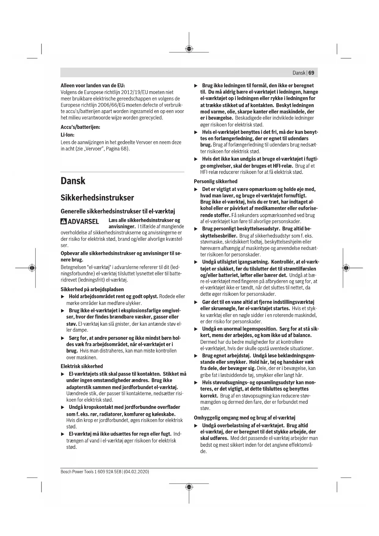 Low Energy Module GCY30-4 is uitgerust met een radio-interface. Lokale gebruiksbeperkingen, bijv. in vliegtuigen of ziekenhuizen, moeten in acht ge- nomen worden. Beweeg het slijpaccessoire met een lichte druk gelijkmatig heen en weer om een optimaal resultaat te verkrijgen. Een te sterke druk vermindert de prestaties van het elektrische ge- reedschap en leidt tot een snellere slijtage van het slijpac- cessoire. u Bewaar slijpgereedschappen zodanig, dat ze be- schermd zijn tegen stoten. Aanwijzingen voor de optimale omgang met de accu Bescherm de accu tegen vocht en water. Bewaar de accu alleen bij een temperatuur tussen –20 °C en 50°C. Laat de accu bijvoorbeeld in de zomer niet in de auto liggen. Reinig de ventilatieopeningen van de accu af en toe met een zachte, schone en droge doek. Een duidelijk kortere gebruiksduur na het opladen duidt erop dat de accu versleten is en moet worden vervangen. Neem de voorschriften met betrekking tot afvalverwijdering in acht. Onderhoud en service Onderhoud en reiniging u Neem vóór alle werkzaamheden aan het elektrische gereedschap (zoals het uitvoeren van onderhoud of het wisselen van inzetgereedschappen e.d.) en vóór het vervoeren en opbergen altijd de accu uit het elek- trische gereedschap. Bij per ongeluk bedienen van de aan/uit-schakelaar bestaat gevaar voor letsel. u Houd het elektrische gereedschap en de ventilatie- openingen altijd schoon om goed en veilig te werken. Klantenservice en gebruiksadvies Onze klantenservice beantwoordt uw vragen over reparatie en onderhoud van uw product en over vervangingsonderde- len. Explosietekeningen en informatie over vervangingson- derdelen vindt u ook op: www.bosch-pt.com Het Bosch-gebruiksadviesteam helpt u graag bij vragen over onze producten en accessoires. Vermeld bij vragen en bestellingen van vervangingsonderde- len altijd het uit tien cijfers bestaande productnummer vol- gens het typeplaatje van het product. Nederland Tel.: (076) 579 54 54 Fax: (076) 579 54 94 E-mail: gereedschappen@nl.bosch.com België Tel.: (02) 588 0589 Fax: (02) 588 0595 E-Mail : outillage.gereedschap@be.bosch.com Vervoer Op de meegeleverde Li-Ion-accu’s zijn de eisen voor het ver- voer van gevaarlijke stoffen van toepassing. De accu’s kun- nen door de gebruiker zonder verdere voorwaarden over de weg vervoerd worden. Bij de verzending door derden (bijv. luchtvervoer of expedi- tiebedrijf) moeten bijzondere eisen ten aanzien van verpak- king en markering in acht genomen worden. In deze gevallen moet bij de voorbereiding van de verzending een deskundige voor gevaarlijke stoffen geraadpleegd worden. Verzend accu’s alleen, wanneer de behuizing onbeschadigd is. Plak blootliggende contacten af en verpak de accu zoda- nig dat deze niet in de verpakking beweegt. Neem ook even- tuele overige nationale voorschriften in acht. Afvalverwijdering Elektrische gereedschappen, accu’s, accessoi- res en verpakkingen moeten op een voor het milieu verantwoorde wijze gerecycled worden. Gooi elektrische gereedschappen, accu’s en batterijen niet bij het huisvuil. 1 609 92A 5E8 | (04.02.2020) Bosch Power ToolsDansk | 69 Alleen voor landen van de EU: Volgens de Europese richtlijn 2012/19/EU moeten niet meer bruikbare elektrische gereedschappen en volgens de Europese richtlijn 2006/66/EG moeten defecte of verbruik- te accu’s/batterijen apart worden ingezameld en op een voor het milieu verantwoorde wijze worden gerecycled. Accu's/batterijen: Li-Ion: Lees de aanwijzingen in het gedeelte Vervoer en neem deze in acht (zie „Vervoer“, Pagina68). Dansk Sikkerhedsinstrukser Generelle sikkerhedsinstrukser til el‑værktøj ADVARSEL Læs alle sikkerhedsinstrukser og anvisninger. I tilfælde af manglende overholdelse af sikkerhedsinstrukserne og anvisningerne er der risiko for elektrisk stød, brand og/eller alvorlige kvæstel- ser. Opbevar alle sikkerhedsinstrukser og anvisninger til se- nere brug. Betegnelsen "el-værktøj" i advarslerne refererer til dit (led- ningsforbundne) el-værktøj tilsluttet lysnettet eller til batte- ridrevet (ledningsfrit) el-værktøj. Sikkerhed på arbejdspladsen u Hold arbejdsområdet rent og godt oplyst. Rodede eller mørke områder kan medføre ulykker. u Brug ikke el‑værktøjet i eksplosionsfarlige omgivel- ser, hvor der findes brændbare væsker, gasser eller støv. El‑værktøj kan slå gnister, der kan antænde støv el- ler dampe. u Sørg for, at andre personer og ikke mindst børn hol- des væk fra arbejdsområdet, når el-værktøjet er i brug. Hvis man distraheres, kan man miste kontrollen over maskinen. Elektrisk sikkerhed u El‑værktøjets stik skal passe til kontakten. Stikket må under ingen omstændigheder ændres. Brug ikke adapterstik sammen med jordforbundet el‑værktøj. Uændrede stik, der passer til kontakterne, nedsætter risi- koen for elektrisk stød. u Undgå kropskontakt med jordforbundne overflader som f. eks. rør, radiatorer, komfurer og køleskabe. Hvis din krop er jordforbundet, øges risikoen for elektrisk stød. u El-værktøj må ikke udsættes for regn eller fugt. Ind- trængen af vand i el‑værktøj øger risikoen for elektrisk stød. u Brug ikke ledningen til formål, den ikke er beregnet til. Du må aldrig bære el‑værktøjet i ledningen, hænge el‑værktøjet op i ledningen eller rykke i ledningen for at trække stikket ud af kontakten. Beskyt ledningen mod varme, olie, skarpe kanter eller maskindele, der er i bevægelse. Beskadigede eller indviklede ledninger øger risikoen for elektrisk stød. u Hvis el‑værktøjet benyttes i det fri, må der kun benyt- tes en forlængerledning, der er egnet til udendørs brug. Brug af forlængerledning til udendørs brug nedsæt- ter risikoen for elektrisk stød. u Hvis det ikke kan undgås at bruge el‑værktøjet i fugti- ge omgivelser, skal der bruges et HFI‑relæ. Brug af et HFI‑relæ reducerer risikoen for at få elektrisk stød. Personlig sikkerhed u Det er vigtigt at være opmærksom og holde øje med, hvad