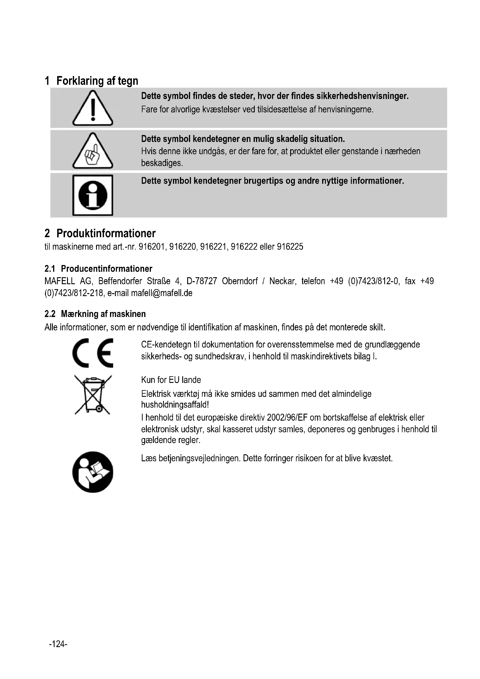 Fare Selv om produktet bruges korrekt, og sikkerhedsbestemmelserne overholdes, er anvendelsesmåden forbundet med tilbageværende risici, der kan være en sundhedsrisiko. - Berøring af det udragende savblad i udgangspositionen under føringsskinnen, når maskinen startes. - Berøring af savbladets udragende del under emnet under savearbejdet og efter skæreende, hvis skyderen ikke er indstillet rigtigt, til automatisk opkørsel i hvileposition. - Nedadvipning af maskinen hvis den udragende føringsskinne ikke støttes tilstrækkeligt bag ved det emne, der skal skæres i. - Berøring af følgende dele, der bevæger sig, fra siden. Savbladets grundmodel, spånflange og flangeskrue. - Brud og udslyngning af savbladet eller dele af savbladet. - Berøring af spændingsførende dele, hvis huset er åbent og netstikket ikke er trukket ud. - Kvæstelse på de skarpe savbladstænder i forbindelse med skift af savblad. - Hørelsen kan forringes, hvis der arbejdes i længere tid uden høreværn - Under længerevarende drift uden udsugning er der fare for udslip af sundhedsskadeligt træstøv. 3 Sikkerhedshenvisninger Fare Tag altid hensyn til de efterfølgende sikkerhedshenvisninger og de gældende sikkerhedsbestemmelser i landet! Læs også sikkerhedshenvisninger i det vedlagte hæfte "Sikkerhedshenvisninger". Generelle henvisninger: - Børn og unge må ikke betjene maskinen. Dette gælder ikke for unge i sammenhæng med en uddannelse, under opsyn af fagpersonale. - Du må aldrig arbejde med maskinen uden de foreskrevne beskyttelsesanordninger, du må ikke ændre sikkerhedsrelevante ting ved maskinen. - Ved udendørs brug af maskinen anbefales det at anvende et fejlstrømrelæ. - Beskadigede ledninger og stik skal udskiftes med det samme. Udskiftningen må kun gennemføres af Mafell eller på et autoriseret MAFELL- kundeserviceværksted for at undgå sikkerhedsfarer. - Undgå skarpe knæk i ledningen. Især under transport og lagring af maskinen må ledningen ikke vikles omkring maskinen. Du må ikke anvende: - Savblade med rids eller med ændret form. - Savblad af højt legeret hurtigstål (HSS-savblad).-128- - Uskarpe savblade pga. øget belastning af motoren. - Savblade, hvis basisdel er tykkere eller hvis skærebredde (udlægning) er mindre end spalteknivens tykkelse. - Savblade, som ikke er egnet til savbladets omdrejningstal i tomgang. Henvisninger vedr. brug af personlige værnemidler - Brug altid dine personlige værnemidler, når du arbejder med maskinen: Høreværn, støvmaske, sikkerhedsbriller og -handsker. Henvisninger vedr. drift: - Sørg for, at der ikke befinder sig andre personer i savområdet, når maskinen er i drift. - Sørg for, at du ikke kommer ind i savens område eller til savbladet med hænderne. Hold på ekstra grebet eller motorhuset med den anden hånd. - Grib ikke ind under emnet. - Tilpas skæredybden til emnets tykkelse. - Hold aldrig emnet fast i hånden eller ovenover benet. Emnet skal sikres på et stabilt underlag. - Hold kun på apparatet på de isolerede greb under arbejdet, hvor der er fare for at skære i gemte strømledninger eller apparatets egen ledning. - Brug altid savblade i den rigtige størrelse og med passende holdeboring (f.eks. rombeformet eller rund). - Anvend aldrig beskadigede eller forkerte savblad afstandsskiver eller skruer. - Hold saven fast med begge hænder og armene i position til at optage tilbagestød. Ophold dig altid ved siden af savbladet, stå aldrig i en linje med savbladet. - Hvis savbladet klemmer eller savningen afbrydes af en anden grund, slippes on/off kontakten. Hold saven i emnet, indtil savbladet står stille. Forsøg aldrig at fjerne saven ud af emnet eller at trække den bagud, sålænge savbladet drejer, eller der er fare for tilbagestød. - Hvis du vil starte en sav igen, som befinder sig i emnet, skal savbladet centreres i savspalten og kontrollér, om savetænderne ikke sidder fast. - Støt store plader, for at mindske risikoen for tilbagestød pga. et klemmende savblad. - Brug aldrig sløve eller beskadigede savblade. - Træk skæredybde- og skærevinkelindstillingen fast, før du saver. - Vær meget forsigtig, hvis du laver en ”dyksavning” indenfor et skjult område. - Brug savbladet, der passer til kløvekilen. - Juster spaltekilen som beskrevet i driftsvejledningen. - Brug altid kløvekilen, undtaget ved "dykkesnit“. - Kløvekilen skal være i savspalten for at kunne fungere. - Brug ikke saven, hvis kløvekilen er bøjet. - Kontrollér emnet for fremmedelementer. Du må ikke save ind i metaldele, f.eks. søm. - Vælg det rigtige savblad og fremføringshastigheden vha. diagrammet på betjeningspulten - afhængigt af det materiale, der skal saves i. - Indstil skyderen til styring af afbrydelsen af den fremførende bevægelse og den automatiske start af saveaggregatet i hvilepositionen korrekt på det emne, der skal saves i (emnelængde + 120 mm). - Stik aldrig fingrene ind under emnet under savearbejdet (fare for kvæstelser!). - Sørg altid for, at tilslutningskablet er ført væk fra maskinen bagud under savearbejdet. - Sluk ikke for maskinen ved at trække stikket ud, mens driftskontakten er trykket ned. - Fjern først systemet fra emnet, når savbladet er standset og saveaggregatet er kørt tilbage i udgangspositionen. - Spåntagende bearbejdning af fibercementplader er kun mulig med et diamantsavblad. Henvisninger vedr. vedligeholdelse og reparation: - Den regelmæssige rensning af maskinen, især af justéranordningen og føringen, har en stor sikkerhedsmæssig betydning. - Der må udelukkende anvendes originale MAFELL- reservedele og tilbehør. I modsat fald ydes ingen garanti og producenten hæfter ikke for produktet.-129- 4 Klargøring / indstilling