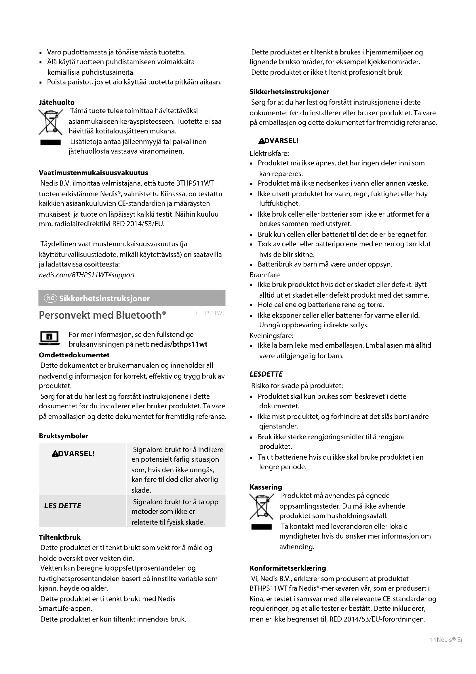 Sikkerhedsinstruktioner Bluetooth® personvægt BTHPS11WT Yderligere oplysninger ndes i den udvidede manual online: ned.is/bthps11wt Om dette dokument Dette dokument udgør brugervejledningen og indeholder alle oplysninger til korrekt, eektiv og sikker anvendelse af produktet. Sørg for, at du har læst og forstået instruktionerne i dette dokument fuldt ud, før du installerer eller bruger produktet. Gem emballagen og dette dokument, så det sidenhen kan læses. Anvendte symboler ADVARSEL! Signalord, der bruges til at angive en potentielt farlig situation, som, hvis den ikke undgås, kan resultere i død eller alvorlig personskade. BEMÆRK Signalord, der bruges til at adressere praksis, der ikke er relateret til fysisk skade. Tilsigtet brug Dette produkt er tænkt som en vægt til at måle og registrere din vægt. Vægten kan beregne kropsfedtprocent og hydreringsprocent baseret på indstillede parametre som køn, højde og alder. Dette produkt er beregnet til at blive brugt med Nedis SmartLife-app. Dette produkt er kun beregnet til indendørs brug. Dette produkt er beregnet til husholdningsbrug og lignende anvendelser, såsom i køkkenområder. Dette produkt er ikke beregnet til professionel brug. Sikkerhedsinstruktioner Sørg for, at du har læst og forstået instruktionerne i dette dokument fuldt ud, før du installerer eller bruger produktet. Gem emballagen og dette dokument, så det sidenhen kan læses. ADVARSEL! Elektrisk fare: