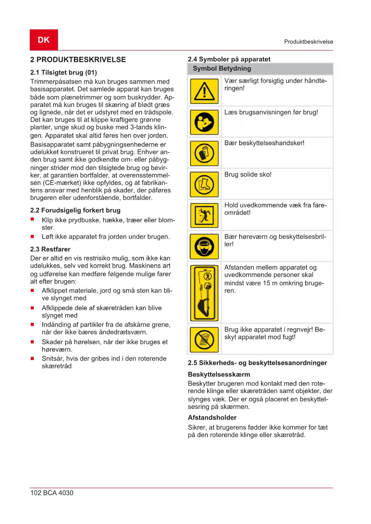 Trimmerpåsatsen må kun bruges sammen med basisapparatet. Det samlede apparat kan bruges både som plænetrimmer og som buskrydder. Apparatet må kun bruges til skæring af blødt græs og lignede, når det er udstyret med en trådspole. Det kan bruges til at klippe kraftigere grønne planter, unge skud og buske med 3-tands klingen. Apparatet skal altid føres hen over jorden. Basisapparatet samt påbygningsenhederne er udelukket konstrueret til privat brug. Enhver anden brug samt ikke godkendte om- eller påbygninger strider mod den tilsigtede brug og bevirker, at garantien bortfalder, at overensstemmelsen (CE-mærket) ikke opfyldes, og at fabrikan-tens ansvar med henblik på skader, der påføres brugeren eller udenforstående, bortfalder.
