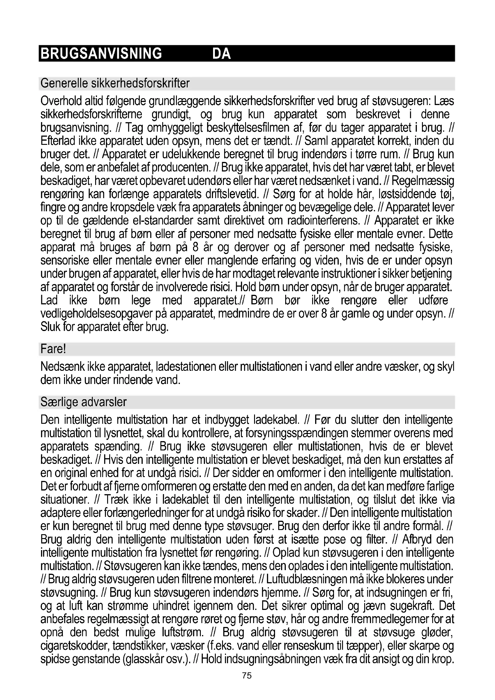 74BRUGSANVISNING DA Generelle sikkerhedsforskrifter Overhold altid følgende grundlæggende sikkerhedsforskrifter ved brug af støvsugeren: Læs sikkerhedsforskrifterne grundigt, og brug kun apparatet som beskrevet i denne brugsanvisning. // Tag omhyggeligt beskyttelsesfilmen af, før du tager apparatet i brug. // Efterlad ikke apparatet uden opsyn, mens det er tændt. // Saml apparatet korrekt, inden du bruger det. // Apparatet er udelukkende beregnet til brug indendørs i tørre rum. // Brug kun dele, som er anbefalet af producenten. // Brug ikke apparatet, hvis det har været tabt, er blevet beskadiget, har været opbevaret udendørs eller har været nedsænket i vand. // Regelmæssig rengøring kan forlænge apparatets driftslevetid. // Sørg for at holde hår, løstsiddende tøj, fingre og andre kropsdele væk fra apparatets åbninger og bevægelige dele. // Apparatet lever op til de gældende el-standarder samt direktivet om radiointerferens. // Apparatet er ikke beregnet til brug af børn eller af personer med nedsatte fysiske eller mentale evner. Dette apparat må bruges af børn på 8 år og derover og af personer med nedsatte fysiske, sensoriske eller mentale evner eller manglende erfaring og viden, hvis de er under opsyn under brugen af apparatet, eller hvis de har modtaget relevante instruktioner i sikker betjening af apparatet og forstår de involverede risici. Hold børn under opsyn, når de bruger apparatet. Lad ikke børn lege med apparatet.// Børn bør ikke rengøre eller udføre vedligeholdelsesopgaver på apparatet, medmindre de er over 8 år gamle og under opsyn. // Sluk for apparatet efter brug. Fare! Nedsænk ikke apparatet, ladestationen eller multistationen i vand eller andre væsker, og skyl dem ikke under rindende vand. Særlige advarsler Den intelligente multistation har et indbygget ladekabel. // Før du slutter den intelligente multistation til lysnettet, skal du kontrollere, at forsyningsspændingen stemmer overens med apparatets spænding. // Brug ikke støvsugeren eller multistationen, hvis de er blevet beskadiget. // Hvis den intelligente multistation er blevet beskadiget, må den kun erstattes af en original enhed for at undgå risici. // Der sidder en omformer i den intelligente multistation. Det er forbudt af fjerne omformeren og erstatte den med en anden, da det kan medføre farlige situationer. // Træk ikke i ladekablet til den intelligente multistation, og tilslut det ikke via adaptere eller forlængerledninger for at undgå risiko for skader. // Den intelligente multistation er kun beregnet til brug med denne type støvsuger. Brug den derfor ikke til andre formål. // Brug aldrig den intelligente multistation uden først at isætte pose og filter. // Afbryd den intelligente multistation fra lysnettet før rengøring. // Oplad kun støvsugeren i den intelligente multistation. // Støvsugeren kan ikke tændes, mens den oplades i den intelligente multistation. // Brug aldrig støvsugeren uden filtrene monteret. // Luftudblæsningen må ikke blokeres under støvsugning. // Brug kun støvsugeren indendørs hjemme. // Sørg for, at indsugningen er fri, og at luft kan strømme uhindret igennem den. Det sikrer optimal og jævn sugekraft. Det anbefales regelmæssigt at rengøre røret og fjerne støv, hår og andre fremmedlegemer for at opnå den bedst mulige luftstrøm. // Brug aldrig støvsugeren til at støvsuge gløder, cigaretskodder, tændstikker, væsker (f.eks. vand eller renseskum til tæpper), eller skarpe og spidse genstande (glasskår osv.). // Hold indsugningsåbningen væk fra dit ansigt og din krop. 75// Brug aldrig støvsugeren til opsugning af byggematerialer såsom fint sand, kalk, cementstøv, printertoner osv. Det kan beskadige apparatet. Problemer og løsninger Problem Mulig årsag Løsning Fungerer ikke. Batteriet er fladt. Håndstøvsugeren er ikke samlet korrekt. Oplad. Saml håndstøvsugeren korrekt. Sugeevnen er reduceret. Støvbeholderen er fuld.filteret er blokeret. Indsugningsstudsen eller den elektriske børste er blokeret. Hæld støvet ud. Rengør eller udskift filteret. Rengør den elektriske børste. Håndstøvsugeren oplades ikke. Adapteren er ikke sat i en stikkontakt. Stikket fra opladeren er ikke sat i stikket på ladestationen. Håndstøvsugeren er ikke sat sammen med støvsugerkabinettet. Sæt opladeren I en stikkontakt. Sæt opladerens stik I ladestationen. Sæt håndstøvsugeren i støvsugerkabinettet. Brug den meget kort tid efter opladning. Har ikke ladet op længe nok. Batteriet er ved at være udtjent. Oplad jfr. brugsanvisningen. Udskift batteriet. Beskyttelse af miljøet Når apparatet er udtjent, må det ikke bortskaffes sammen med det almindelige husholdningsaffald. Indlever det i stedet til genvinding på din lokale genbrugsstation. På den måde er du med til at passe på miljøet.