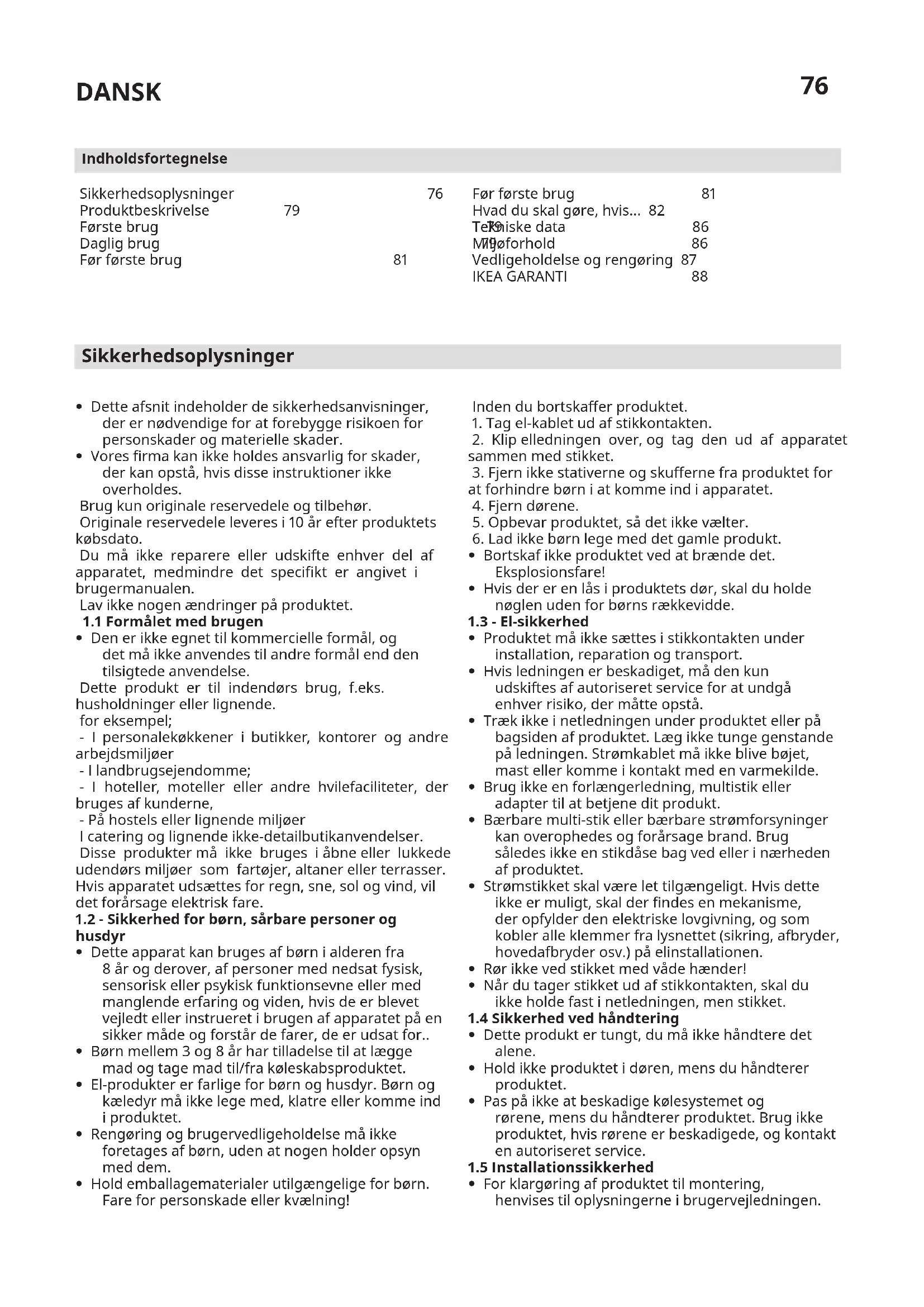 Sikkerhedsoplysninger 76 Produktbeskrivelse 79 Første brug 79 Daglig brug 79 Før første brug 81 Indholdsfortegnelse Før første brug 81 Hvad du skal gøre, hvis... 82 Tekniske data 86 Miljøforhold 86 Vedligeholdelse og rengøring 87 IKEA GARANTI 8877 DANSK Sørg endvidere for de fornødne vand- og strømtilslutninger. Hvis ikke, ring til en kvalificeret elektriker og blikkenslager for at få dem til at træffe de nødvendige foranstaltninger. Ellers kan der opstå elektriske stød, brande, problemer med produktet eller kvæstelser.