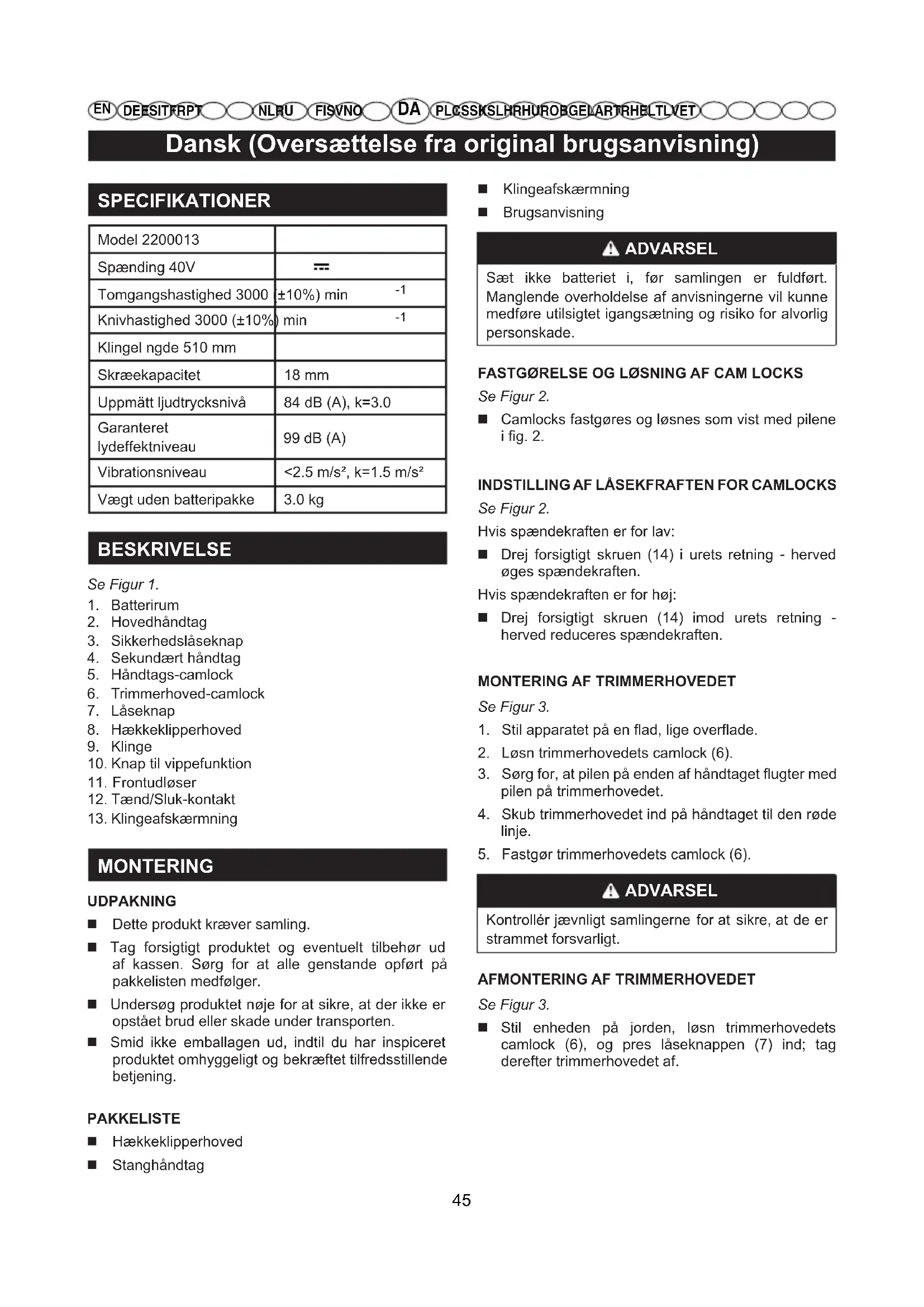 MONTERING UDPAKNING Dette produkt kræver samling. Tag forsigtigt produktet og eventuelt tilbehør ud af kassen. Sørg for at alle genstande opført på pakkelisten medfølger. Undersøg produktet nøje for at sikre, at der ikke er opstået brud eller skade under transporten. Smid ikke emballagen ud, indtil du har inspiceret produktet omhyggeligt og bekræftet tilfredsstillende betjening. PAKKELISTE Hækkeklipperhoved Stanghåndtag Klingeafskærmning Brugsanvisning ADVARSEL Sæt ikke batteriet i, før samlingen er fuldført. Manglende overholdelse af anvisningerne vil kunne medføre utilsigtet igangsætning og risiko for alvorlig personskade. FASTGØRELSE OG LØSNING AF CAM LOCKS Se Figur 2. Camlocks fastgøres og løsnes som vist med pilene i fig. 2.