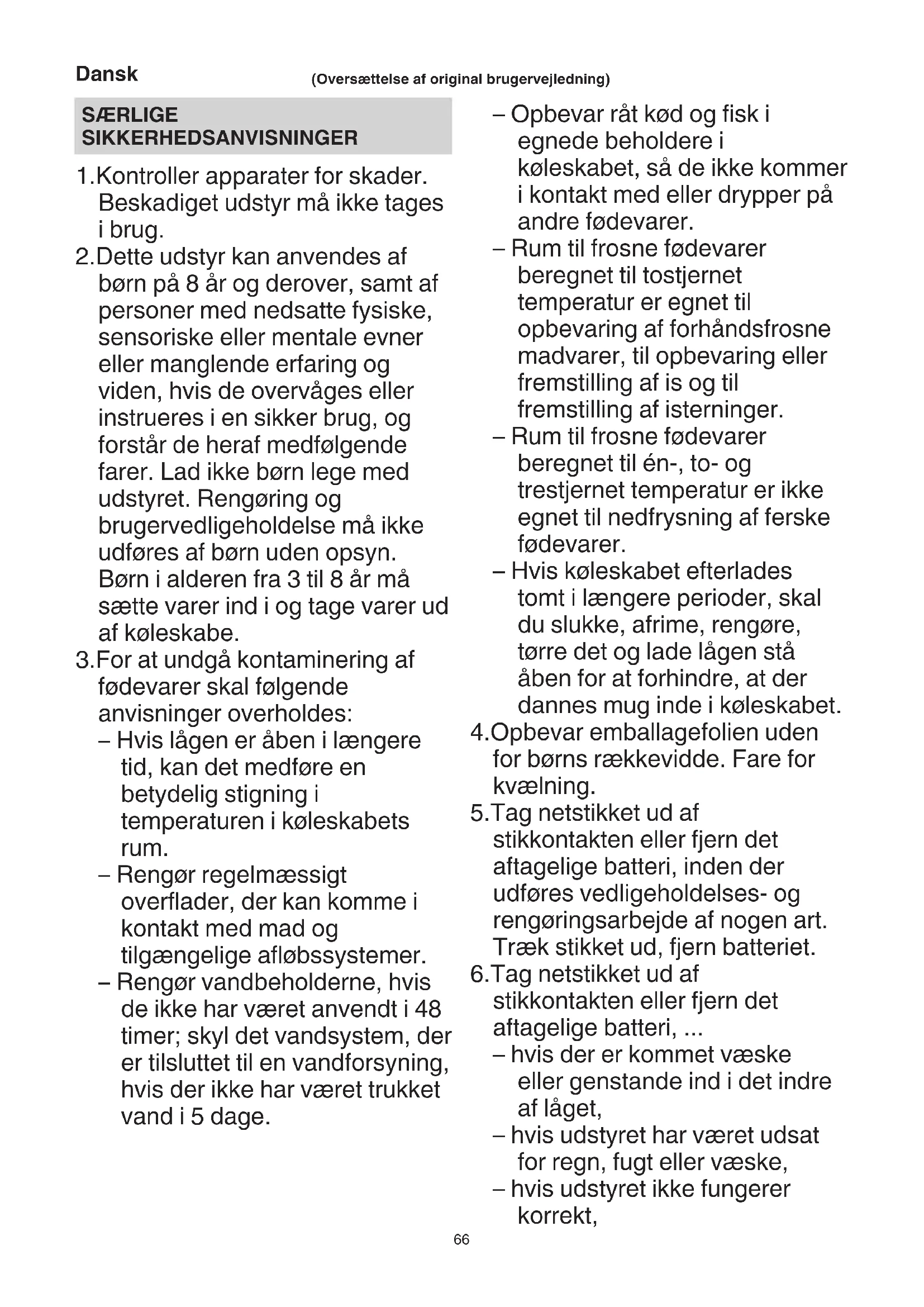SÆRLIGE SIKKERHEDSANVISNINGER 1.Kontroller apparater for skader. Beskadiget udstyr må ikke tages i brug. 2.Dette udstyr kan anvendes af børn på 8 år og derover, samt af personer med nedsatte fysiske, sensoriske eller mentale evner eller manglende erfaring og viden, hvis de overvåges eller instrueres i en sikker brug, og forstår de heraf medfølgende farer. Lad ikke børn lege med udstyret. Rengøring og brugervedligeholdelse må ikke udføres af børn uden opsyn. Børn i alderen fra 3 til 8 år må sætte varer ind i og tage varer ud af køleskabe. 3.For at undgå kontaminering af fødevarer skal følgende anvisninger overholdes: – Hvis lågen er åben i længere tid, kan det medføre en betydelig stigning i temperaturen i køleskabets rum. – Rengør regelmæssigt overflader, der kan komme i kontakt med mad og tilgængelige afløbssystemer. – Rengør vandbeholderne, hvis de ikke har været anvendt i 48 timer; skyl det vandsystem, der er tilsluttet til en vandforsyning, hvis der ikke har været trukket vand i 5 dage. – Opbevar råt kød og fisk i egnede beholdere i køleskabet, så de ikke kommer i kontakt med eller drypper på andre fødevarer. – Rum til frosne fødevarer beregnet til tostjernet temperatur er egnet til opbevaring af forhåndsfrosne madvarer, til opbevaring eller fremstilling af is og til fremstilling af isterninger. – Rum til frosne fødevarer beregnet til én-, to- og trestjernet temperatur er ikke egnet til nedfrysning af ferske fødevarer. – Hvis køleskabet efterlades tomt i længere perioder, skal du slukke, afrime, rengøre, tørre det og lade lågen stå åben for at forhindre, at der dannes mug inde i køleskabet. 4.Opbevar emballagefolien uden for børns rækkevidde. Fare for kvælning. 5.Tag netstikket ud af stikkontakten eller fjern det aftagelige batteri, inden der udføres vedligeholdelses- og rengøringsarbejde af nogen art. Træk stikket ud, fjern batteriet. 6.Tag netstikket ud af stikkontakten eller fjern det aftagelige batteri, ... – hvis der er kommet væske eller genstande ind i det indre af låget, – hvis udstyret har været udsat for regn, fugt eller væske, – hvis udstyret ikke fungerer korrekt, 2024/03/21 11:56:13Stylesheet: EU Ver 2024.3.12 UL18DF_C99750371_311_EUDansk
