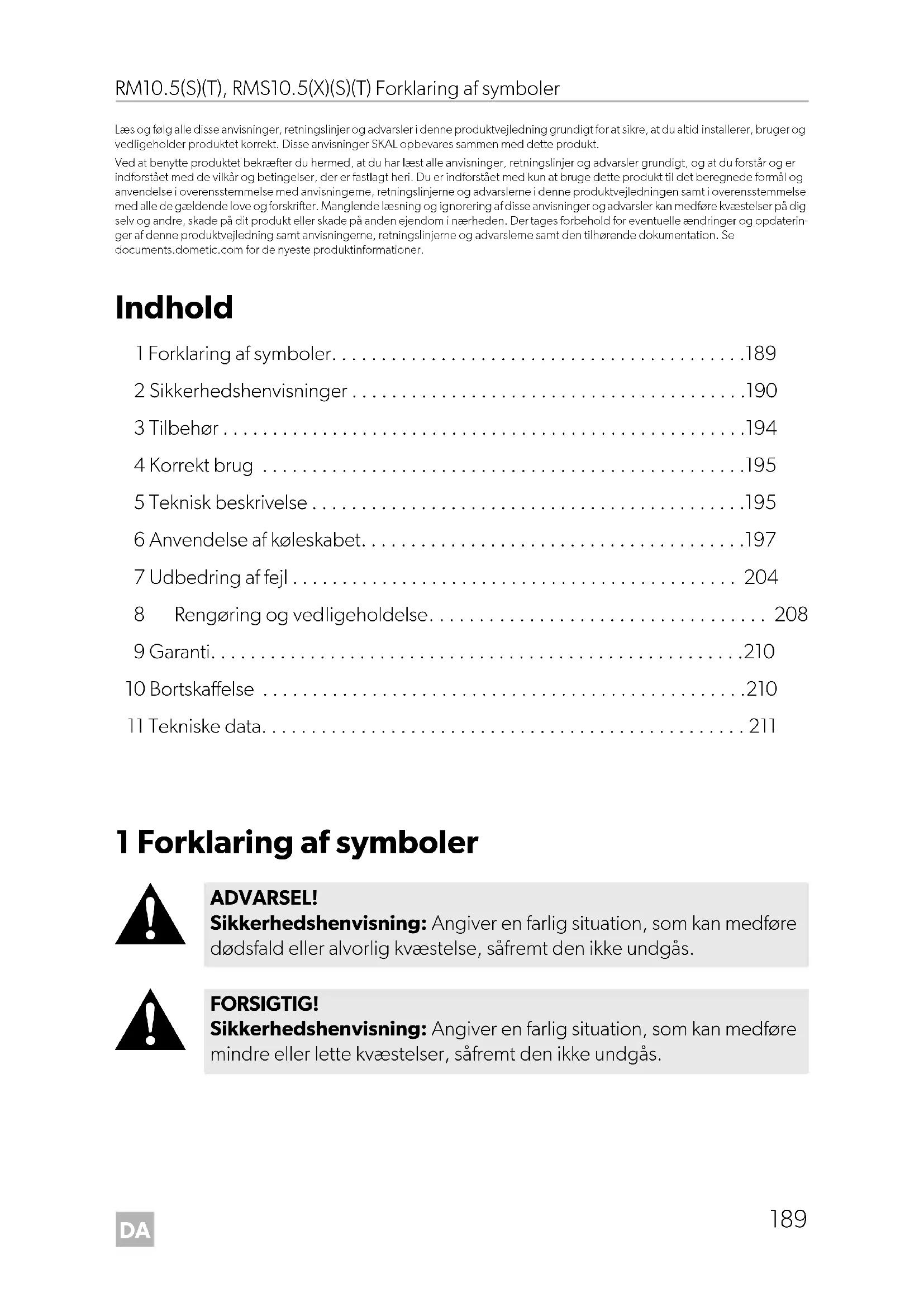 - Læs og følg alle disse anvisninger, retningslinjer og advarsler i denne produktvejledning grundigt for at sikre, at du altid installerer, bruger og vedligeholder produktet korrekt. Disse anvisninger SKAL opbevares sammen med dette produkt. Ved at benytte produktet bekræfter du hermed, at du har læst alle anvisninger, retningslinjer og advarsler grundigt, og at du forstår og er indforstået med de vilkår og betingelser, der er fastlagt heri. Du er indforstået med kun at bruge dette produkt til det beregnede formål og anvendelse i overensstemmelse med anvisningerne, retningslinjerne og advarslerne i denne produktvejledningen samt i overensstemmelse med alle de gældende love og forskrifter. Manglende læsning og ignorering af disse anvisninger og advarsler kan medføre kvæstelser på dig selv og andre, skade på dit produkt eller skade på anden ejendom i nærheden. Der tages forbehold for eventuelle ændringer og opdaterin- ger af denne produktvejledning samt anvisningerne, retningslinjerne og advarslerne samt den tilhørende dokumentation. Se documents.dometic.com for de nyeste produktinformationer. Indhold 1 Forklaring af symboler p. 189