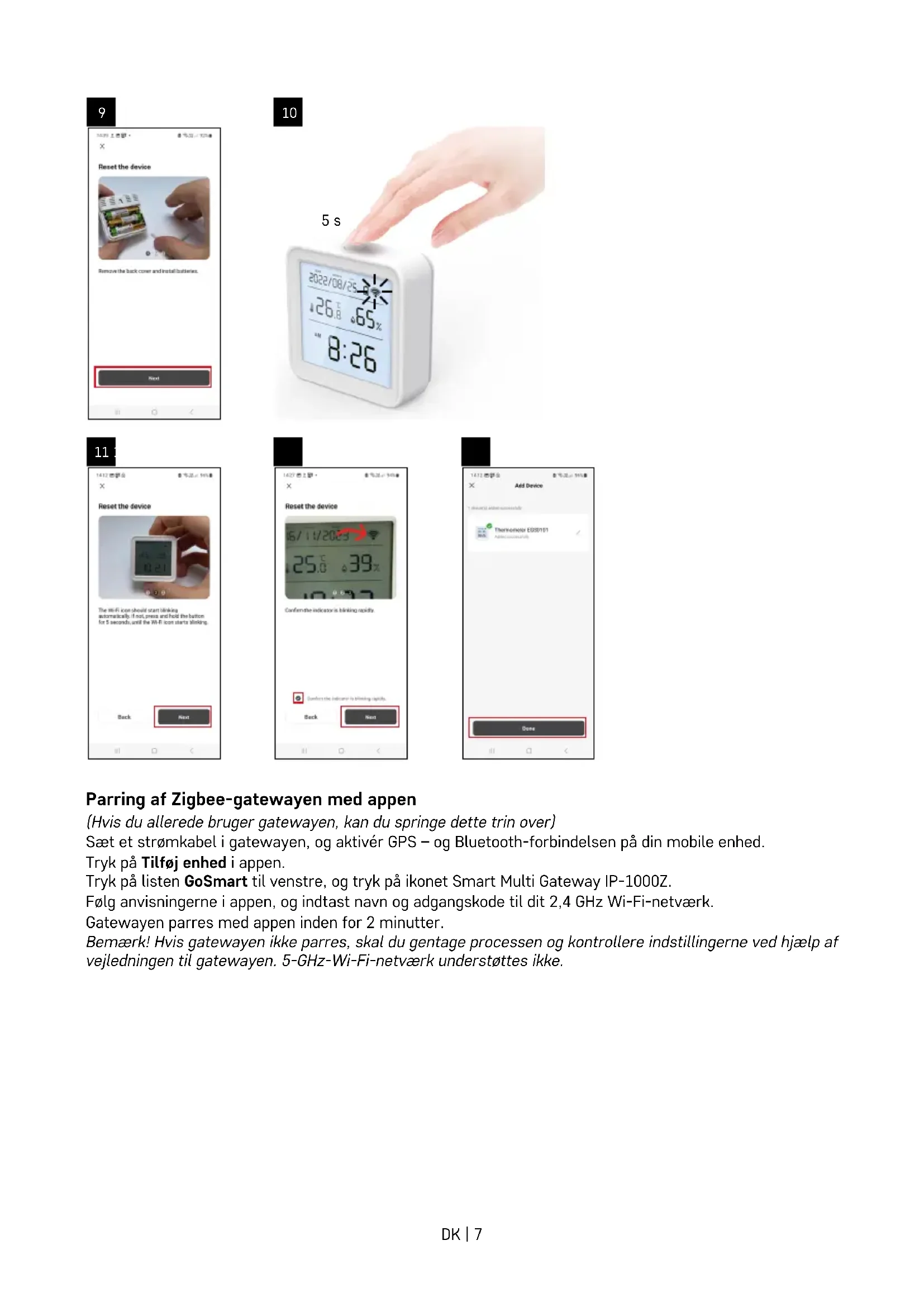 Parring af Zigbee-gatewayen med appen (Hvis du allerede bruger gatewayen, kan du springe dette trin over) Sæt et strømkabel i gatewayen, og aktivér GPS – og Bluetooth-forbindelsen på din mobile enhed. Tryk på Tilføj enhed i appen. Tryk på listen GoSmart til venstre, og tryk på ikonet Smart Multi Gateway IP-1000Z. Følg anvisningerne i appen, og indtast navn og adgangskode til dit 2,4 GHz Wi-Fi-netværk. Gatewayen parres med appen inden for 2 minutter. Bemærk! Hvis gatewayen ikke parres, skal du gentage processen og kontrollere indstillingerne ved hjælp af vejledningen til gatewayen. 5-GHz-Wi-Fi-netværk understøttes ikke.DK | 8 Parring af en enhed med en appen Når du sætter batterier i termometeret, begynder Wi-Fi-ikonet at blinke. Hvis Wi-Fi-ikonet ikke blinker, skal du trykke på parringsknappen i 5sekunder. Tryk på Tilføj enhed i appen. Tryk på GoSmart-listen til venstre og derefter på Thermo-Hygrometer EGS0101-ikonet. Følg anvisningerne i appen, og indtast navn og adgangskode til dit 2,4 GHz Wi-Fi-netværk. Parringen med appen er færdig inden for 2minutter; Wi--ikonet vises permanent på termometerets display. Bemærk! Gentag processen, hvis apparatet ikke kan parres. 5-GHz- Wi-Fi-netværk understøttes ikke. Isætning/udskiftning af batterier