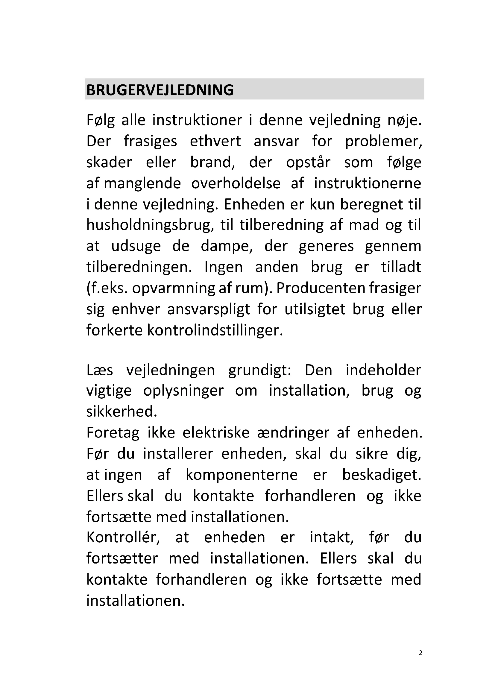 PRODUKTINSTALLATION ........................................................................................ 33 ELEKTRISK TILSLUTNING ........................................................................................ 362 BRUGERVEJLEDNING Følg alle instruktioner i denne vejledning nøje. Der frasiges ethvert ansvar for problemer, skader eller brand, der opstår som følge af manglende overholdelse af instruktionerne i denne vejledning. Enheden er kun beregnet til husholdningsbrug, til tilberedning af mad og til at udsuge de dampe, der generes gennem tilberedningen. Ingen anden brug er tilladt (f.eks. opvarmning af rum). Producenten frasiger sig enhver ansvarspligt for utilsigtet brug eller forkerte kontrolindstillinger. Læs vejledningen grundigt: Den indeholder vigtige oplysninger om installation, brug og sikkerhed. Foretag ikke elektriske ændringer af enheden. Før du installerer enheden, skal du sikre dig, at ingen af komponenterne er beskadiget. Ellers skal du kontakte forhandleren og ikke fortsætte med installationen. Kontrollér, at enheden er intakt, før du fortsætter med installationen. Ellers skal du kontakte forhandleren og ikke fortsætte med installationen.3
