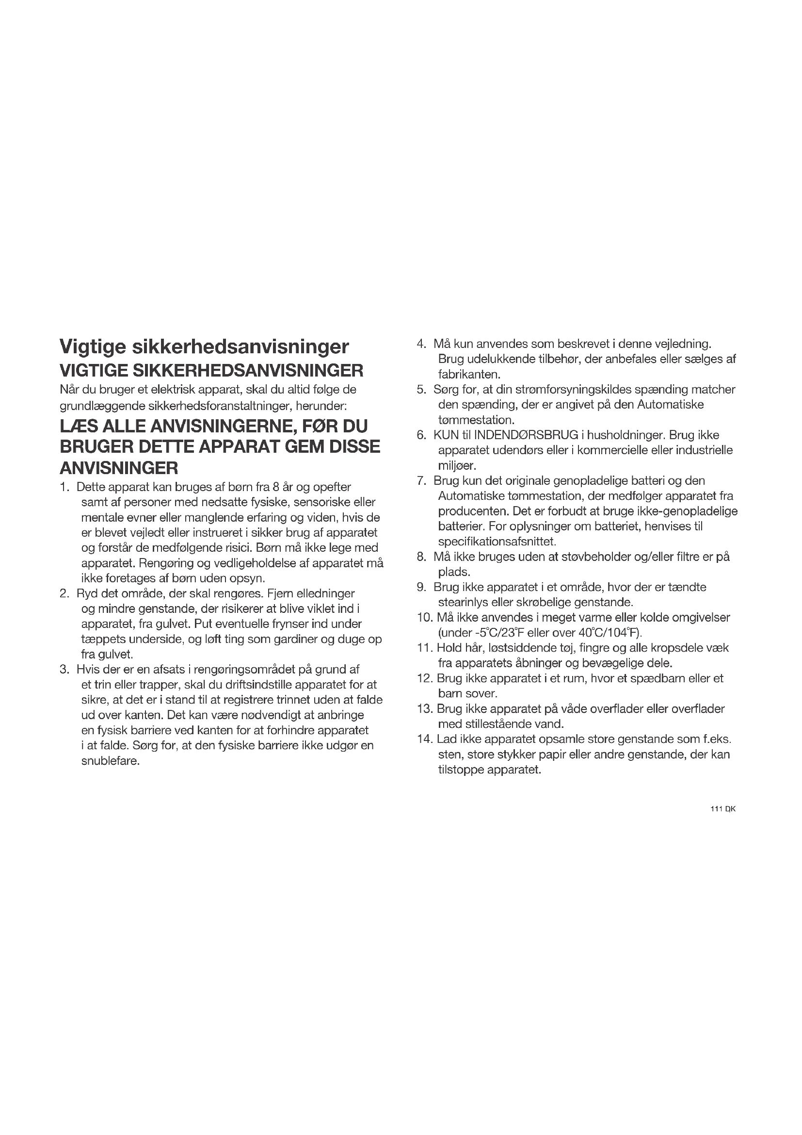 en beskadiget stikkontakt. Brug ikke apparatet eller den Automatiske tømmestation, hvis de ikke fungerer korrekt, er blevet tabt, beskadiget, efterladt udendørs eller er kommet i kontakt med vand. Den må kun repareres af fabrikanten eller dennes serviceværksted for at undgå enhver risiko.