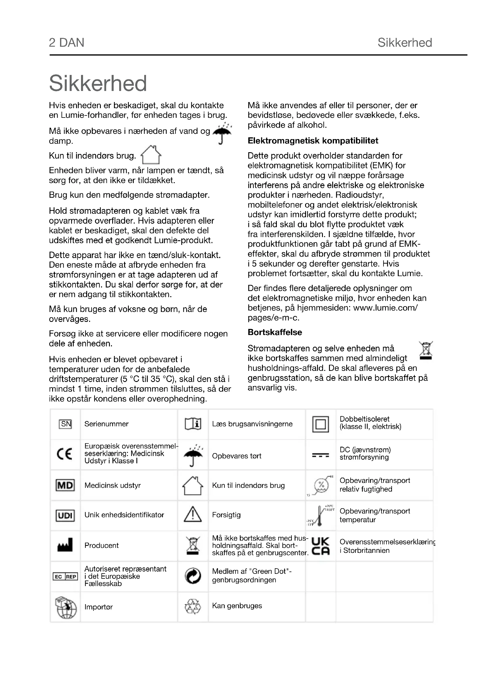 +70°C-25°C-13°F+158°F Importør Unik enhedsidentifikator Medicinsk udstyr Overensstemmelseserklæring i Storbritannien Sikkerhed Sikkerhed Hvis enheden er beskadiget, skal du kontakte en Lumie-forhandler, før enheden tages i brug. Må ikke opbevares i nærheden af vand og damp. Kun til indendørs brug. Enheden bliver varm, når lampen er tændt, så sørg for, at den ikke er tildækket. Brug kun den medfølgende strømadapter. Hold strømadapteren og kablet væk fra opvarmede overflader. Hvis adapteren eller kablet er beskadiget, skal den defekte del udskiftes med et godkendt Lumie-produkt. Dette apparat har ikke en tænd/sluk-kontakt. Den eneste måde at afbryde enheden fra strømforsyningen er at tage adapteren ud af stikkontakten. Du skal derfor sørge for, at der er nem adgang til stikkontakten. Må kun bruges af voksne og børn, når de overvåges. Forsøg ikke at servicere eller modificere nogen dele af enheden. Hvis enheden er blevet opbevaret i temperaturer uden for de anbefalede driftstemperaturer (5 °C til 35 °C), skal den stå i mindst 1 time, inden strømmen tilsluttes, så der ikke opstår kondens eller overophedning. Må ikke anvendes af eller til personer, der er bevidstløse, bedøvede eller svækkede, f.eks. påvirkede af alkohol. Elektromagnetisk kompatibilitet Dette produkt overholder standarden for elektromagnetisk kompatibilitet (EMK) for medicinsk udstyr og vil næppe forårsage interferens på andre elektriske og elektroniske produkter i nærheden. Radioudstyr, mobiltelefoner og andet elektrisk/elektronisk udstyr kan imidlertid forstyrre dette produkt; i så fald skal du blot flytte produktet væk fra interferenskilden. I sjældne tilfælde, hvor produktfunktionen går tabt på grund af EMK- effekter, skal du afbryde strømmen til produktet i 5 sekunder og derefter genstarte. Hvis problemet fortsætter, skal du kontakte Lumie. Der findes flere detaljerede oplysninger om det elektromagnetiske miljø, hvor enheden kan betjenes, på hjemmesiden: www.lumie.com/ pages/e-m-c. Bortskaffelse Strømadapteren og selve enheden må ikke bortskaffes sammen med almindeligt husholdnings-affald. De skal afleveres på en genbrugsstation, så de kan blive bortskaffet på ansvarlig vis.DAN 3 Introduktion Lumie Bodyclock vækker dig på en naturlig måde med en solopgang. At vågne ved hjælp af lys har vist sig at have en positiv indvirkning på humør, energi, produktivitet og kvalitet på søvn og opvågning.