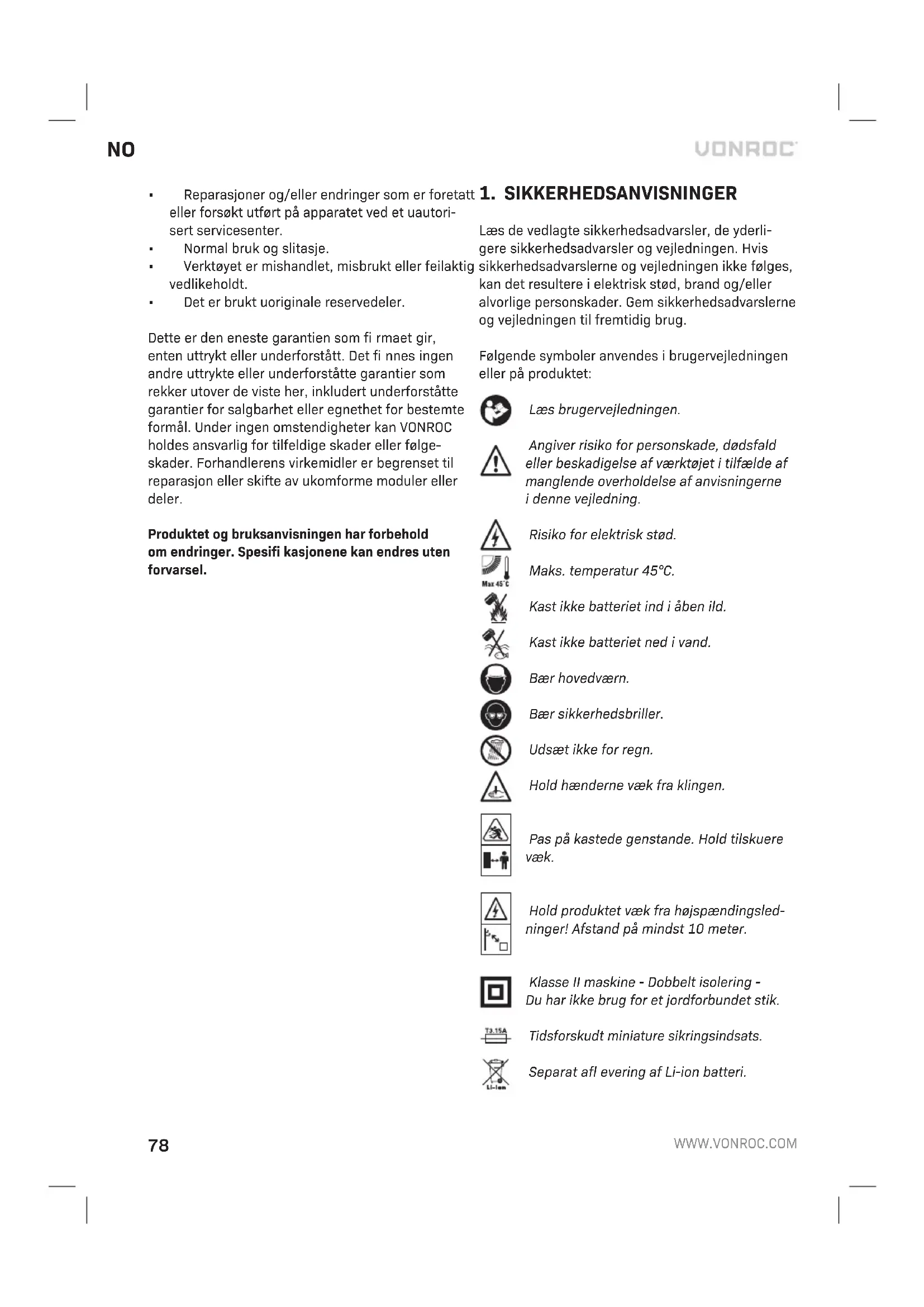 - Der er anvendt ikke-originale reservedele. Dette udgør den eneste garanti, virksomheden har givet, enten udtrykt eller underforstået. Der er ingen andre garantier, udtrykt eller underforstået, som strækker sig ud over denne, herunder de un- derforståede garantier for salgbarhed og egnethed til et bestemt formål. Under ingen omstændigheder skal VONROC holdes ansvarlig for tilfældige skader eller følgeskader. Forhandlerens retsmidler skal være begrænset til reparation eller udskiftning af enheder eller dele, der ikke overholder kravene. Produktet og brugervejledningen er genstand for ændringer. Specifi kationer kan ændres uden yderligere varsel.86