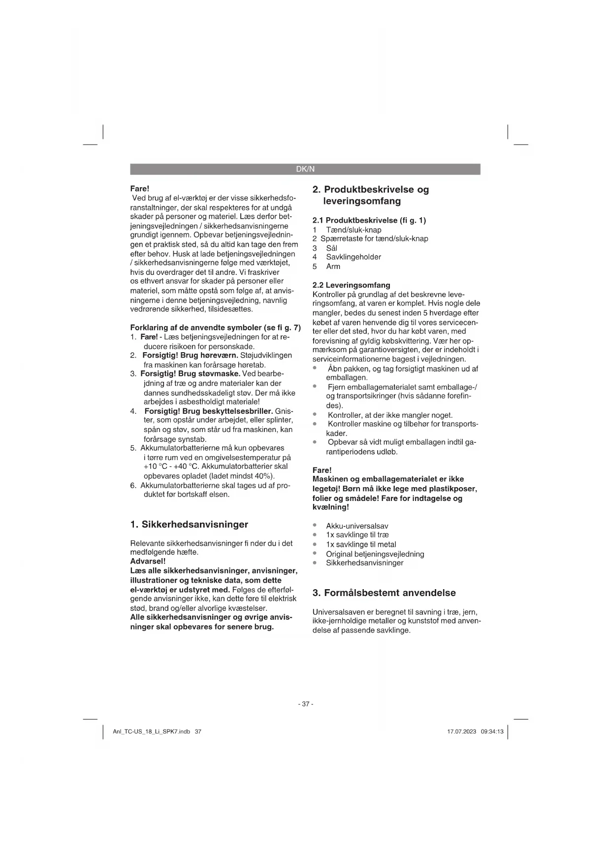vibration, såfremt værktøjet benyttes over et længere tidsrum eller ikke håndteres og vedli- geholdes forskriftsmæssigt. Anl_TC-US_18_Li_SPK7.indb 38Anl_TC-US_18_Li_SPK7.indb 38 17.07.2023 09:34:1317.07.2023 09:34:13DK/N