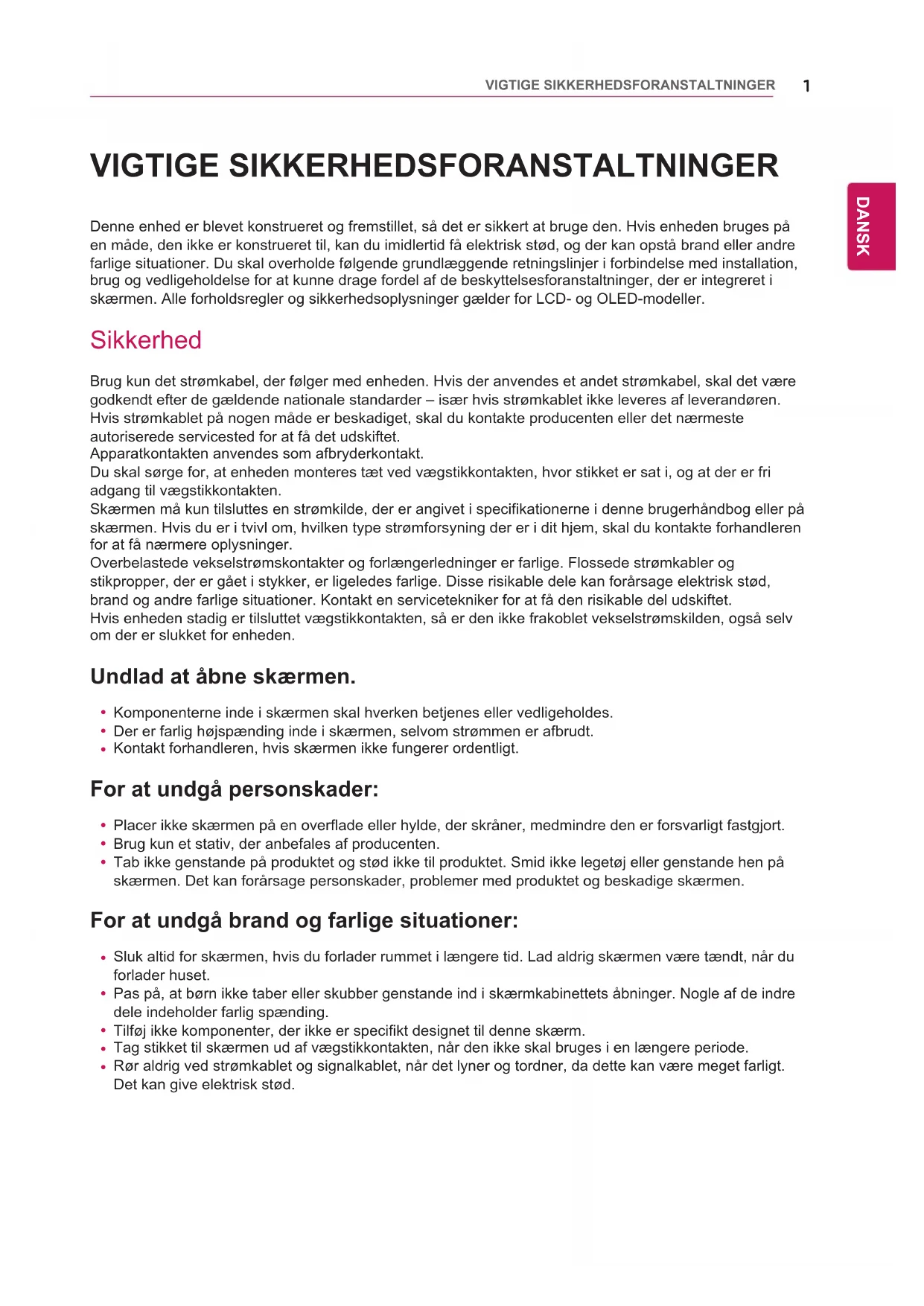 ENG DANSKVIGTIGE SIKKERHEDSFORANSTALTNINGER VIGTIGE SIKKERHEDSFORANSTALTNINGER Denne enhed er blevet konstrueret og fremstillet, så det er sikkert at bruge den. Hvis enheden bruges på en måde, den ikke er konstrueret til, kan du imidlertid få elektrisk stød, og der kan opstå brand eller andre farlige situationer. Du skal overholde følgende grundlæggende retningslinjer i forbindelse med installation, brug og vedligeholdelse for at kunne drage fordel af de beskyttelsesforanstaltninger, der er integreret i skærmen. Alle forholdsregler og sikkerhedsoplysninger gælder for LCD- og OLED-modeller. Sikkerhed Brug kun det strømkabel, der følger med enheden. Hvis der anvendes et andet strømkabel, skal det være godkendt efter de gældende nationale standarder – især hvis strømkablet ikke leveres af leverandøren. Hvis strømkablet på nogen måde er beskadiget, skal du kontakte producenten eller det nærmeste autoriserede servicested for at få det udskiftet.Apparatkontakten anvendes som afbryderkontakt.Du skal sørge for, at enheden monteres tæt ved vægstikkontakten, hvor stikket er sat i, og at der er fri adgang til vægstikkontakten. Skærmen må kun tilsluttes en strømkilde, der er angivet i specifikationerne i denne brugerhåndbog eller på skærmen. Hvis du er i tvivl om, hvilken type strømforsyning der er i dit hjem, skal du kontakte forhandleren for at få nærmere oplysninger.Overbelastede vekselstrømskontakter og forlængerledninger er farlige. Flossede strømkabler og stikpropper, der er gået i stykker, er ligeledes farlige. Disse risikable dele kan forårsage elektrisk stød, brand og andre farlige situationer. Kontakt en servicetekniker for at få den risikable del udskiftet.Hvis enheden stadig er tilsluttet vægstikkontakten, så er den ikke frakoblet vekselstrømskilden, også selv om der er slukket for enheden. Undlad at åbne skærmen.