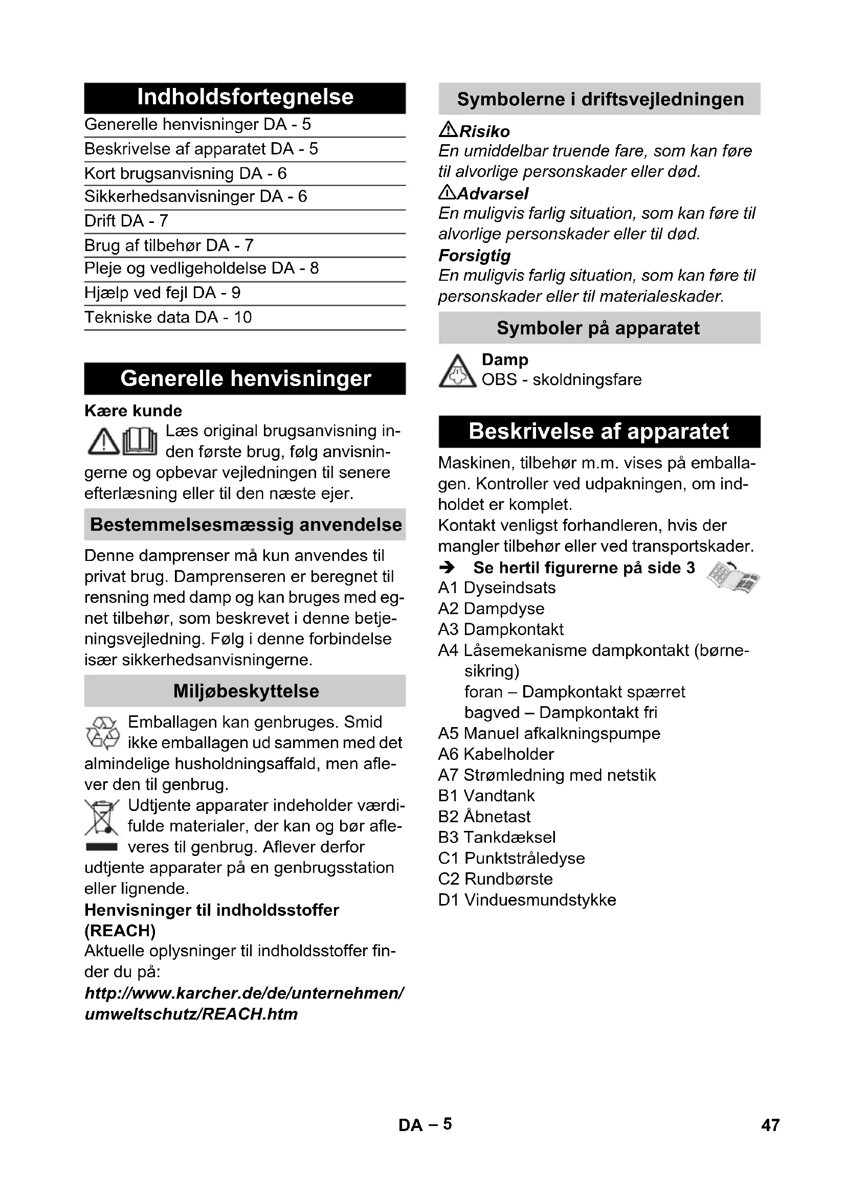 Classe de protecção I Grau de protecção IPX4 Dados relativos à potência Potência de aquecimento 1600 W Dimensões Reservatório de água 0,25 l Peso (sem acessórios) 1,2 kg Largura 190 mm Comprimento 100 mm Altura 280 mm Acessórios especiais Nº de encomenda Conjunto de escova circular 2.863-058 4 escovas circulares para o bico de ponto de jacto Conjunto de escova circular com cerdas de latão 2.863-061 para a remoção de sujidade forte. Ideal para superfícies não sensíveis. Escova circular com raspador2.863-140 Escova circular com duas filas de cerdas resistentes ao calor e um raspador. Inade- quado para superfícies sensíveis. Descalcificadores 6.295-047 46 PT– 5 Kære kunde Læs original brugsanvisning in- den første brug, følg anvisnin- gerne og opbevar vejledningen til senere efterlæsning eller til den næste ejer. Denne damprenser må kun anvendes til privat brug. Damprenseren er beregnet til rensning med damp og kan bruges med eg- net tilbehør, som beskrevet i denne betje- ningsvejledning. Følg i denne forbindelse især sikkerhedsanvisningerne. Emballagen kan genbruges. Smid ikke emballagen ud sammen med det almindelige husholdningsaffald, men afle- ver den til genbrug. Udtjente apparater indeholder værdi- fulde materialer, der kan og bør afle- veres til genbrug. Aflever derfor udtjente apparater på en genbrugsstation eller lignende. Henvisninger til indholdsstoffer (REACH) Aktuelle oplysninger til indholdsstoffer fin- der du på: http://www.karcher.de/de/unternehmen/ umweltschutz/REACH.htm Risiko En umiddelbar truende fare, som kan føre til alvorlige personskader eller død. 몇 Advarsel En muligvis farlig situation, som kan føre til alvorlige personskader eller til død. Forsigtig En muligvis farlig situation, som kan føre til personskader eller til materialeskader. Damp OBS - skoldningsfare Maskinen, tilbehør m.m. vises på emballa- gen. Kontroller ved udpakningen, om ind- holdet er komplet. Kontakt venligst forhandleren, hvis der mangler tilbehør eller ved transportskader. Î Se hertil figurerne på side 3 Indholdsfortegnelse Generelle henvisninger DA - 5 Beskrivelse af apparatet DA - 5 Kort brugsanvisning DA - 6 Sikkerhedsanvisninger DA - 6 Drift DA - 7 Brug af tilbehør DA - 7 Pleje og vedligeholdelse DA - 8 Hjælp ved fejl DA - 9 Tekniske data DA - 10 Generelle henvisninger Bestemmelsesmæssig anvendelse Miljøbeskyttelse Symbolerne i driftsvejledningen Symboler på apparatet Beskrivelse af apparatet A1 Dyseindsats A2 Dampdyse A3 Dampkontakt A4 Låsemekanisme dampkontakt (børne- sikring) foran – Dampkontakt spærret bagved – Dampkontakt fri A5 Manuel afkalkningspumpe A6 Kabelholder A7 Strømledning med netstik B1 Vandtank B2 Åbnetast B3 Tankdæksel C1 Punktstråledyse C2 Rundbørste D1 Vinduesmundstykke 47DA– 6 Î Se hertil figurerne på side 4 1 Tag vandtanken af. 2 Tag tankdækslet af. 3 Fyld vandtanken og luk tankdækslet. 4 Fastgør vandtanken. 5 Sæt netstikket i. Efter cirka 15 sekunder er damprense- ren klar til brug. 6 Pres låsemekanismen bagud og tryk på dampkontakten. Risiko Det er forbudt at bruge højtryksrense- ren i områder, hvor der er eksplosions- fare. Ved anvendelse af damprenseren i fa- reområder skal de relevante sikker- hedsforskrifter overholdes. Renseren må ikke bruges i svømme- bassiner som indeholder vand. Renseren må ikke bruges til rengøring af el-apparater, f.eks. bageovne, em- hætter, mikrobølgeovne, fjernsyn, lam- per, føntørrer, el-radiatorer osv. Kontroller at renser og tilbehør er kor- rekt og i orden før brug. Hvis renseren ikke er i en fejlfri tilstand, må den ikke benyttes. Kontroller venligst specielt til- slutningsledningen, sikkerhedslåset og dampslangen. En beskadiget tilslutningsledning skal omgående udskiftes af en autoriseret kundeserviceafdeling/el-installatør. Udskift beskadigede dampslanger med det samme. Der må kun anvendes en af producenten anbefalet dampslange (bestillingsnr. se reservedelsliste). Rør aldrig ved netstik og stikkontakt med fugtige hænder. Afdamp ikke genstande, der indeholder sundhedstruende stoffer (f.eks. as- best). Berør aldrig dampstrålen med hånden på nært hold og ret den aldrig mod men- nesker eller dyr (skoldningsfare). 몇 Advarsel Højtryksrenseren skal altid tilsluttes et elek- trisk stik, der er installeret af en elektriker iht. IEC 603064. Højtryksrenseren må kun sluttes til veksel- strøm. Spændingen skal svare til angivel- sen på typeskiltet. Tilslut damprenseren til stikdåser med til- koblet FI-sikkerhedsafbryder i vådrum, f.eks. badeværelser. Uegnede forlængerledninger kan være far- lige. Anvend kun stænkvandsbeskyttet for- længerkabel med en min. diameter på 3x1 mm². Forbindelsen mellem net- og forlængerka- blet må ikke ligge i vand. Ved udskiftning af tilkoblinger på strøm- el- ler forlængerledninger skal stænkvandsbe- skyttelsen og den mekaniske styrke forblive intakt. Brugeren skal anvende højtryksrenseren iht. dens anvendelsesformål. Han skal tage hensyn til de lokale forhold og holde øje med, om der er personer i nærheden, når han arbejder med højtryksrenseren. Dette apparat er ikke beregnet til brug af personer (inklusive børn) med indskrænke- de fysiske, sensoriske eller åndelige evner eller som ikke har erfaringer med brugen og/eller kendskab til brugen, med mindre de er under opsyn af en person som er an- svarligt for deres sikkerhed eller blev anvist i brugen af apparatet. Børn skal være under opsyn for at sørge for, at de ikke leger med apparatet. Lad aldrig højtryksrenseren være uden op- syn, mens den er i drift. Vær forsigtig ved rengøring af flisebelagte vægge med stikdåser. Forsigtig Undgå at køre over, klemme, rive eller lign. i net- eller forlængerledninger, da dette ødelægger eller beskadiger dem. Beskyt netledningerne mod varme, olie og skarpe kanter. Hæld aldrig opløsningsmidler, opløsnings- holdige væsker eller ufortyndede syrer (f.eks. rengøringsmidler, benzin, fa