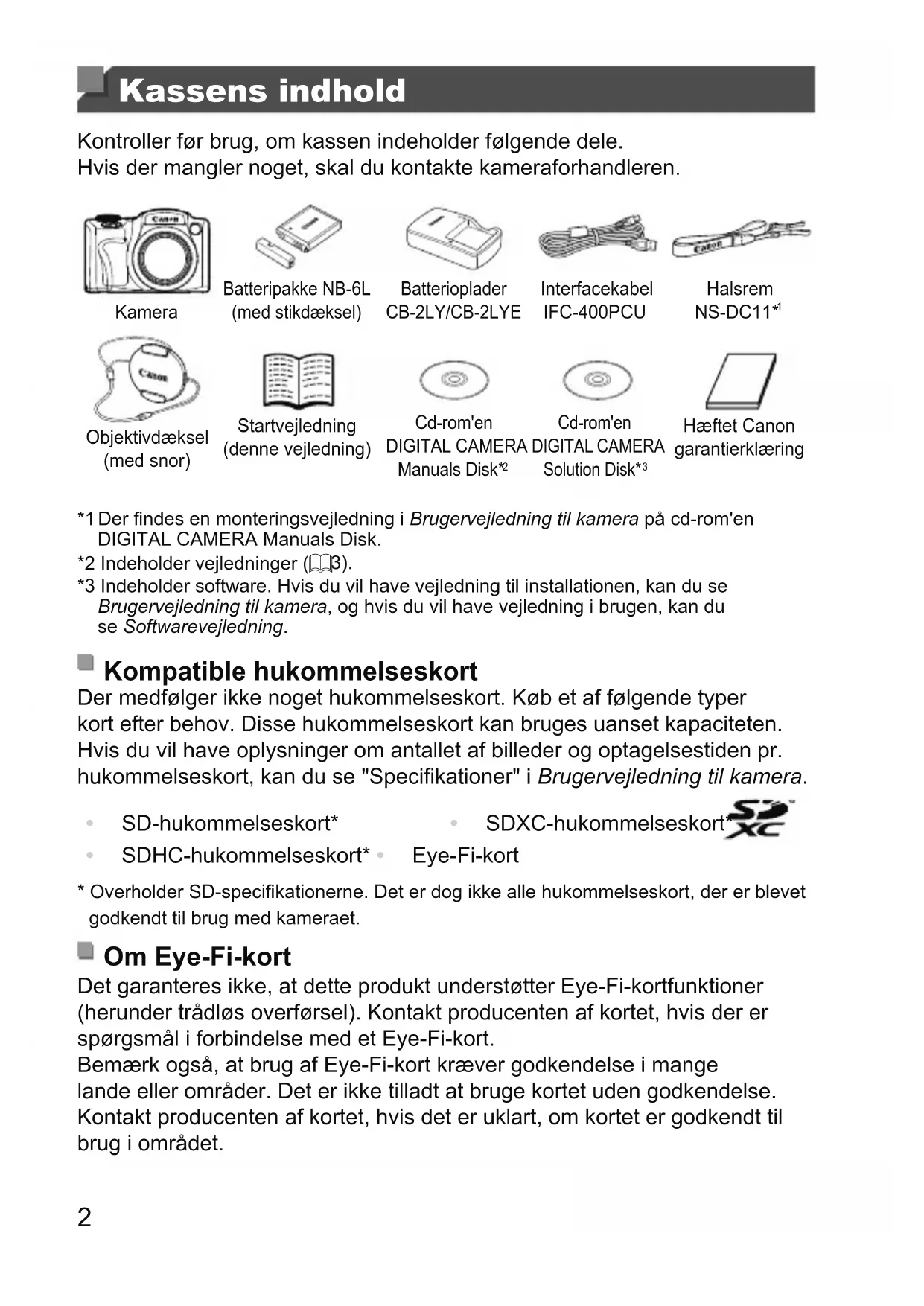 Hæftet Canon garantierklæring *1 Der ndes en monteringsvejledning i Brugervejledning til kamera på cd-rom'en DIGITAL CAMERA Manuals Disk. *2 Indeholder vejledninger (= 3). *3 Indeholder software. Hvis du vil have vejledning til installationen, kan du se Brugervejledning til kamera, og hvis du vil have vejledning i brugen, kan du se Softwarevejledning. Kompatible hukommelseskort Der medfølger ikke noget hukommelseskort. Køb et af følgende typer kort efter behov. Disse hukommelseskort kan bruges uanset kapaciteten. Hvis du vil have oplysninger om antallet af billeder og optagelsestiden pr. hukommelseskort, kan du se "Specikationer" i Brugervejledning til kamera.