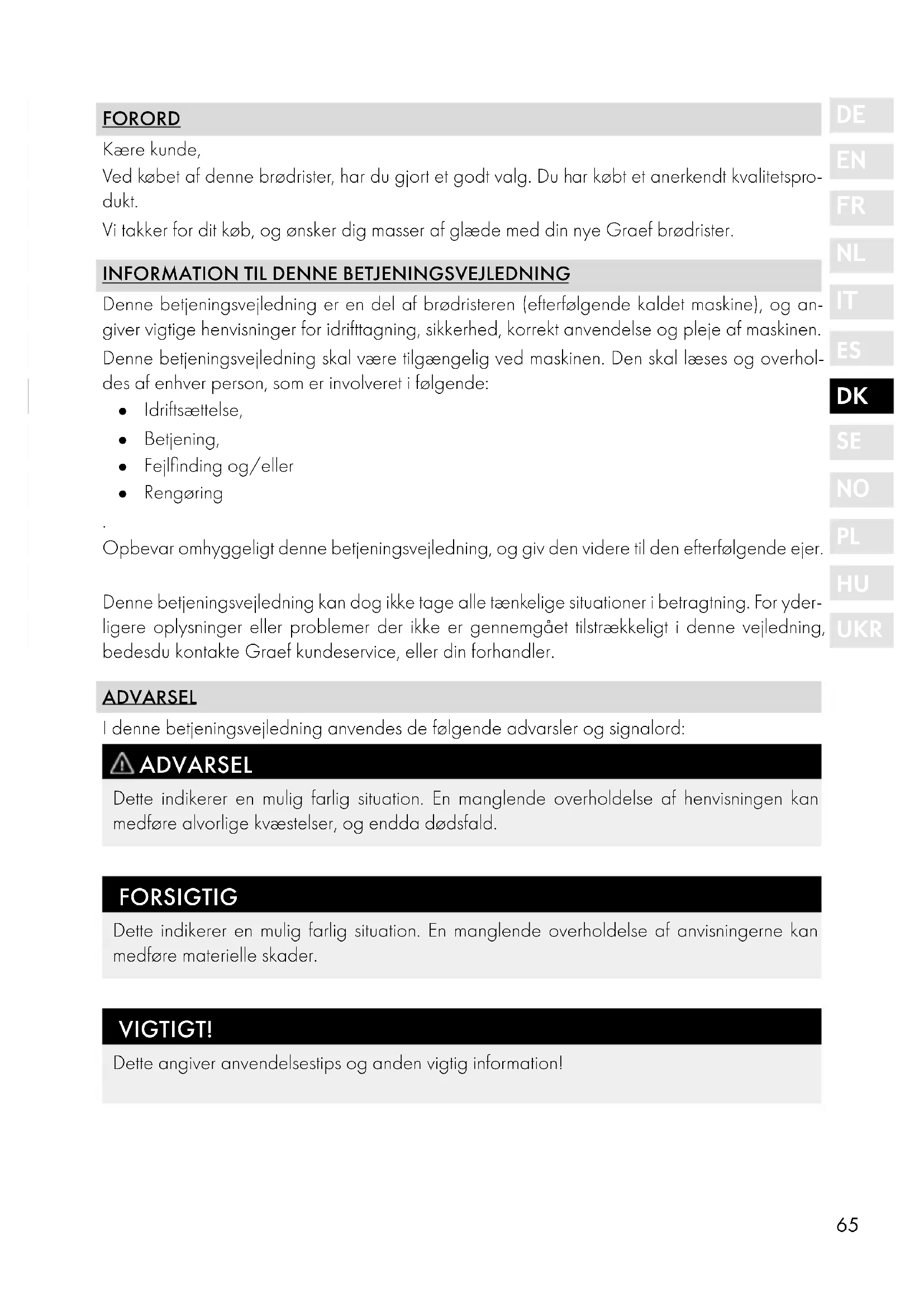 Denne betjeningsvejledning kan dog ikke tage alle taenkelige situationer i betragting. For yderligere oplysninger eller problemer der ikke er gennemgæt tilstrækkeligt i dette vejledning, bedesdu kontakte Graef kundeservice, eller din forhandler.