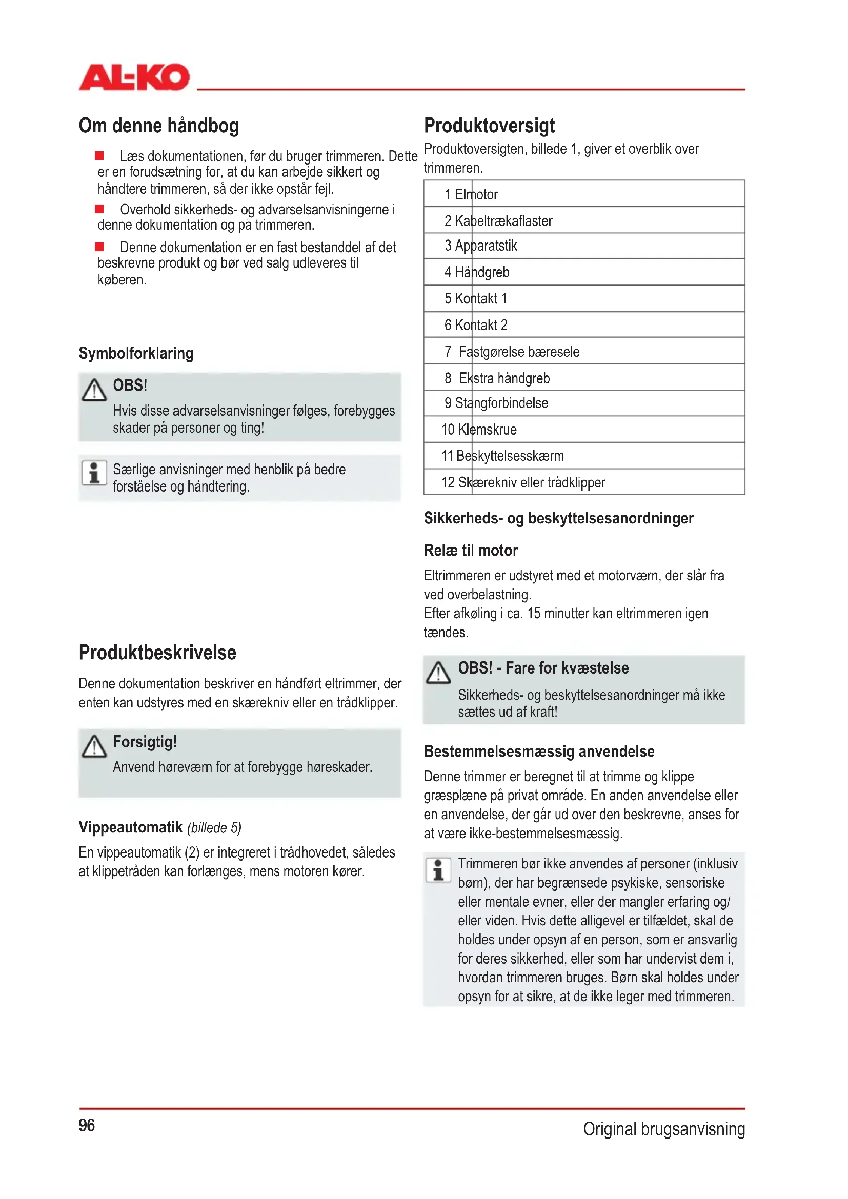 440 488 _c OBS! Trimmeren må ikke bruges i professionelt øjemed. Symbolernes betydning på trimmeren OBS! Læs betjeningsvejledningen Bær beskyttelsesbriller og høreværn Bær beskyttelseshandsker Bær sikkerhedssko Hold andre på afstand. Sikkerhedsafstand min. 10 m Fare ved bortslyngede genstande Tag straks stikket ud, hvis forlængerledningen beskadiges eller overskæres! Beskyt trimmeren mod regn og fugt Afstanden mellem trimmeren og udenforstående skal være på mindst 15 meter Sikkerhedsanvisninger OBS! Klippeværktøjet roterer også, efter at motoren er slukket. Kontroller net- og forlængerledninger for tegn på beskadigelse eller ældning, før trimmeren bruges. Hold forlængerledninger væk fra skæreværktøjet. Hvis ledningen bliver beskadiget under brug, skal den straks tages ud af el-nettet. RØR IKKE VED LEDNINGEN, FØR DEN ER TAGET UD AF EL-NETTET. Bær egnet tøj, øjenbeskyttelse og handsker. Lad aldrig børn eller ikke-instruerede personer bruge eller vedligeholde maskinen. Lokale bestemmelser kan fastsætte brugerens minimumsalder. Afbryd arbejdet med maskinen, når personer - først og fremmest børn - eller husdyr er i nærheden. Slå kun græs ved dagslys eller ved god kunstig belysning. Før brug og efter kollision skal trimmeren kontrolleres for tegn på slitage eller skader, og eventuelle reparationer skal foretages. Brug aldrig trimmeren med beskadigede eller manglende beskyttelsesanordninger. Hold altid hænder og fødder væk fra skæreanordninger, først og fremmest når motoren startes. Der er risiko for at komme til skade ved alle anordninger, der bruges til afskæring tråden. Når en ny tråd er trukket ud, skal maskinen altid holdes i sin normale arbejdsposition, før den tændes. Anvend kun originale reservedele og tilbehør. Træk netstikket ud før kontrol, rengøring eller arbejde på trimmeren, og når den ikke er i brug. Sørg for at luftåbninger er fri for urenheder. På trods af tekniske og supplerende beskyttelsesforanstaltninger vil der altid være en lille risiko ved at arbejde med trimmeren. Hold grebene tørre og rene. Fjern fremmedlegemer i arbejdsområdet. Brug kun trimmeren i teknisk fejlfri stand. Hold altid beskyttelsesskærmen, trådhovedet og motoren fri for rester af afklip. Hold krop og tøj væk fra klippeværket. Personer, der ikke er godt inde i, hvordan trimmeren betjenes, skal øve sig på at bruge den, mens motoren er slukket. Bær egnet arbejdstøj.98 Original brugsanvisning Sørg for sikkert fodfæste, når du arbejder med trimmeren. Betjen altid trimmeren med begge hænder. Hold andre ud af fareområdet. Efterlad ikke trimmeren uden opsyn. Stå altid neden for skæreværket, når du arbejder på skråninger. Når du arbejder på skråninger: Arbejd aldrig på glatte og fedtede skråninger. Sørg altid for sikkert fodfæste. Klip altid på tværs af skråninger, aldrig op- eller nedad. Arbejd ikke på skråninger, der hælder mere end 10°! Vær særlig forsigtig, når du vender dig med trimmeren! Efter kollision med fremmedlegeme: Sluk for motoren. Kontroller trimmeren for skader. Betjen aldrig trimmeren, hvis du er påvirket af alkohol, narkotika eller medicin. Forskrifterne til forebyggelse af uheld skal overholdes. Elektrisk sikkerhed Forsigtig! Fare ved berøring af strømførende dele! Tag straks stikket ud, hvis forlængerledningen beskadiges eller overskæres! Vi anbefaler tilslutning via en HFI-afbryder med en nominel fejlstrøm på < 30 mA. Netspændingen i huset skal stemme overens med angivelserne om netspænding i Tekniske data. Ingen anden forsyningsspænding må anvendes. Brug kun forlængerledninger, der er beregnet til udendørs brug - min. tværsnit 1,5 mm